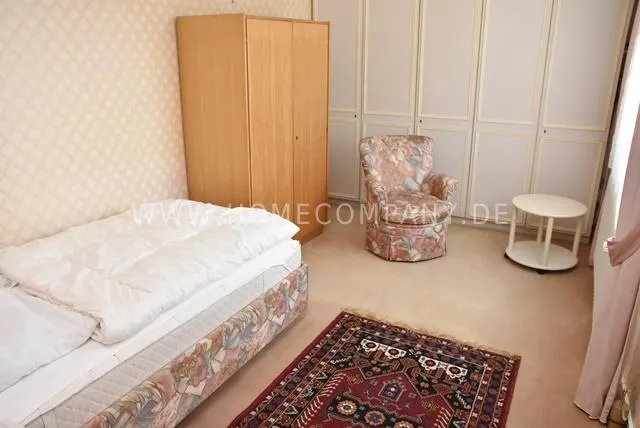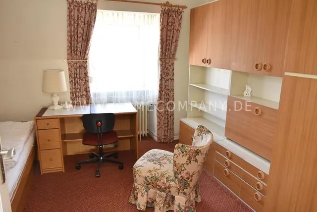 Bedroom with bed 100x200 cm, wardrobe, armchair, small table.