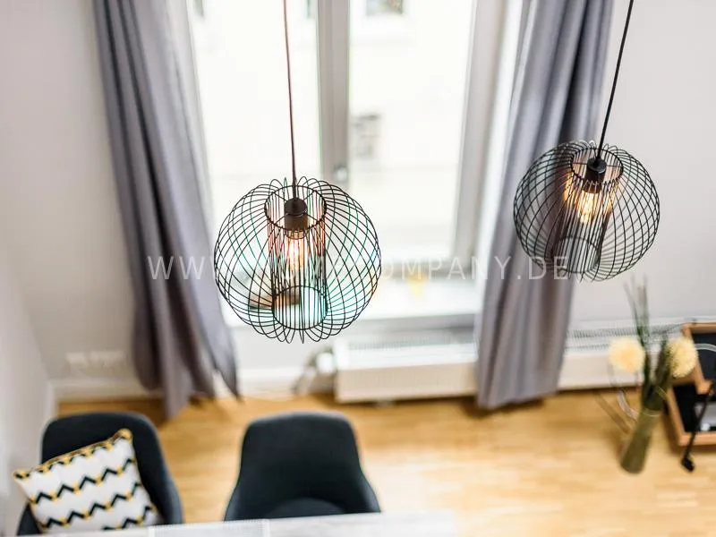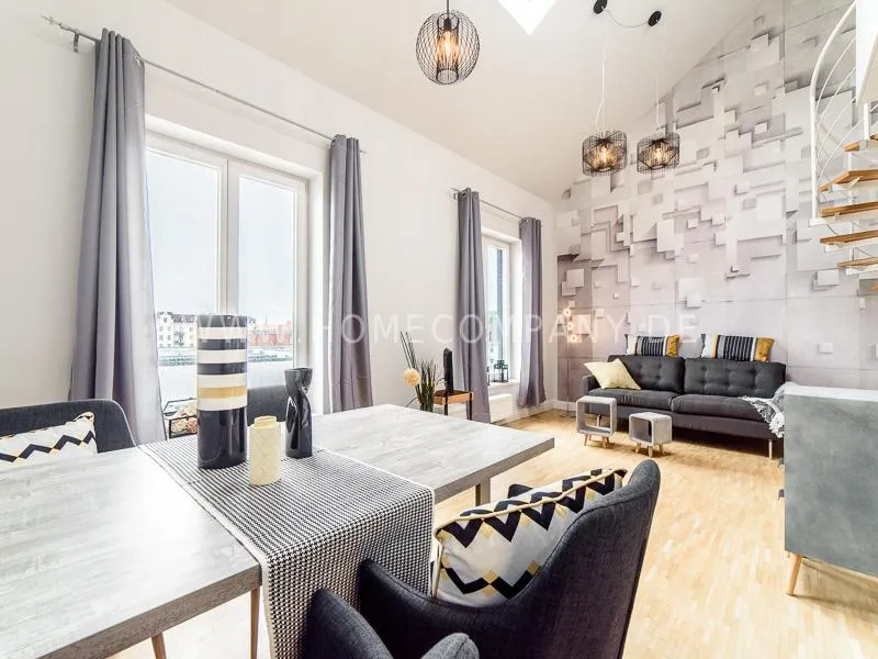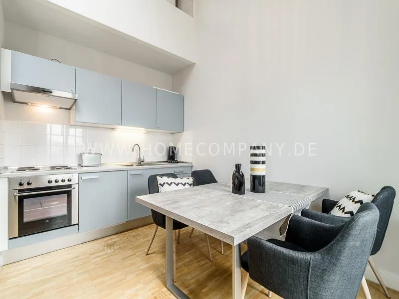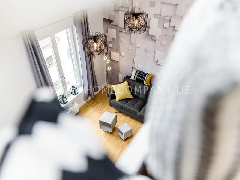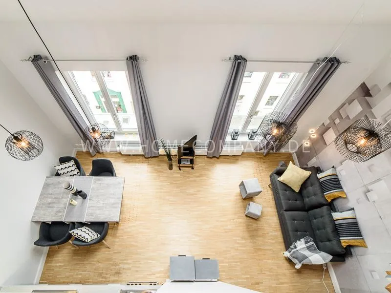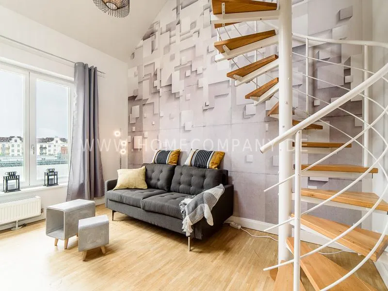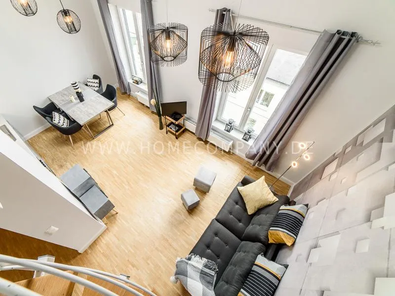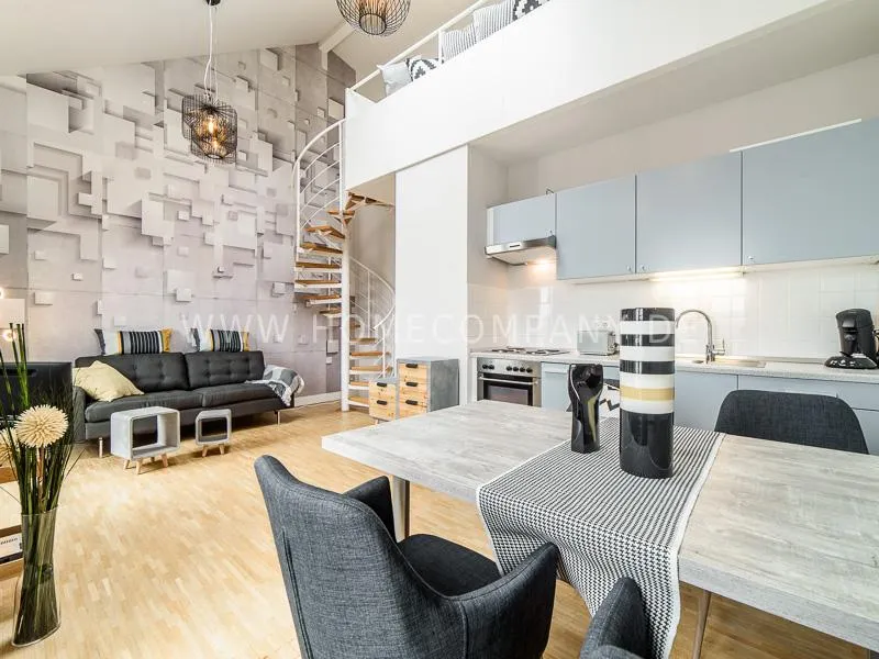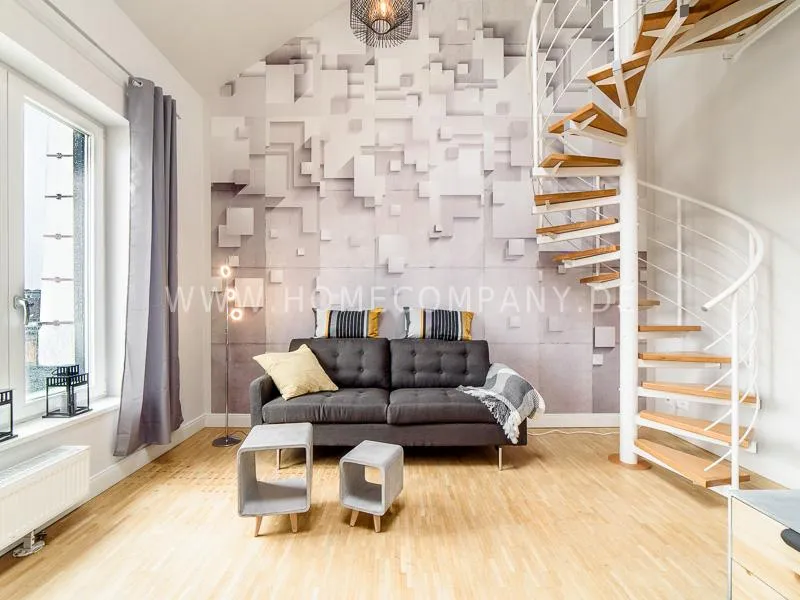 Furnished apartment on 2 levels with oak parquet floor. The light-flooded, open-plan kitchen and living area has a floor space of approx. 5 meters. This particular atmosphere is further reinforced by the wall design and by furniture made of concrete and wood. Modern accessories and lamps with individual design selected with attention to detail complete the overall impression. In the upper area leads a spiral staircase, where the gallery and the bedroom with comfortable 1.60m wide boxspring bed and another storage room.