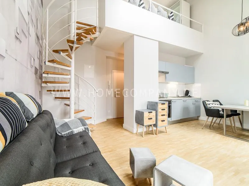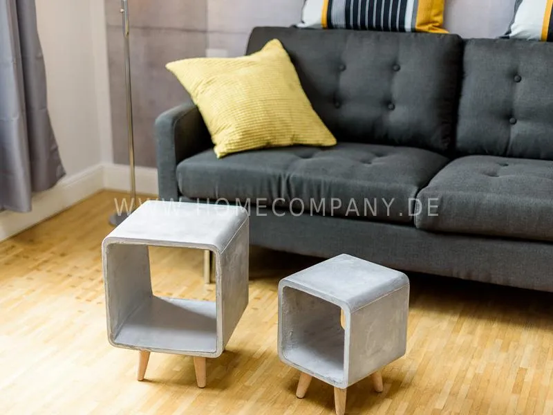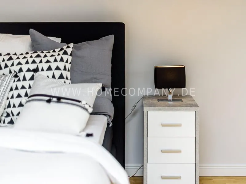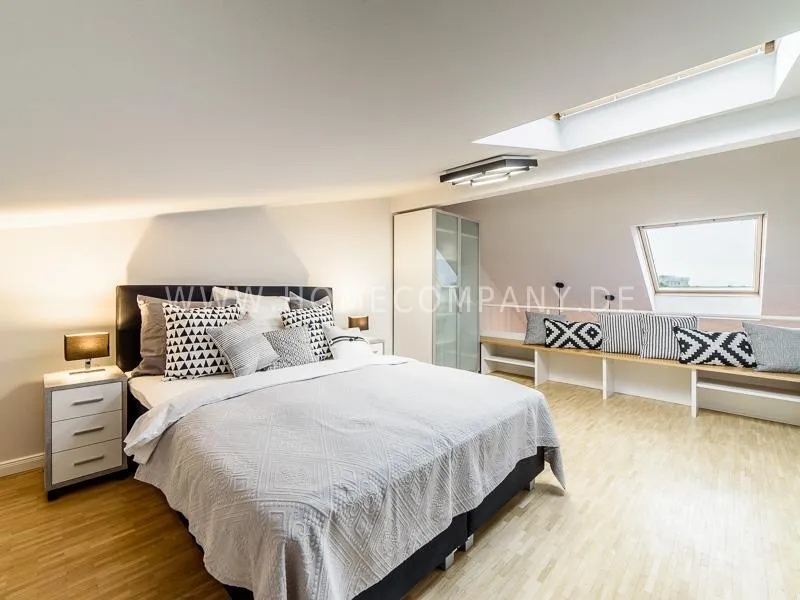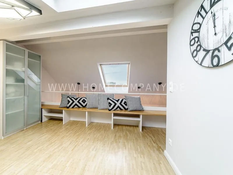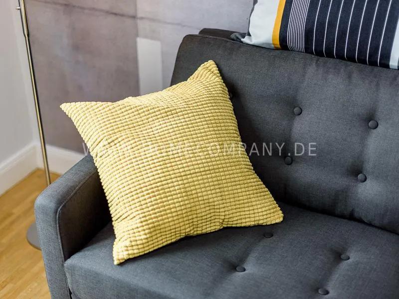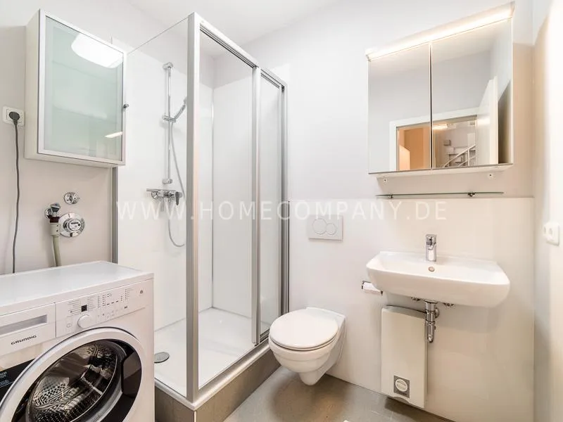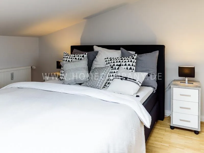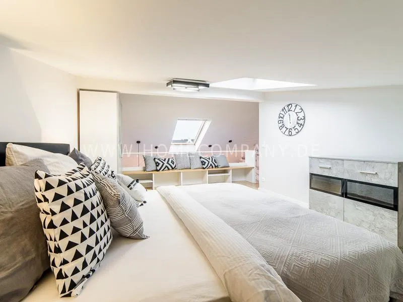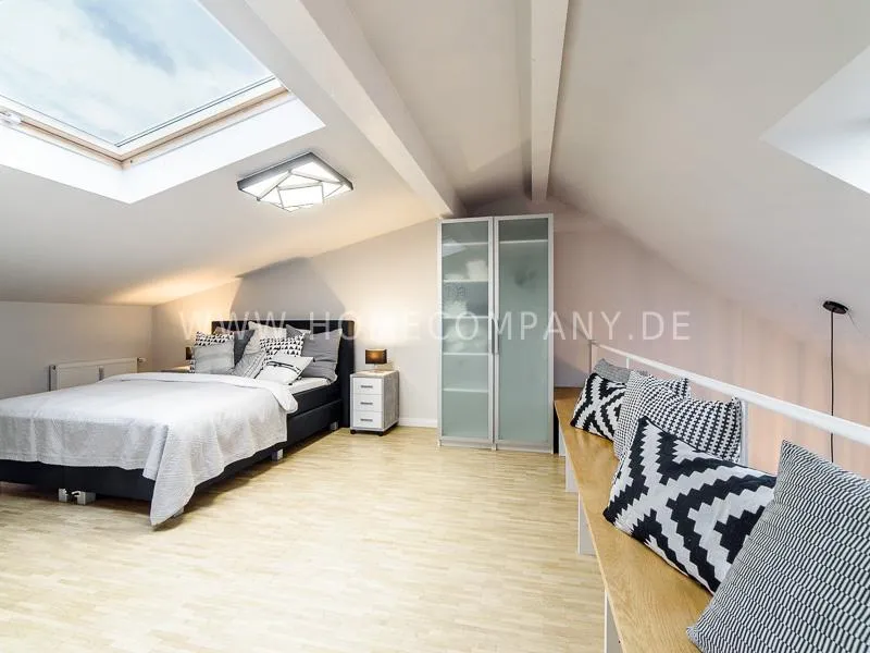 Furnished apartment on 2 levels with oak parquet floor. The light-flooded, open-plan kitchen and living area has a floor space of approx. 5 meters. This particular atmosphere is further reinforced by the wall design and by furniture made of concrete and wood. Modern accessories and lamps with individual design selected with attention to detail complete the overall impression. In the upper area leads a spiral staircase, where the gallery and the bedroom with comfortable 1.60m wide boxspring bed and another storage room.