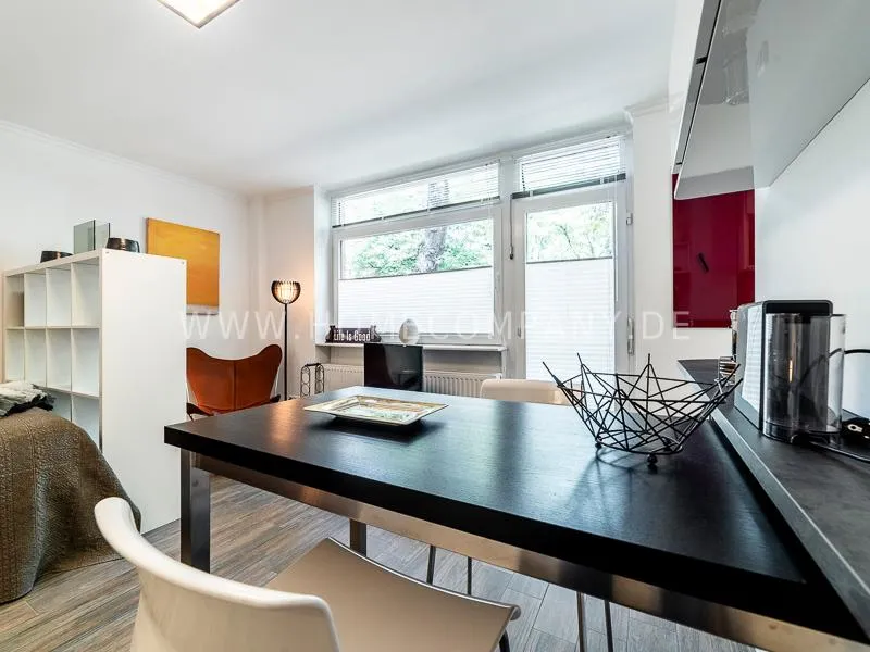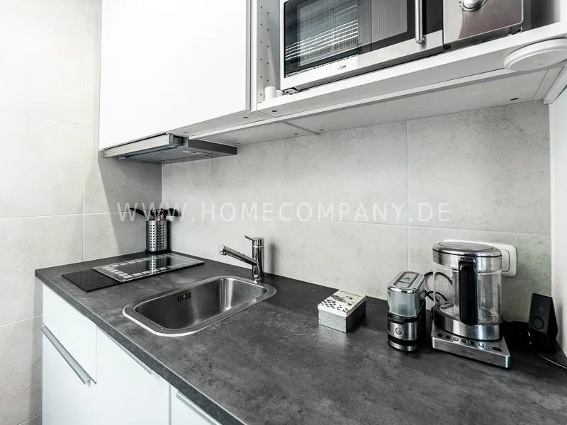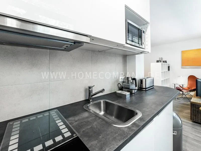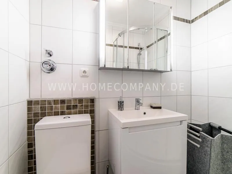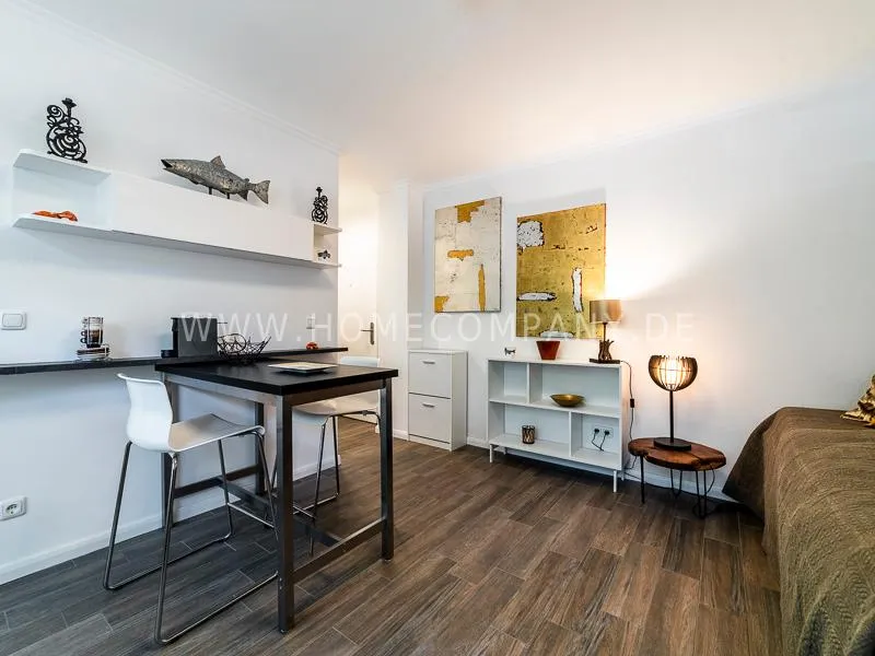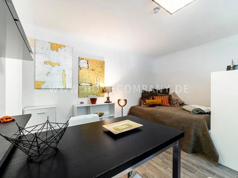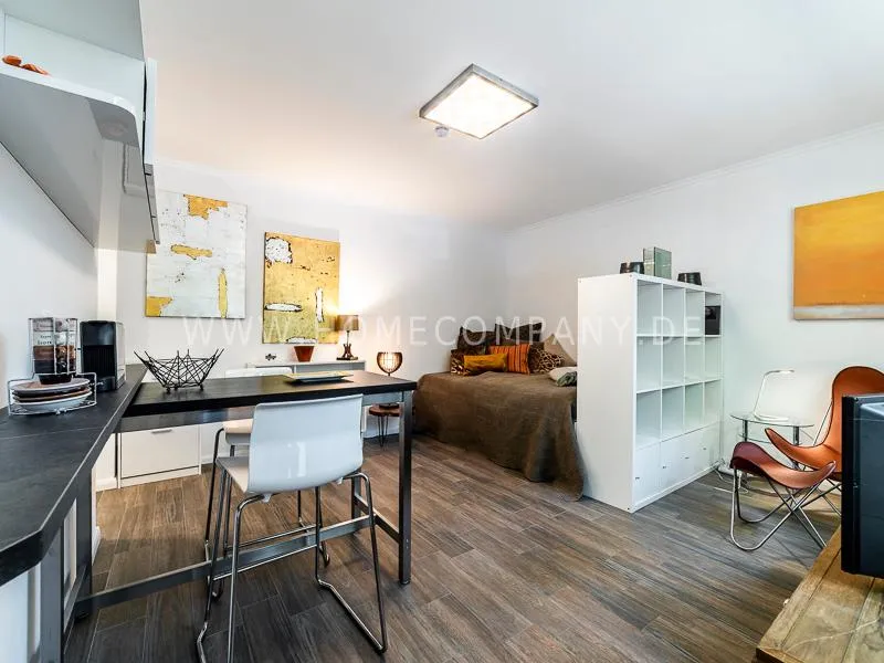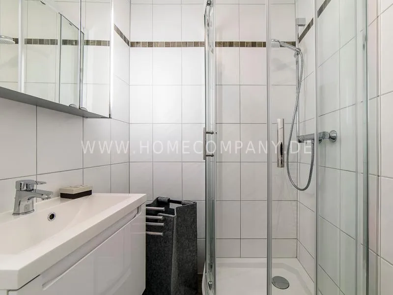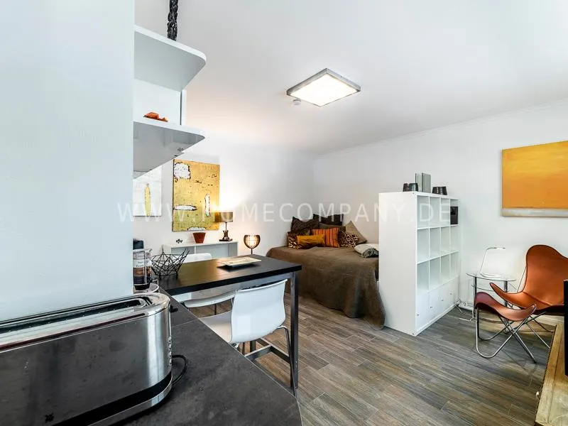 In a beautifully designed residential street, optimally equipped apartment with an open plan layout and modern furniture. The open kitchen to the living area is perfectly equipped for the business tenant. A comfortable counter forms the perfect transition to the living space. In addition to the 1.40-wide bed, a cozy armchair invites you to linger after work. The shower room is designed in combination of white tiles and beige brown mosaic tiles. The shower cabin fits in as a harmonious quarter round. The sliding door offers a beautiful large mirror surface towards the hallway. The laundromat is located in the well-kept laundry room in the basement of the house. In the street there are plenty of parking spaces.