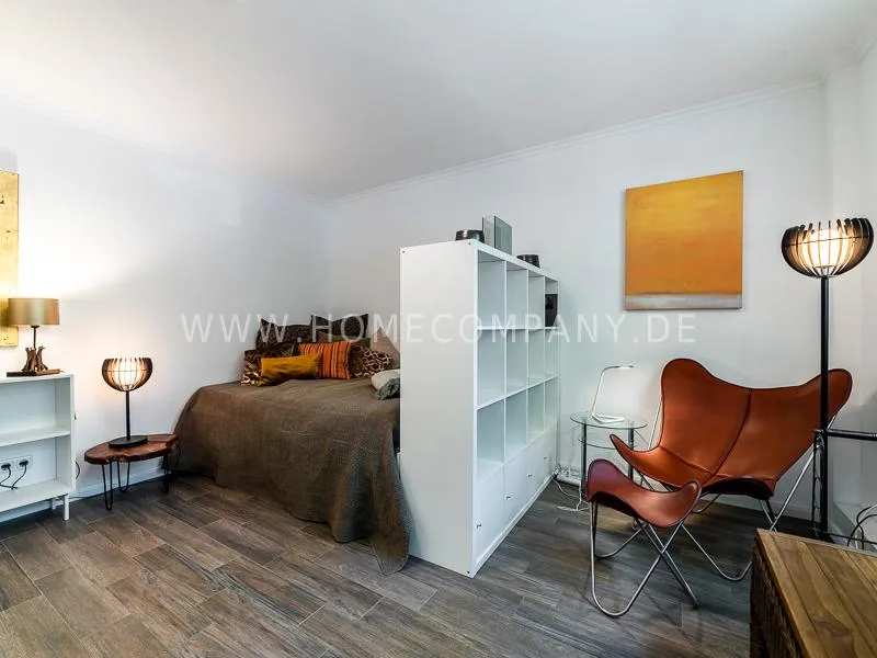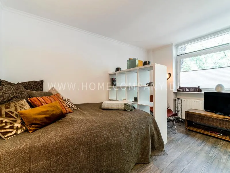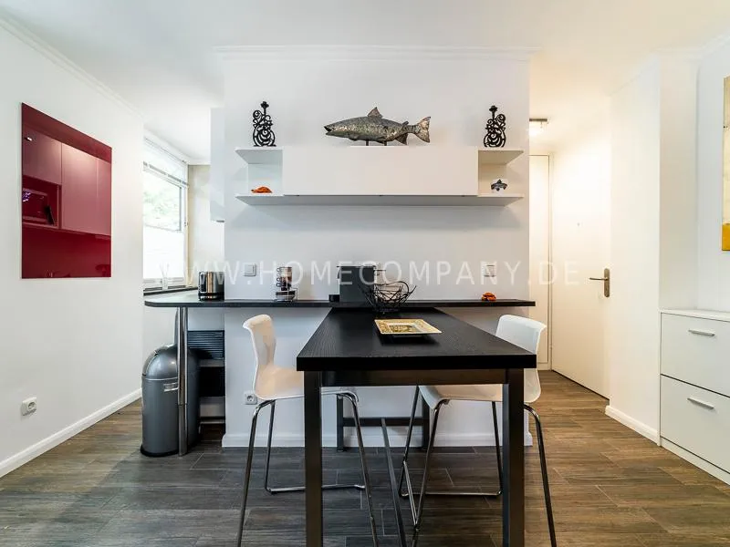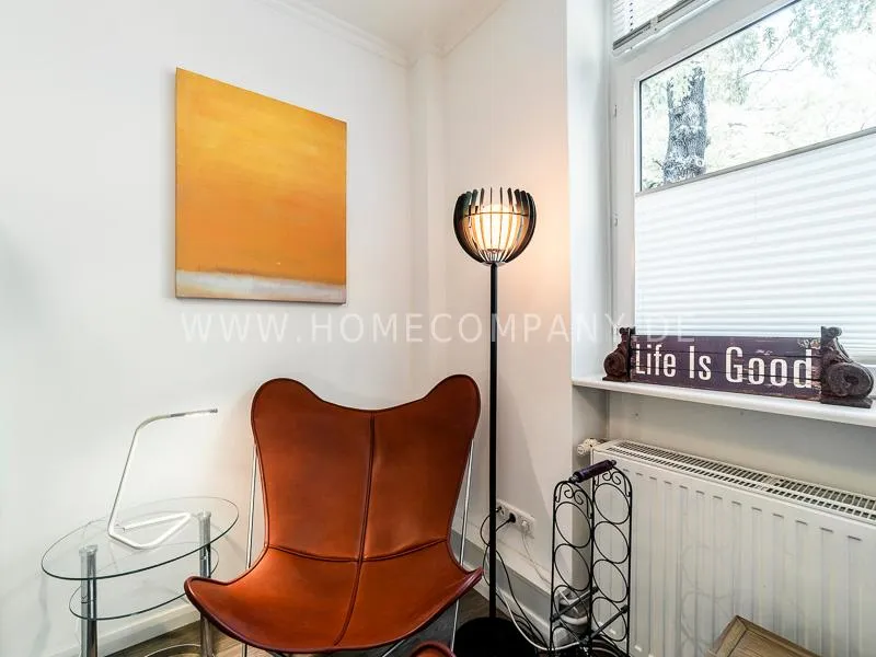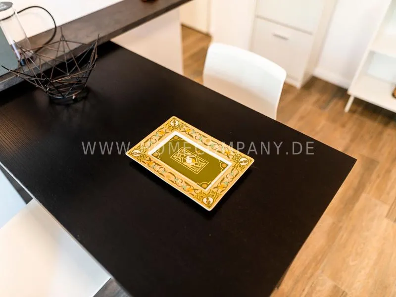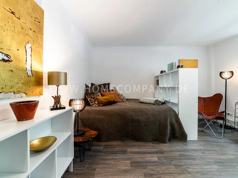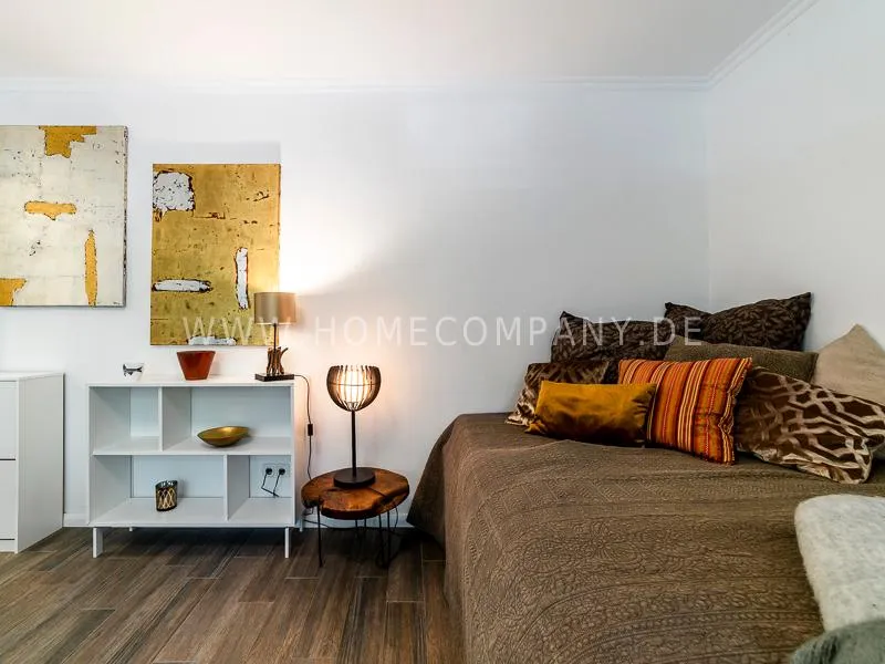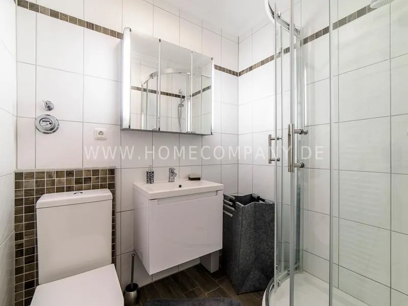 In a beautifully designed residential street, optimally equipped apartment with an open plan layout and modern furniture. The open kitchen to the living area is perfectly equipped for the business tenant. A comfortable counter forms the perfect transition to the living space. In addition to the 1.40-wide bed, a cozy armchair invites you to linger after work. The shower room is designed in combination of white tiles and beige brown mosaic tiles. The shower cabin fits in as a harmonious quarter round. The sliding door offers a beautiful large mirror surface towards the hallway. The laundromat is located in the well-kept laundry room in the basement of the house. In the street there are plenty of parking spaces.