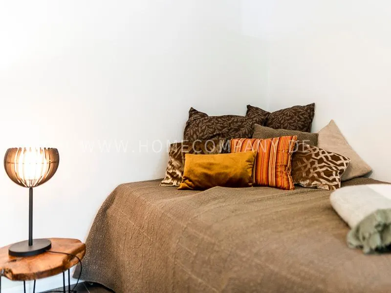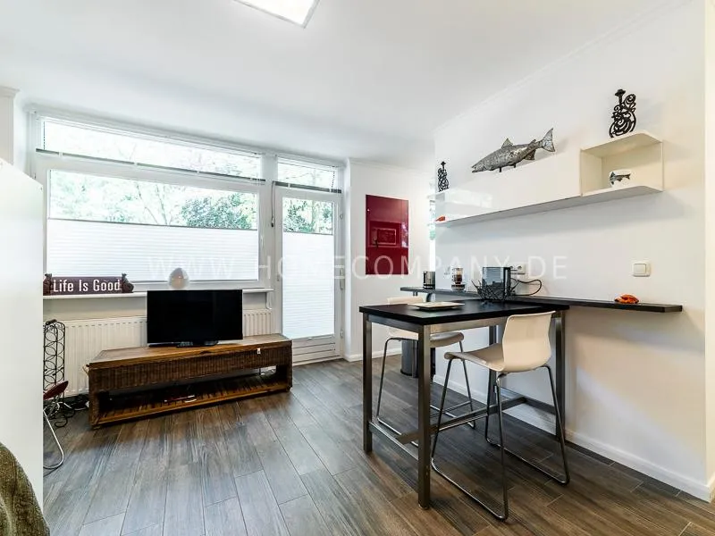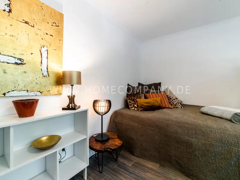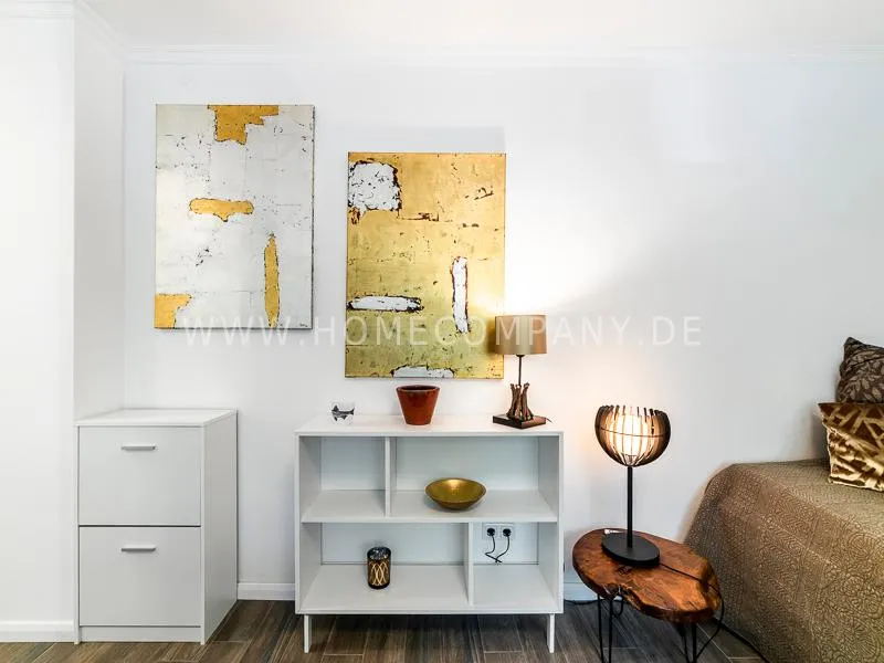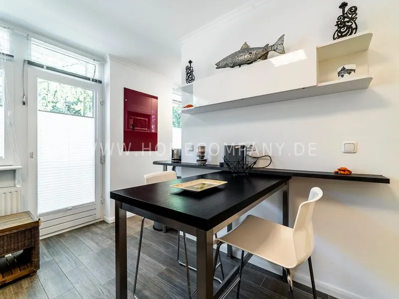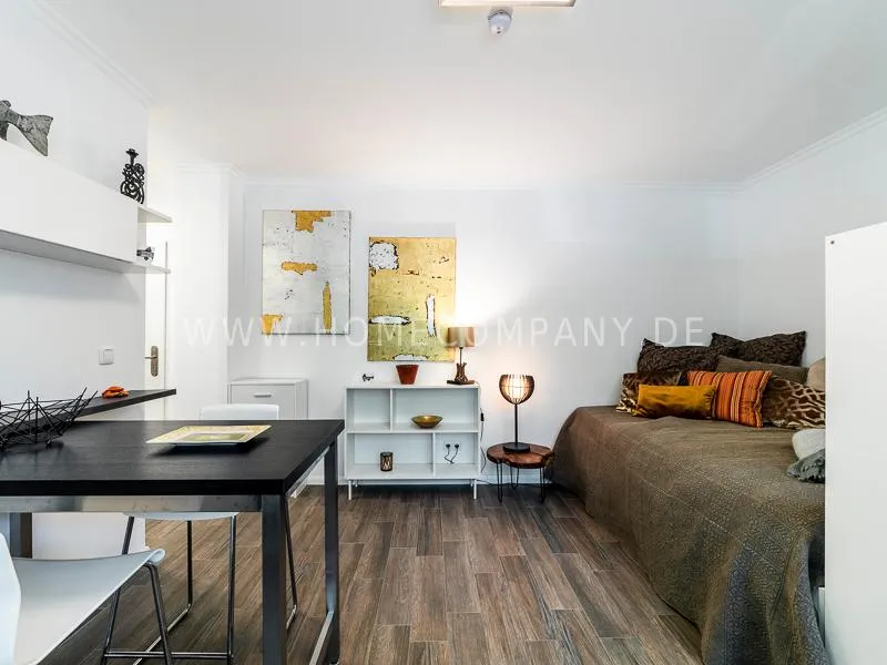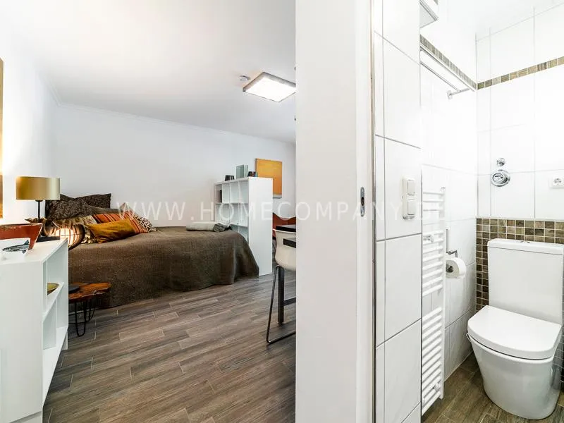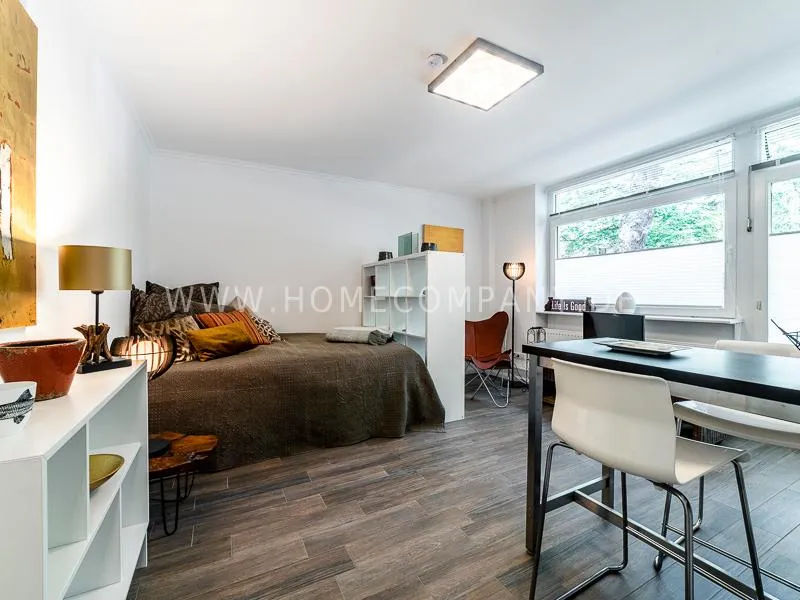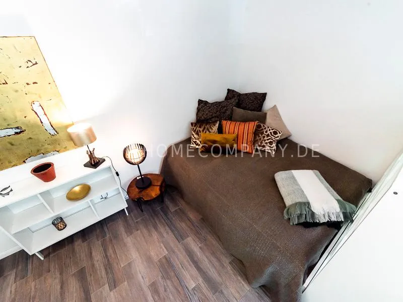 In a beautifully designed residential street, optimally equipped apartment with an open plan layout and modern furniture. The open kitchen to the living area is perfectly equipped for the business tenant. A comfortable counter forms the perfect transition to the living space. In addition to the 1.40-wide bed, a cozy armchair invites you to linger after work. The shower room is designed in combination of white tiles and beige brown mosaic tiles. The shower cabin fits in as a harmonious quarter round. The sliding door offers a beautiful large mirror surface towards the hallway. The laundromat is located in the well-kept laundry room in the basement of the house. In the street there are plenty of parking spaces.