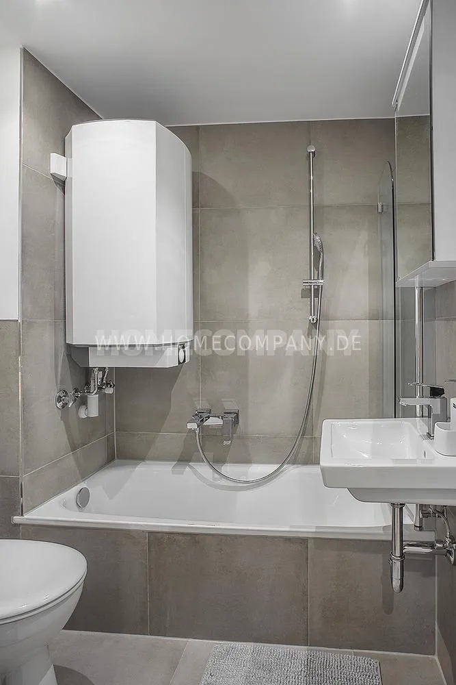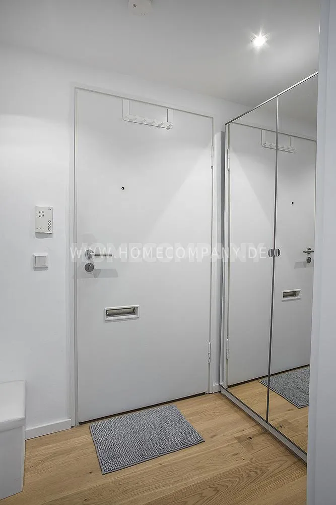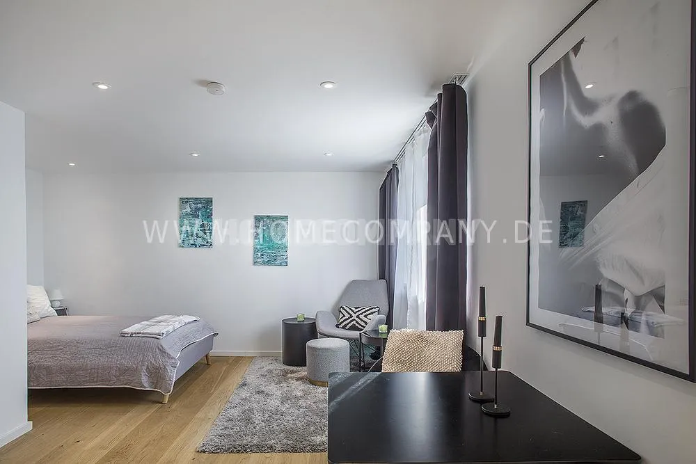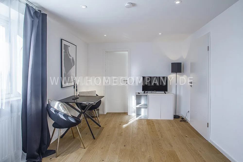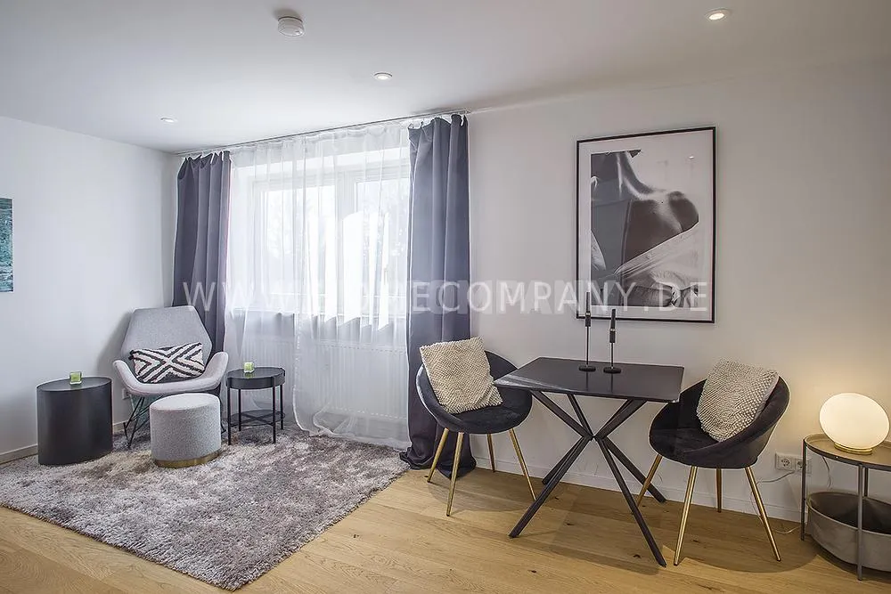 Modern furnished 1 room apartment in Sendling. Quiet location in close proximity to the Westpark. Entrance area with closet; from here access to the bathroom and the living/sleeping area. The bathroom has a bathtub with glass shower wall. The living/sleeping area is furnished with double bed (1.40x2.00) and dining area for 2 persons. Separate daylight kitchen. It is fully equipped with everything you need daily, e.g. dishwasher, washer-dryer combination and various kitchen utensils. The apartment impresses not only by the great floor plan, but also by the quiet, but well connected location.