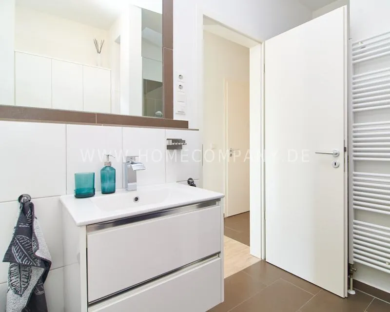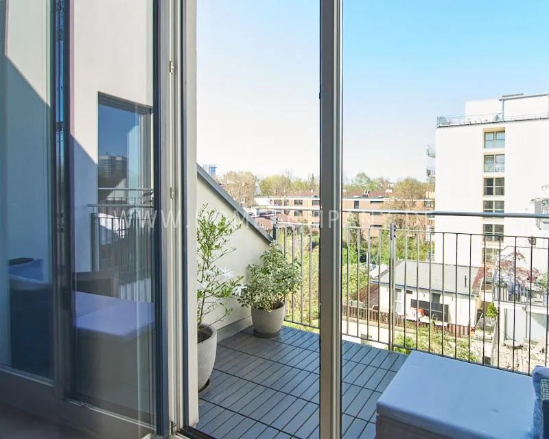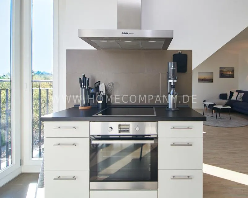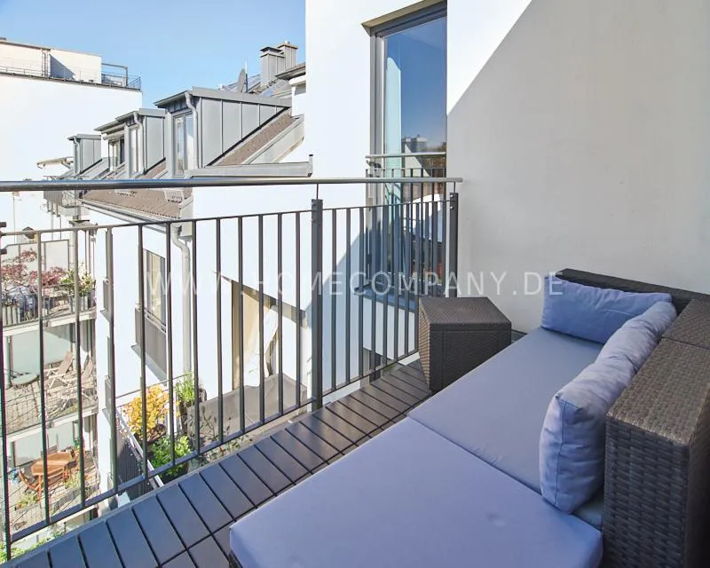 Particularly noteworthy is the virtually invisible living situation with unobstructed views on both sides: The living and kitchen areas offer a wide view over the verdant Elsa Park. The sunny, southwest-facing balcony is at roof level and offers unobstructed views of the adjacent courtyards and gardens.