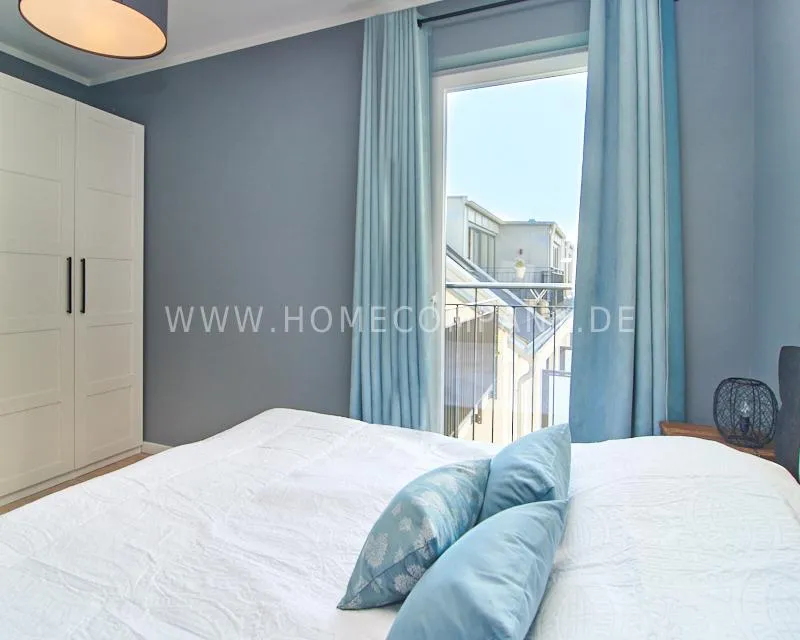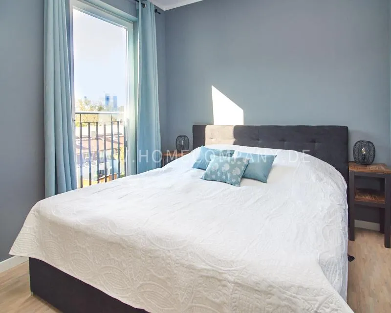 Bedroom 1 has a comfortable box-spring bed (180x200cm), a spacious wardrobe, and a French balcony, which provides plenty of light and a pleasant atmosphere.