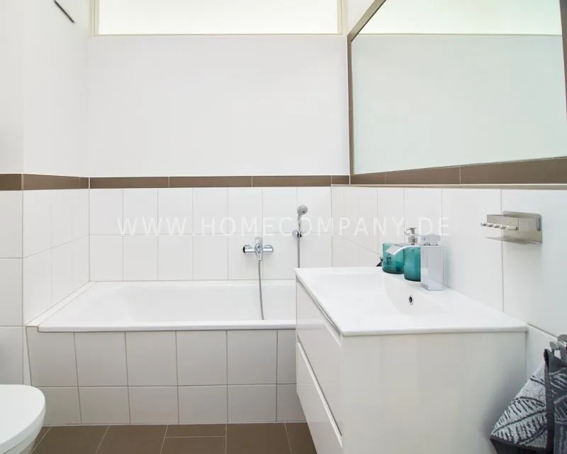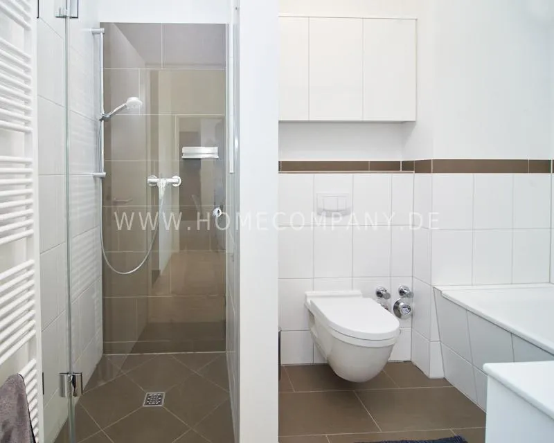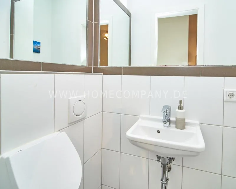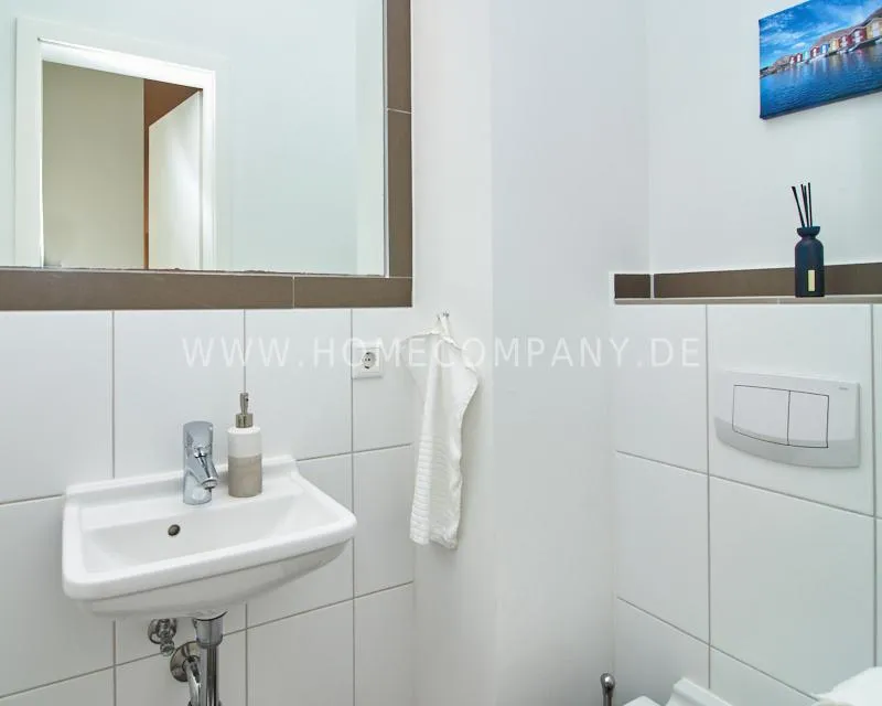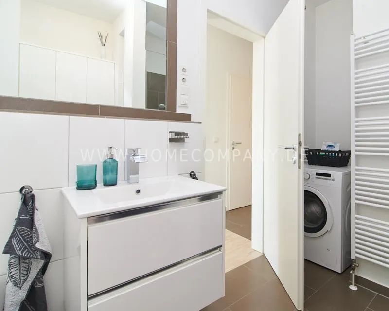 The bathroom is equipped with a walk-in shower, a bathtub, and a cleverly integrated niche for the washing machine. A modern guest toilet with a sink and urinal completes the bathroom amenities.