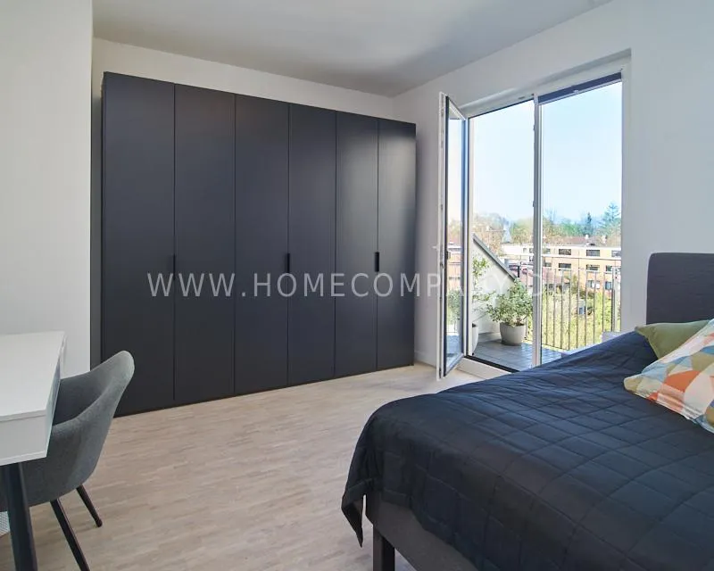 Bedroom 2 is furnished with a box spring bed (140x200cm), a desk, and a large wardrobe – ideal as a guest room or home office. From here, you have direct access to the sunny balcony with a beautiful view of the green surroundings.