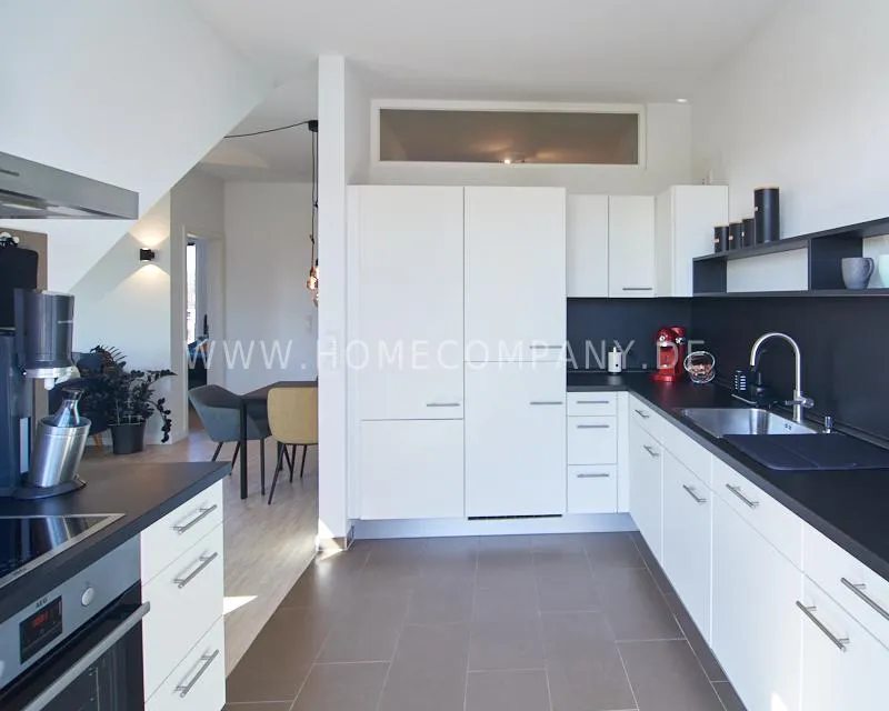 The apartment itself is located on the top floor and impresses with its open, modern design, underfloor heating, large glass surfaces, a ceiling height of 2.80 meters, and natural light from several directions. The resulting brightness and spaciousness give the apartment a particularly prestigious character.