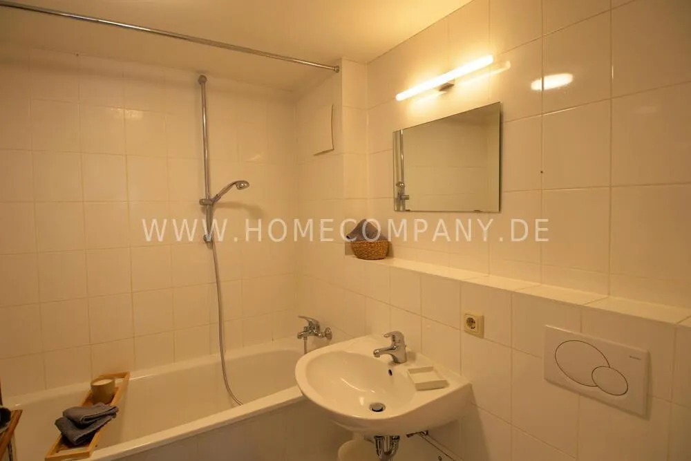 The apartment is in a quiet area, but still in close proximity to the city center. The apartment is very light and airy. The bedroom has a large double bed, work area and wardrobe. Tiled bathroom with bathtub.
