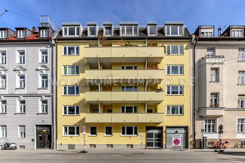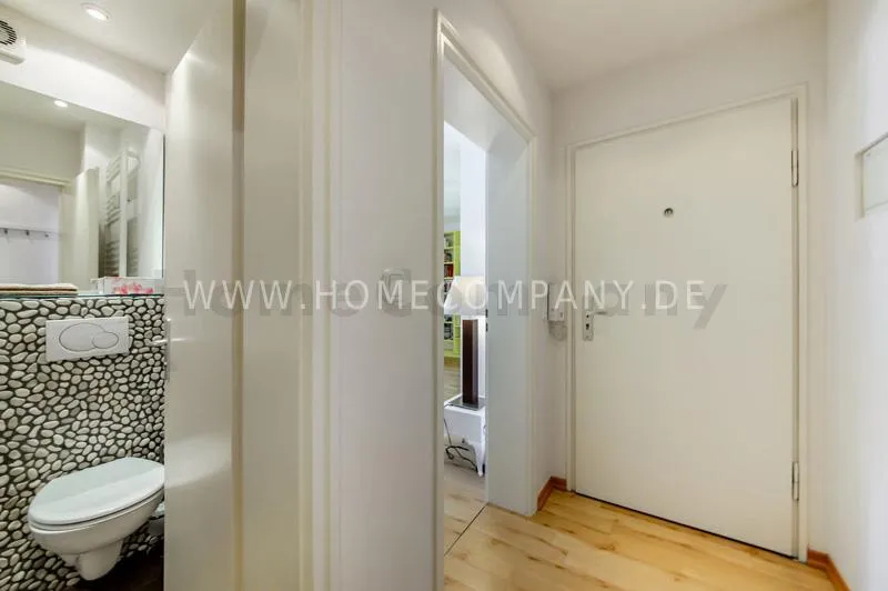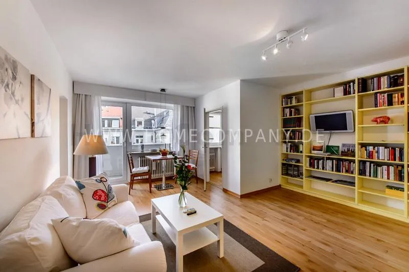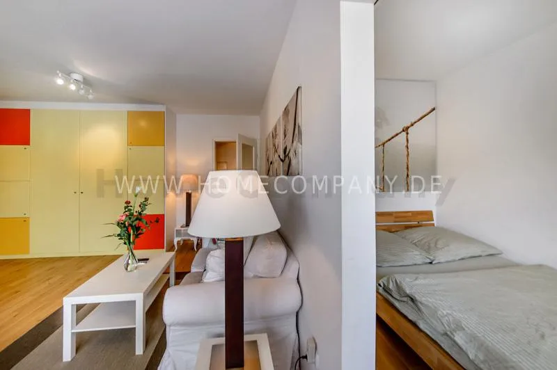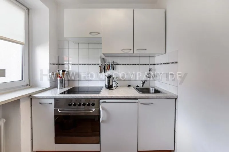 Modernly furnished 1.5 room apartment with balcony in the Westend. 4th floor with elevator.Spacious living room with sofa, dining space for up to 2 persons and built-in shelf-system. The sleeping area is separated by a wall. The separate kitchen with window is very well equipped with everything you need daily. The modern, white tiled bathroom has a bathtub with glass shower partition.