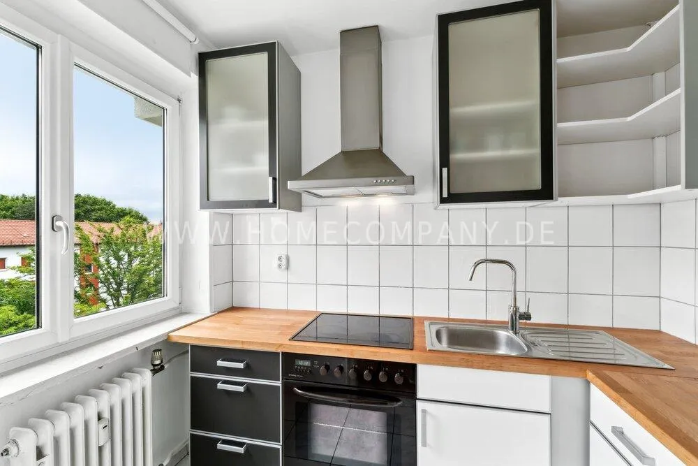 The property has a separate kitchen with window, a large bathroom with bathtub and washing machine, (optional) a parking space in the basement.