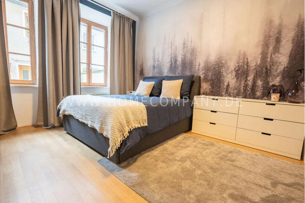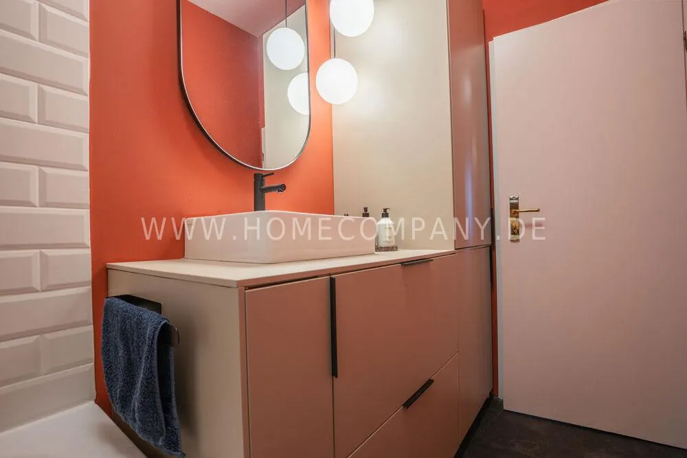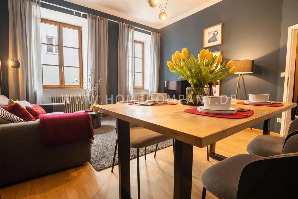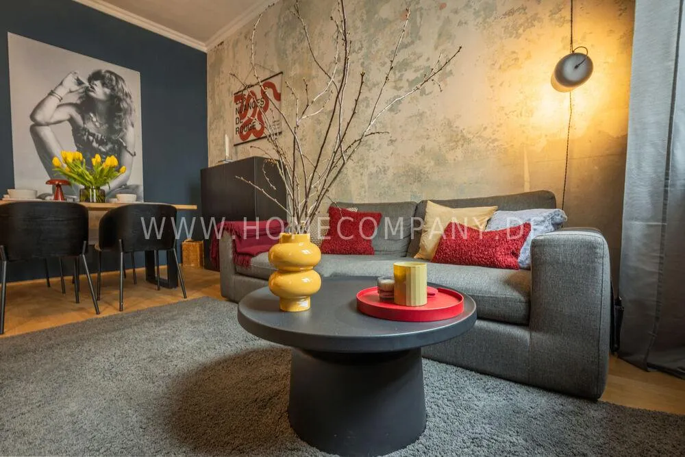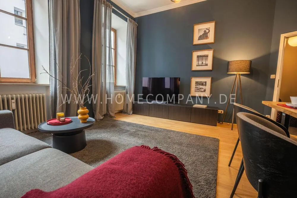 This absolutely aesthetic and stylishly furnished two-room period apartment is located in a well-maintained turn-of-the-century building in Munich’s popular Westend district. Offering approx. 60 m² of living space, the apartment impresses with generous room proportions, classic ceiling heights of over 3 meters, and a clean, urban interior design concept. Situated on the raised ground floor, the apartment features a separate living room and bedroom, a fully equipped kitchen, and a modern bathroom.