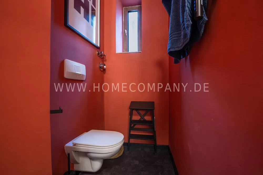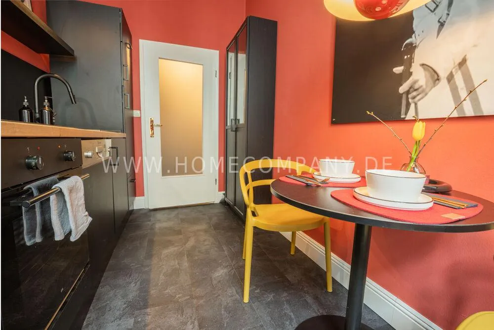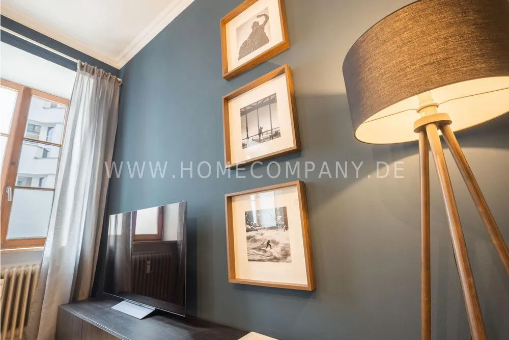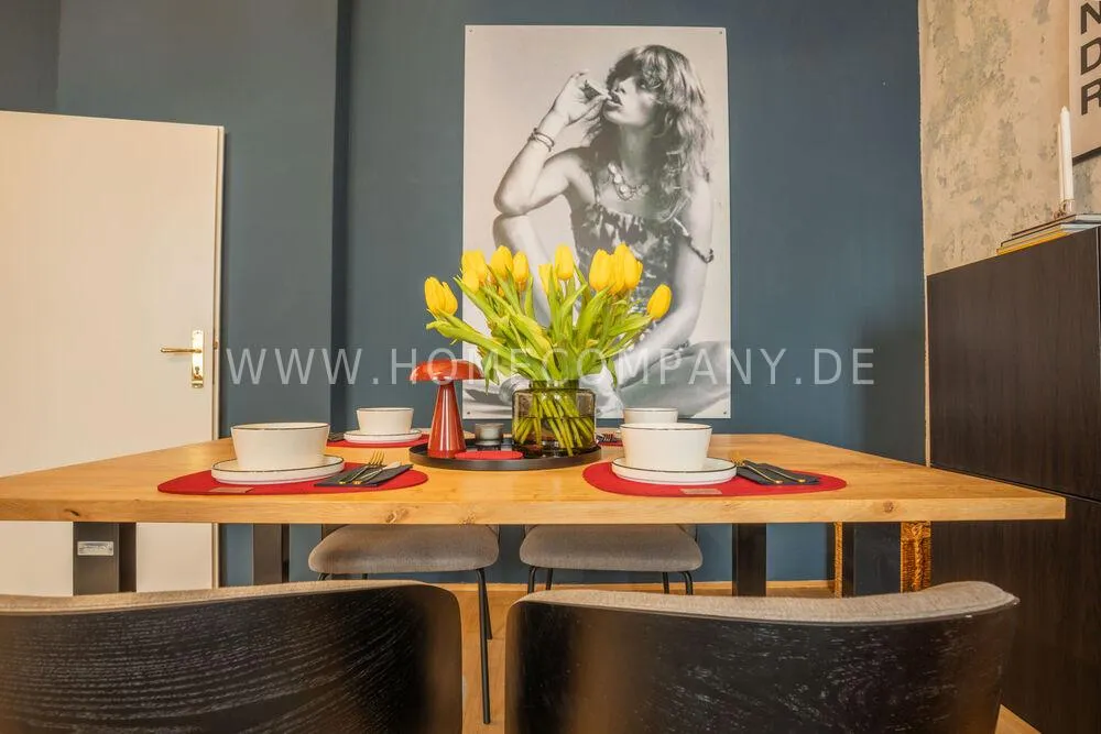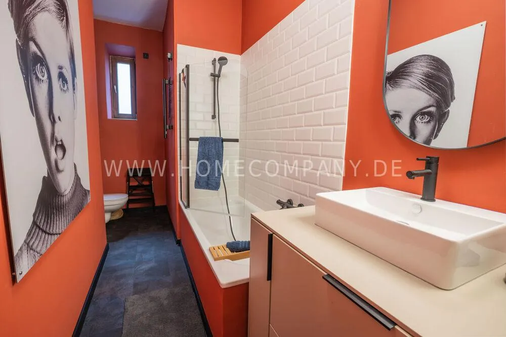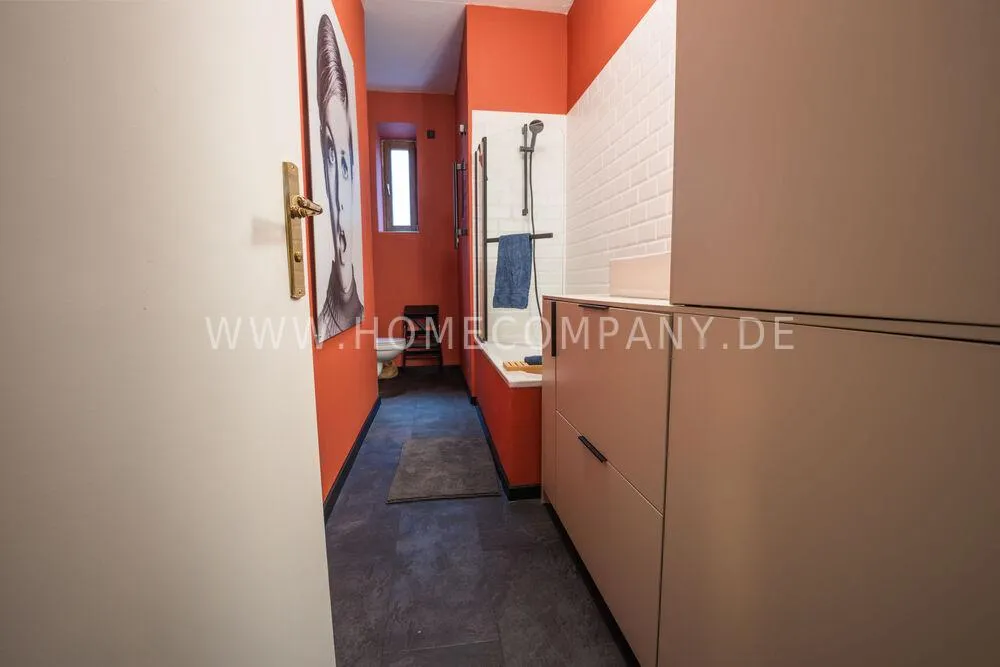 This absolutely aesthetic and stylishly furnished two-room period apartment is located in a well-maintained turn-of-the-century building in Munich’s popular Westend district. Offering approx. 60 m² of living space, the apartment impresses with generous room proportions, classic ceiling heights of over 3 meters, and a clean, urban interior design concept. Situated on the raised ground floor, the apartment features a separate living room and bedroom, a fully equipped kitchen, and a modern bathroom.
