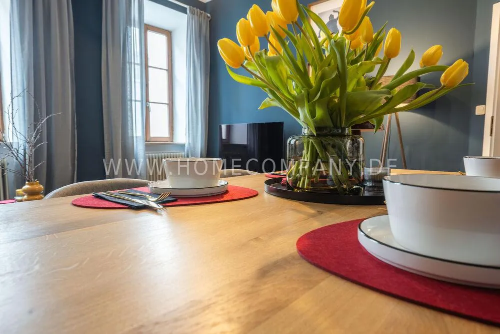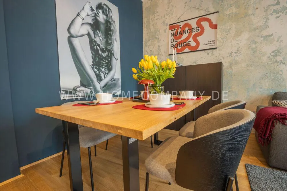 The bright living room is tastefully furnished with a comfortable sofa, a table with chairs, and a Smart TV, making it ideal for both relaxing and working from home. The stylish interior is complemented by a Hue lighting system installed in several rooms, allowing for individually adjustable lighting moods. The quietly located bedroom is equipped with a 160 × 200 cm bed and spacious wardrobes, offering ample storage and a comfortable retreat. The high-quality furnishings further emphasize the apartment’s refined overall character.