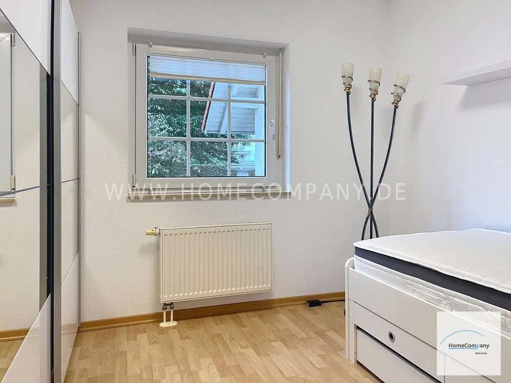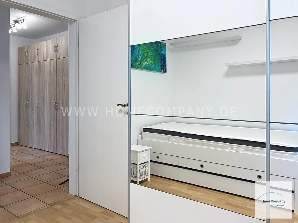 Bright living room with a cozy corner sofa and TV, quiet bedroom with a large wardrobe.