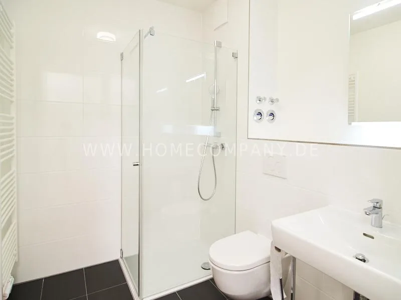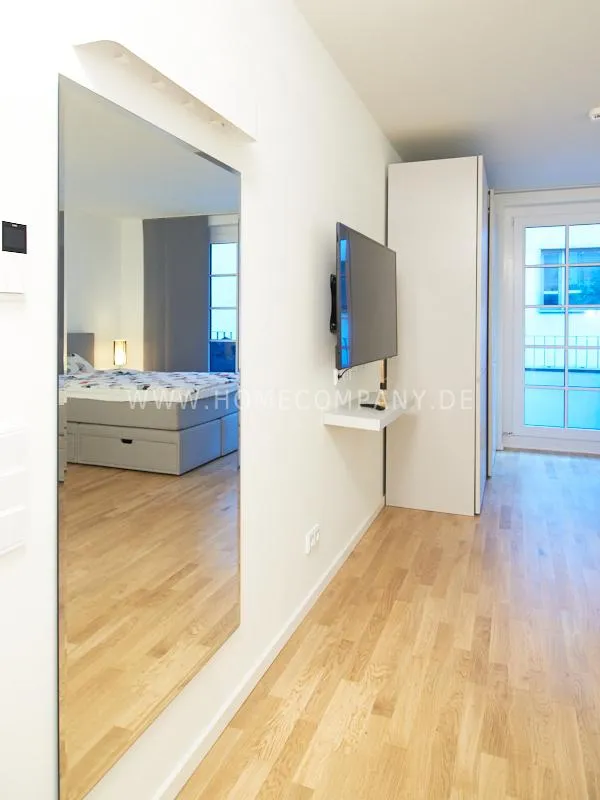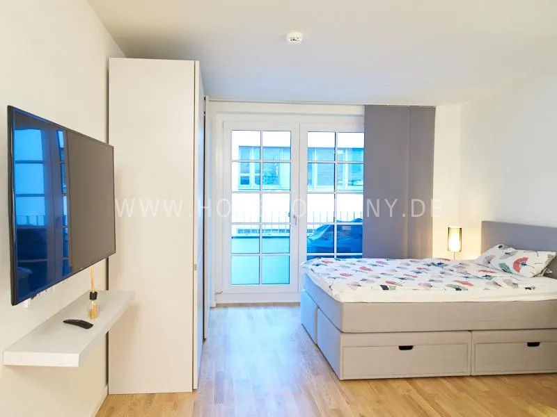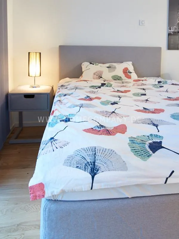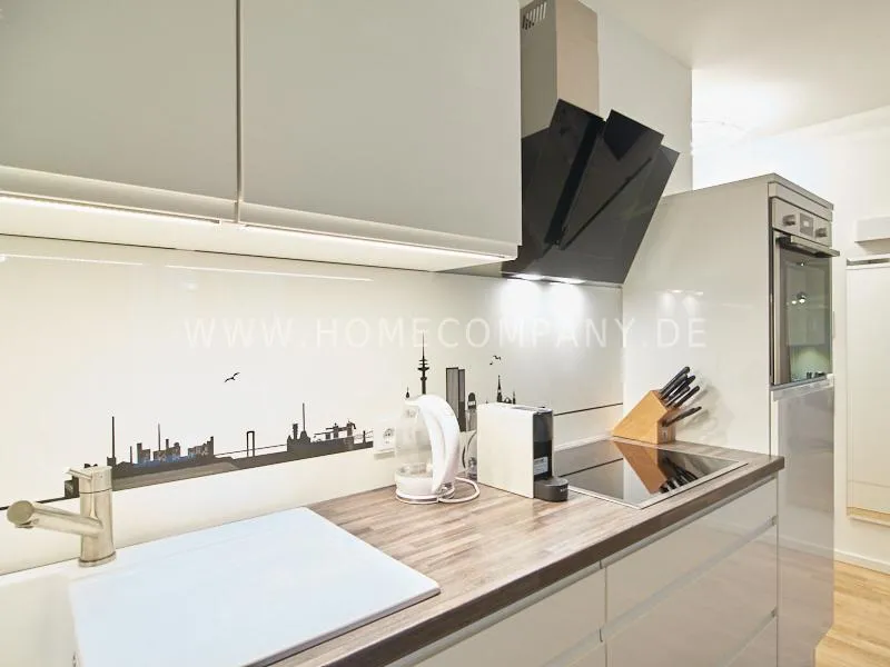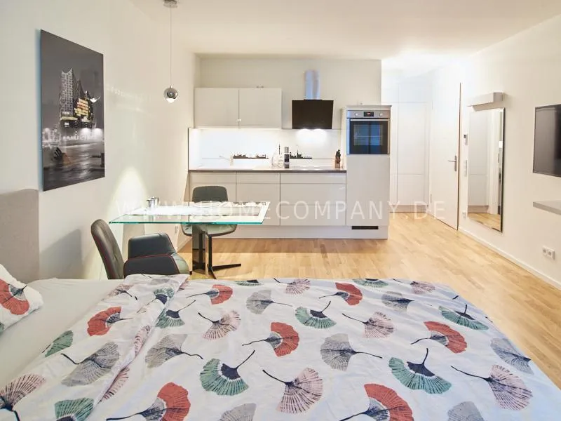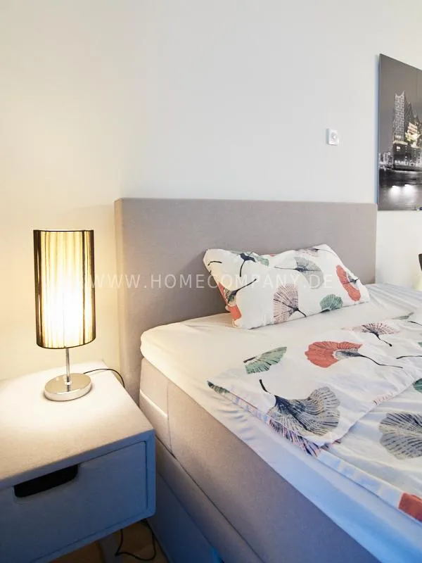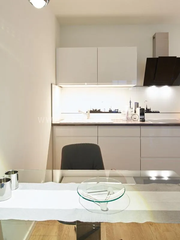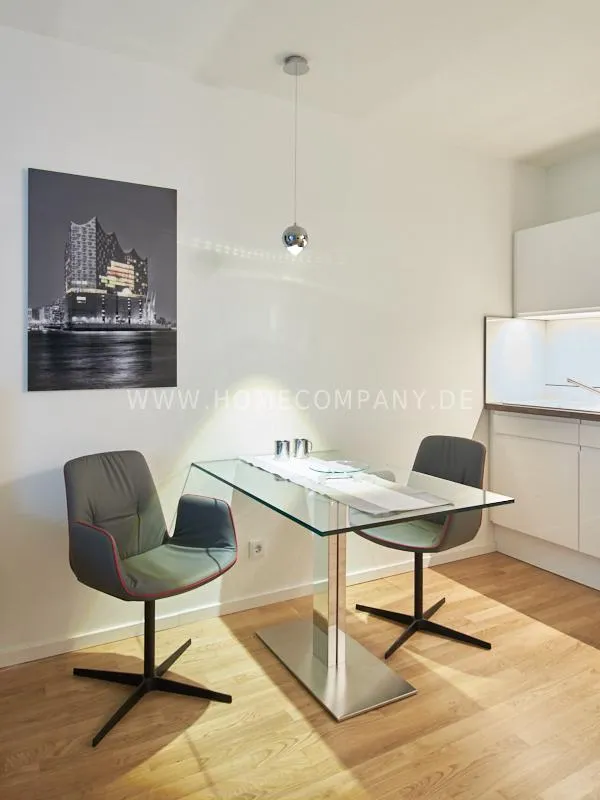Adjacent to the kitchen is a small dining area with a modern glass table. The apartment is equipped with a 1.40 wide box spring bed. Ample storage space is available in the large sliding door wardrobe. A special highligt is the only used by the house community roof terrace. Here you can enjoy long panoramic views over Hamburg on long summer evenings. Many Hamburg landmarks, such as the Michel, the "Tanzende Türme", the Elbphilharmonie and the harbor are in the picture.