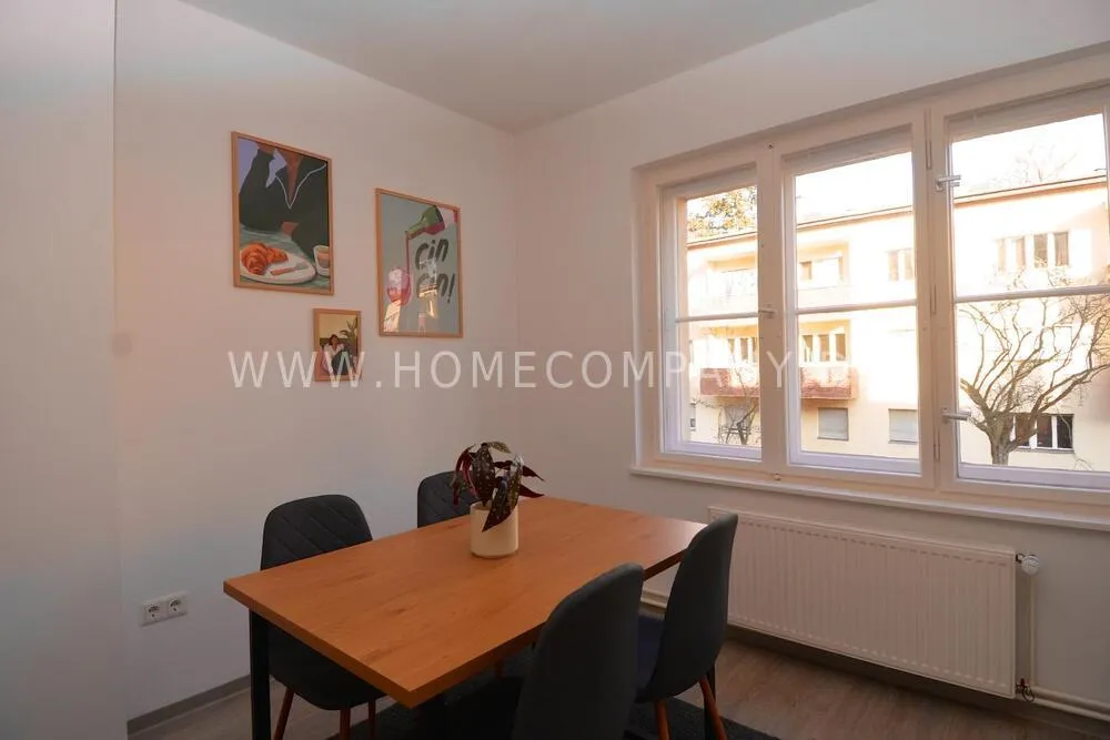 The apartment features a spacious eat-in kitchen with a large dining table for four people. The kitchen includes a washing machine; there is no dishwasher.