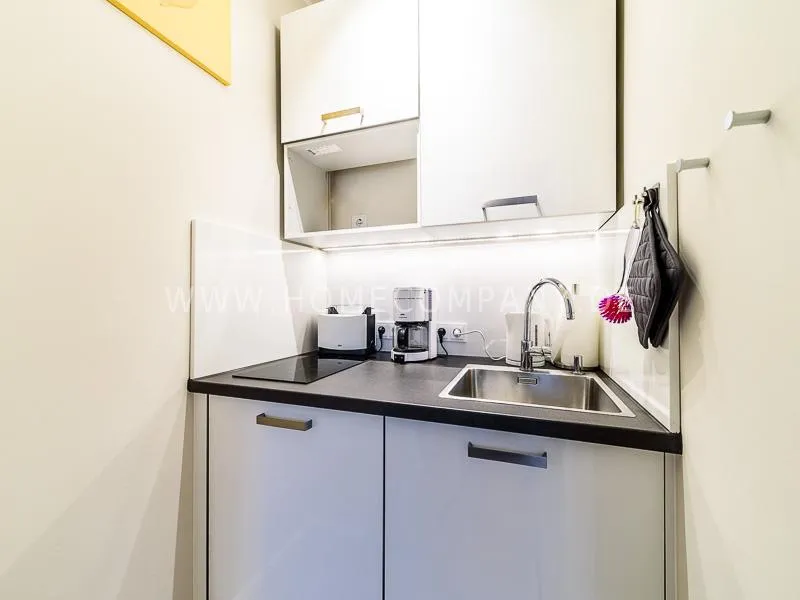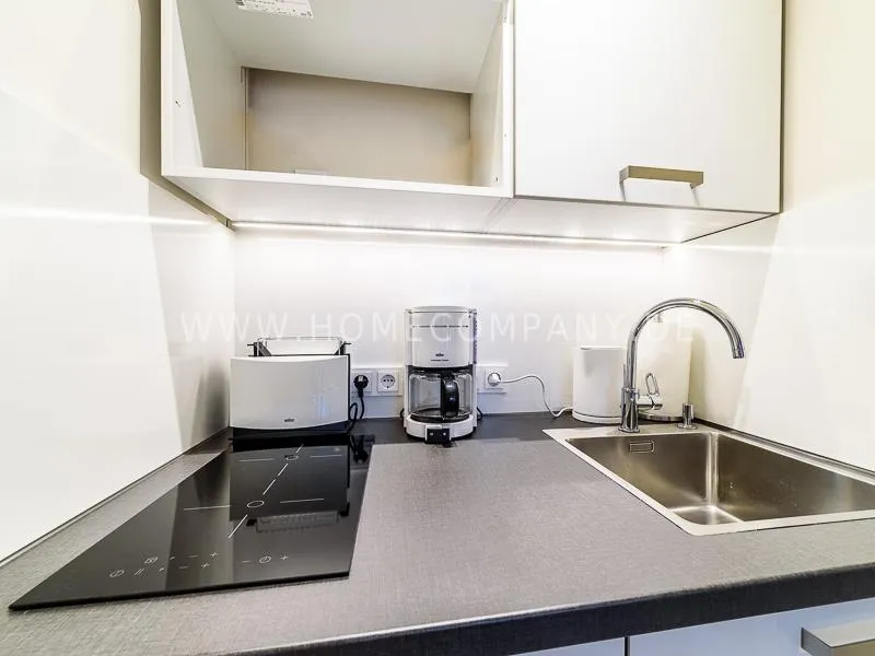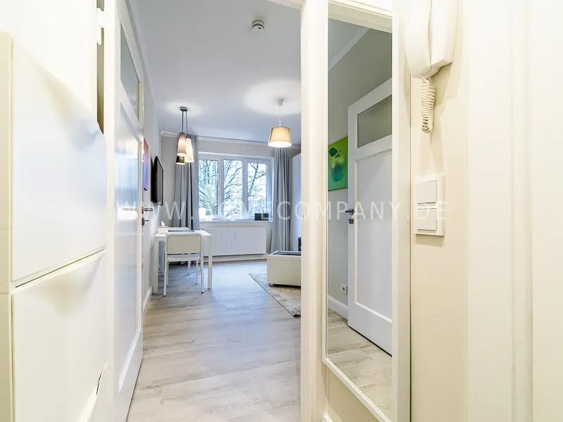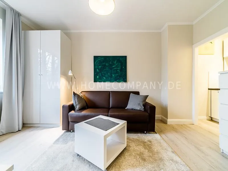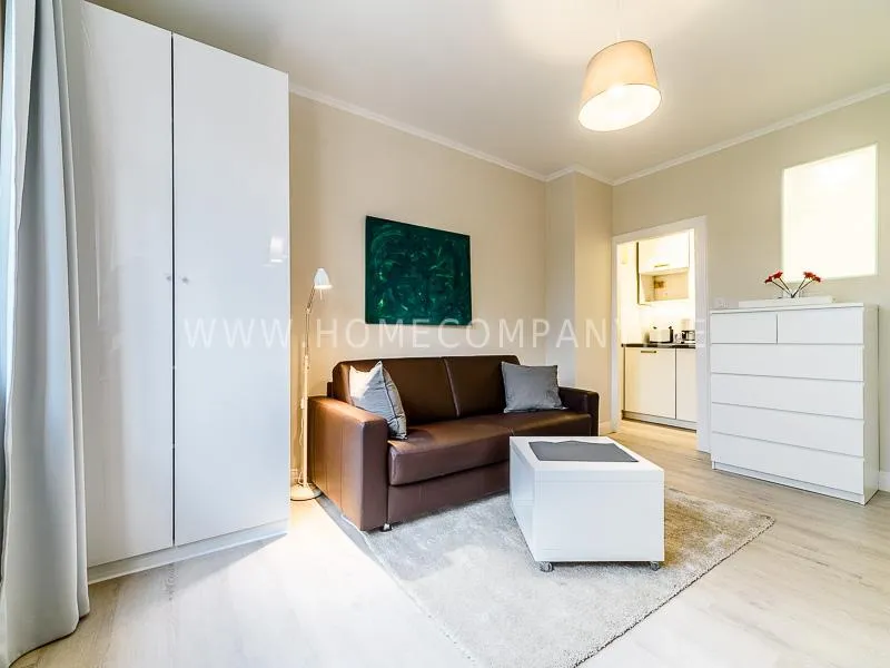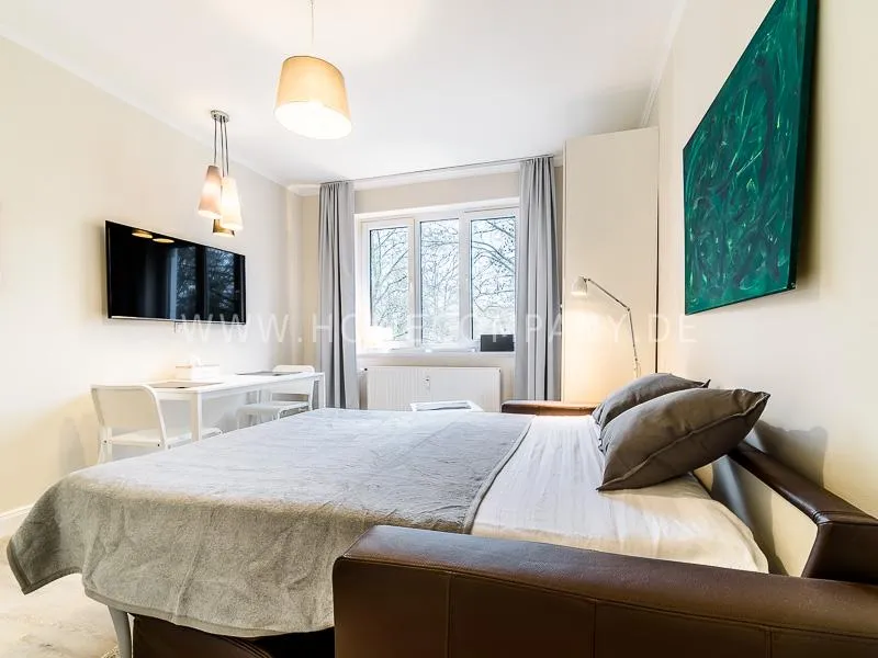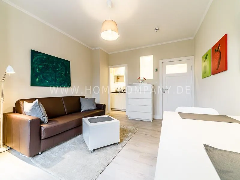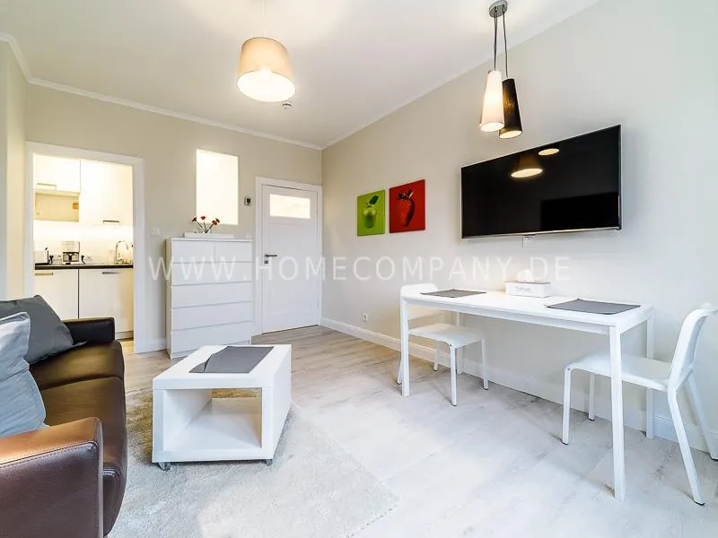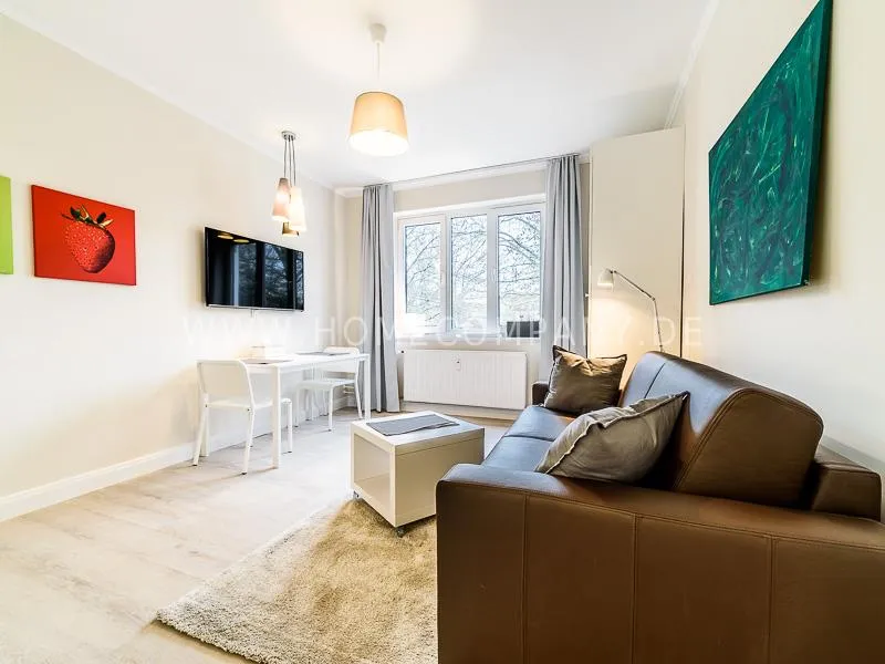 In the living room is a high quality convertible sofa, equipped with mattress available. A photo wallpaper with a birch forest gives a good spatial effect Furthermore, a small table with two chairs offers a nice dining area, which can also be used as a desk. In the wall between bathroom and living room a light field is integrated in the upper section. Overall, the apartment is characterized by some nice thoughtful details, such as an integrated bathroom radio. In the living room, a 48 "TV and a bluetooth / CD player are available. The apartment is located opposite a park. Car parking spaces are in the road. A basement can be used.
