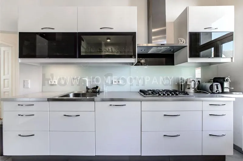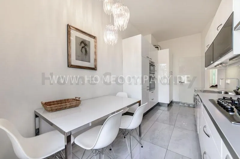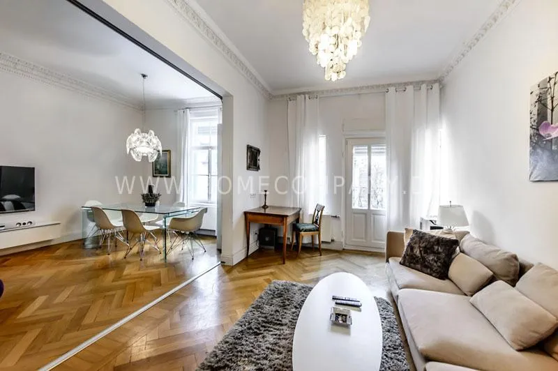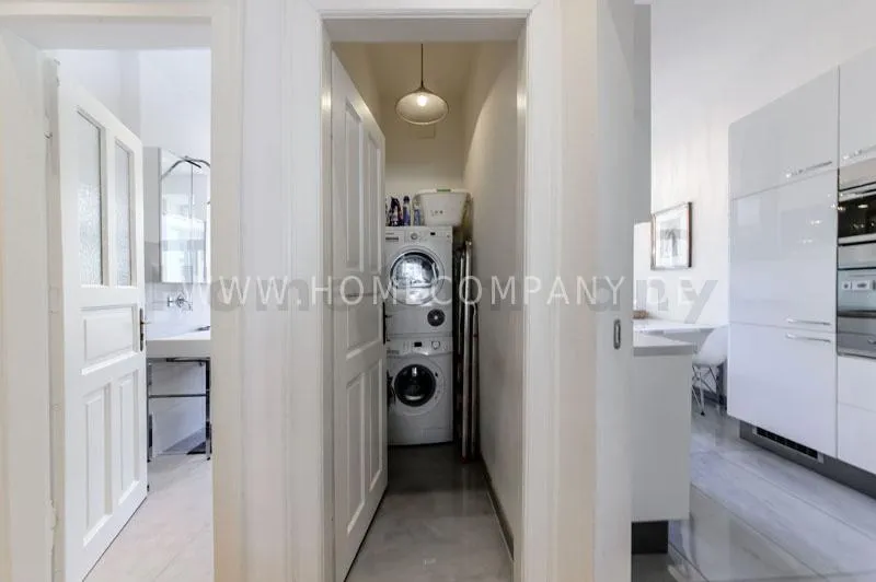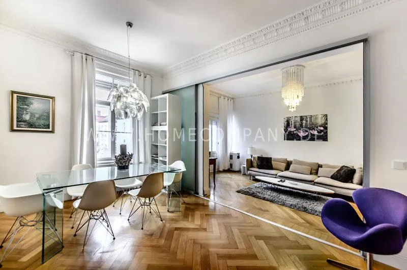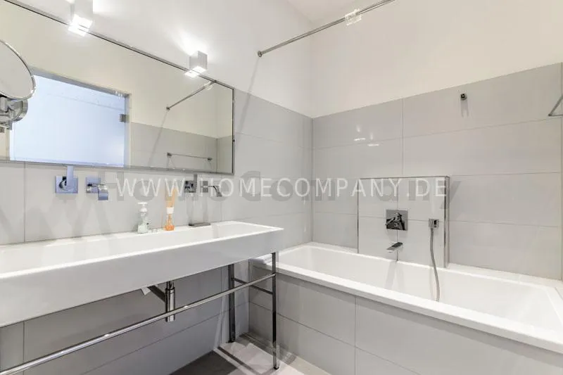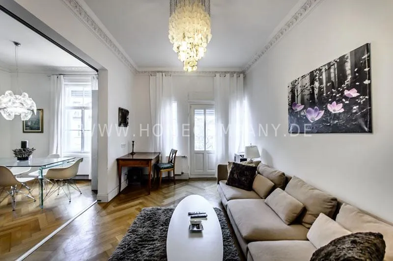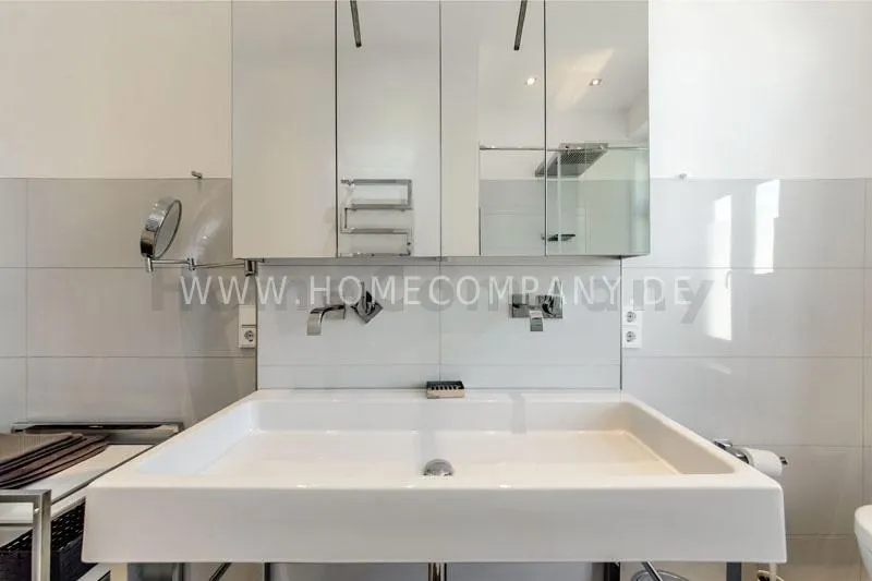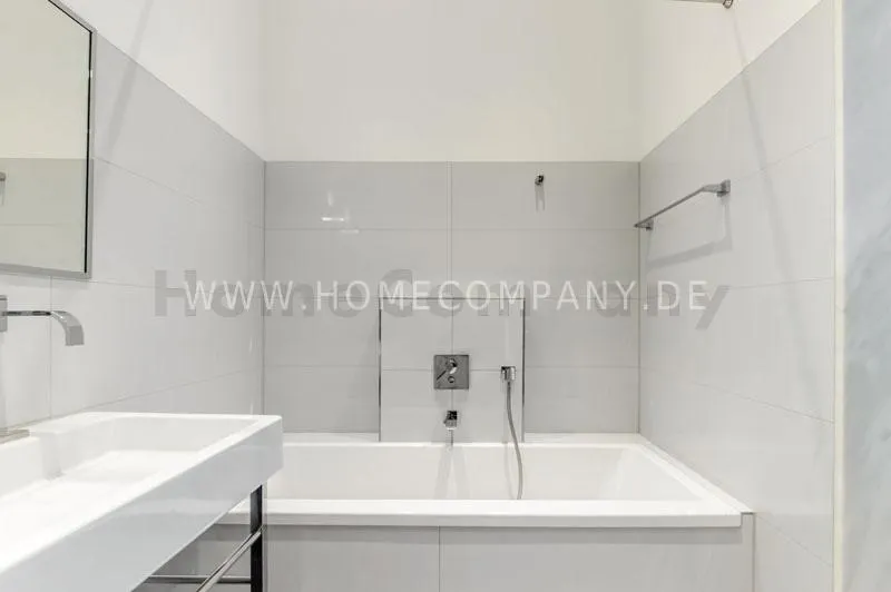 The house is quiet, but yet centrally located and situated on the 3rd floor with lift. The spacious living-/dining room is divided into living area with comfortable sofa and lounge chairs as well as beautiful antique desk with chair. From here you have access to the balcony. In the dining area there is another designer lounge chair, also a large flat screen TV, DVD, etc. The dining area offers seating for 6 people. The two bedrooms are fully furnished with doublebeds, spacious wardrobes and flat screen TVs. One of the rooms has a bathroom "en suite" with tub. Another bathroom with daylight can be accessed from the hallway. It is equipped with heated towel rails and shower with TV. The kitchen is equipped with an additional dining area for four people and everything you need daily, among other things of course are included oven, hobs and dishwasher. Washing machine and dryer are located in a separate lumber room. Other: Very high quality, refurbished, modern fittings and parquet floors. Internet included in the rent.