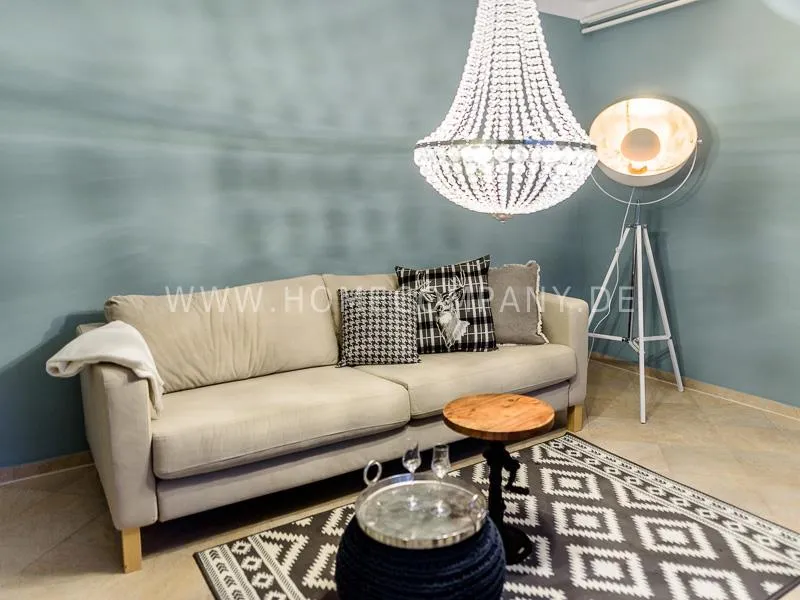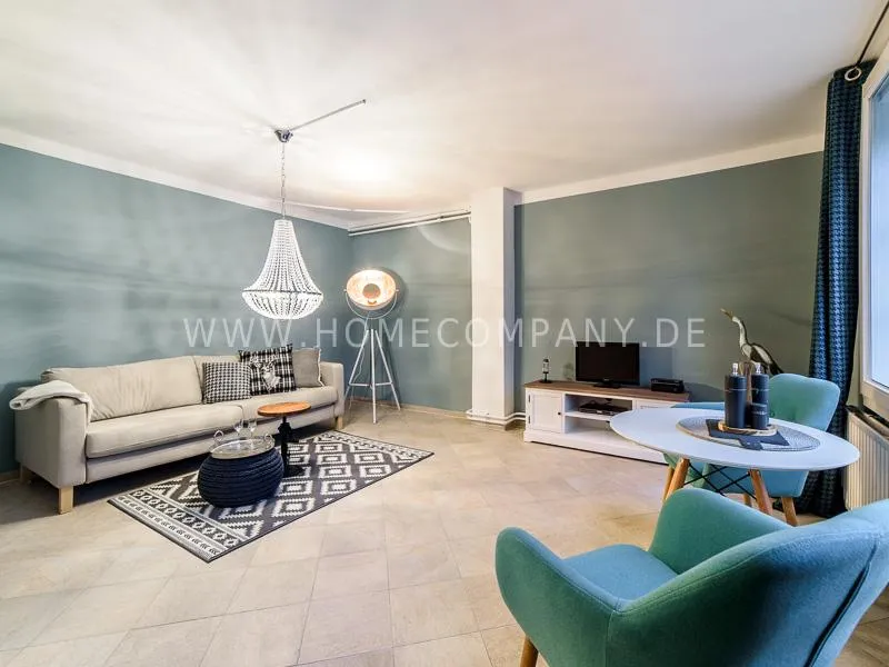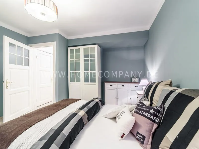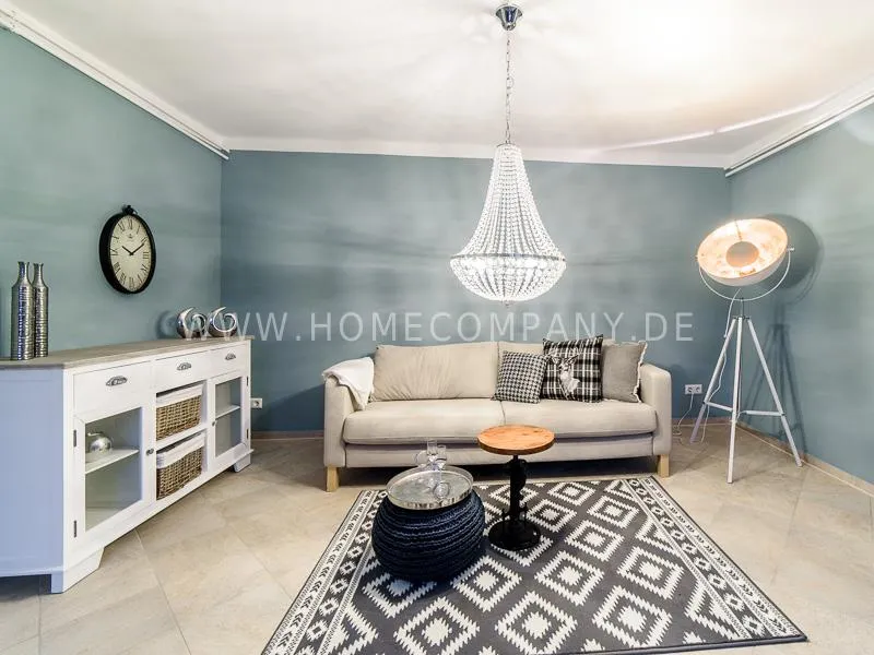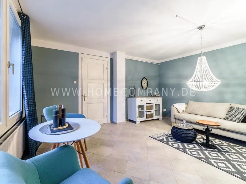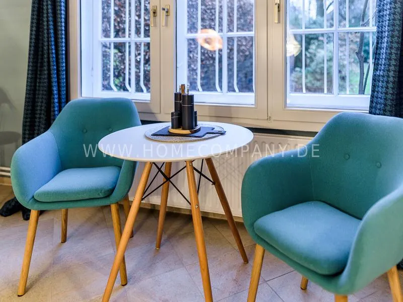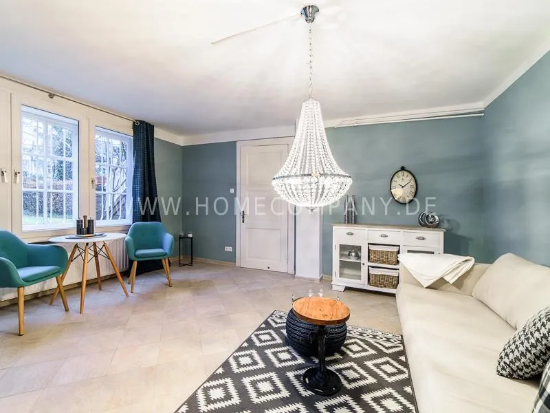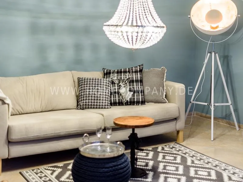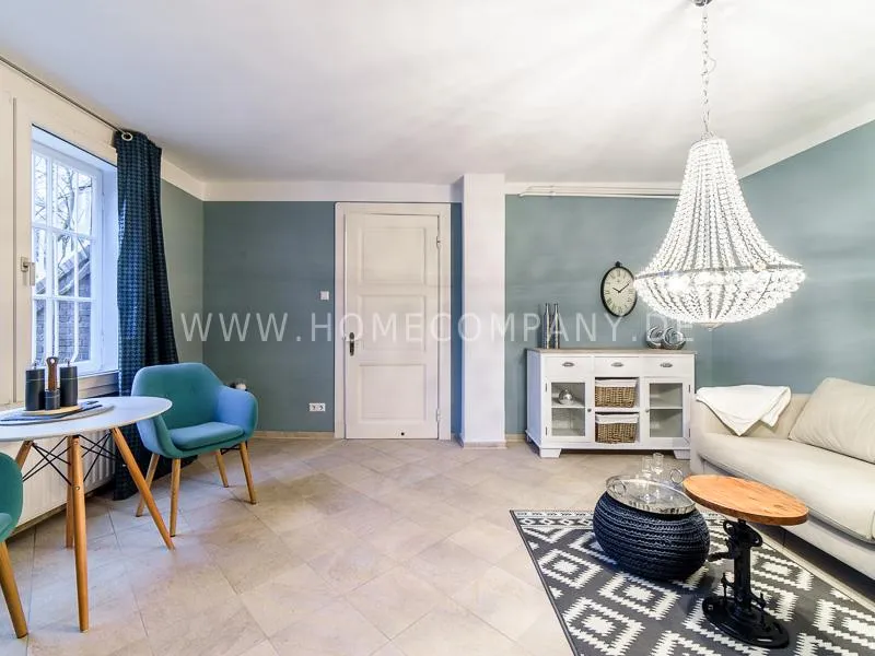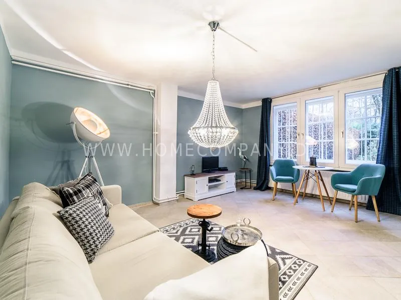 Completely furnished flat in Eppendorf. The noble and stylish living ambience with a bright stone floor, underfloor heating and turquoise-blue-gray walls - is characterized by classically elegant white country-style furniture in fir wood look and shell handles. Some of the highlights in the living room are the large chandelier, a cool industrial table and skilfully coordinated home accessories. The elegant large floor lamp immerses the room in a warm, cozy and comfortable light. From the dining table you have a view of the absolutely quiet garden. There is also a quiet terrace. There is a Nespresso coffee machine, dishwasher, oven, stove and microwave. Very good parking is available on the street. WLAN / Internet are included.