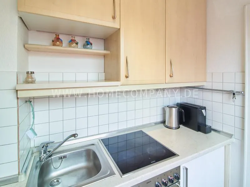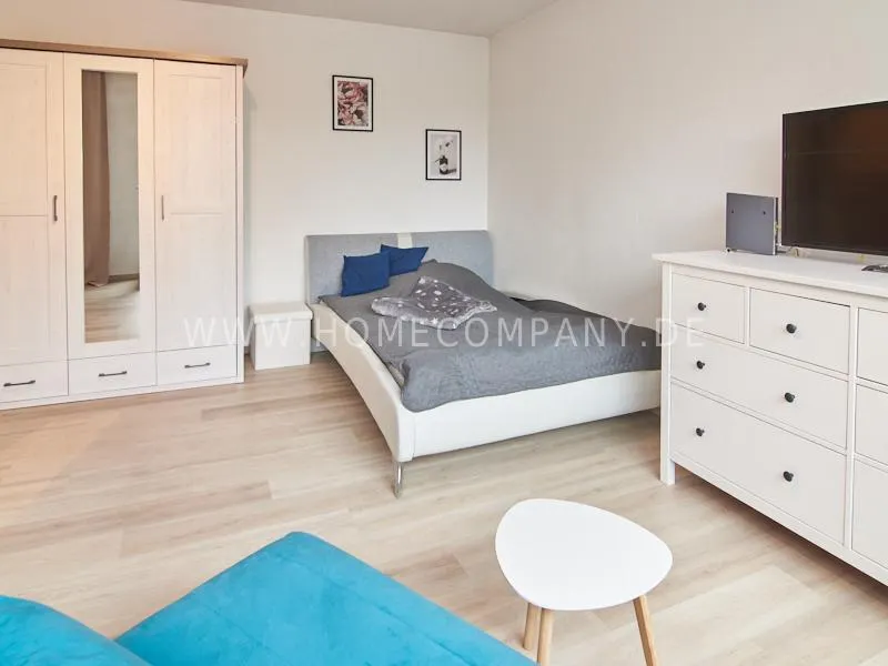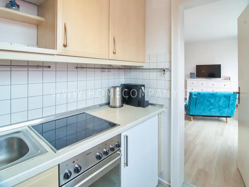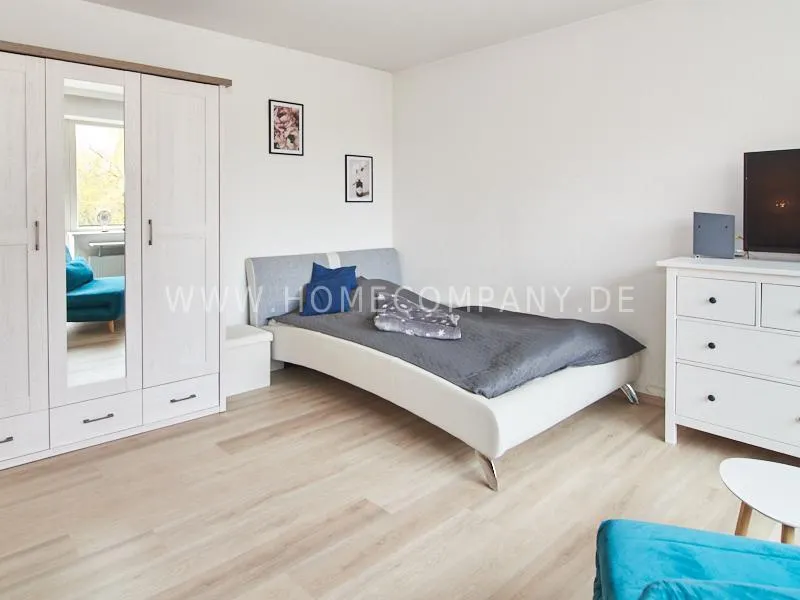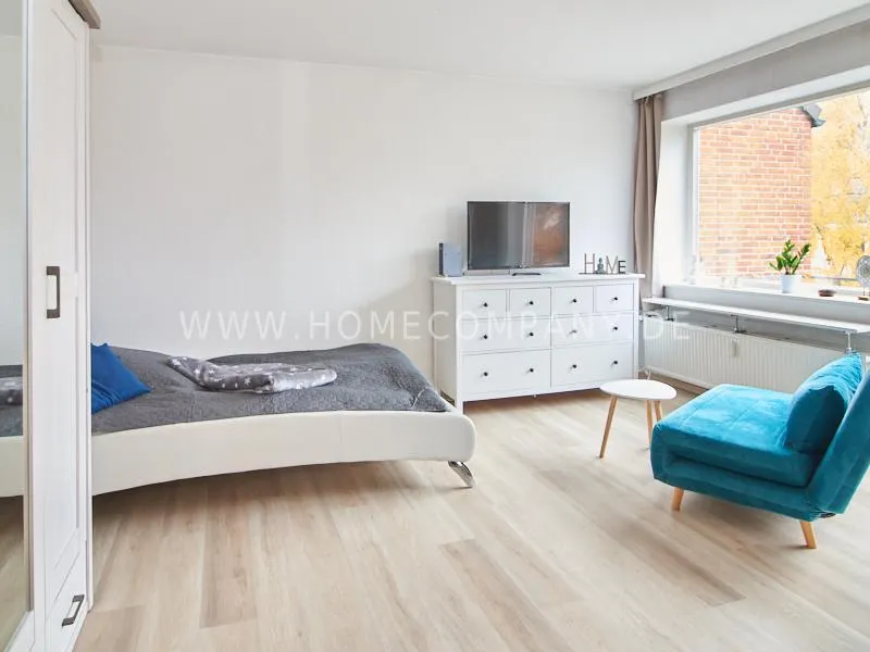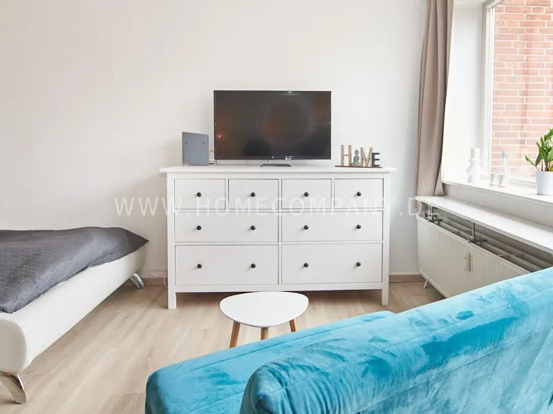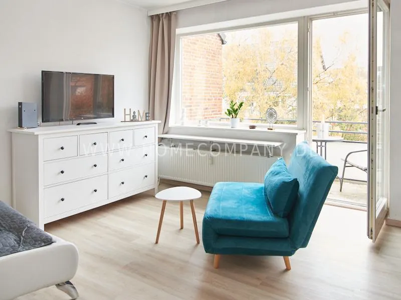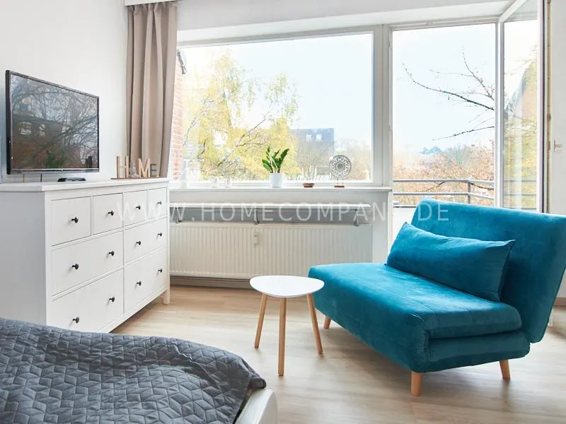 Bright and well-designed one-room apartment on the 3rd floor of a refurbished multi-family building in Hamburg-Barmbek, located in a quiet residential street in the popular Komponistenviertel. The living area features a comfortable armchair, a TV section and a dining table that can also be used as a workspace if needed. From here you have access to the balcony, which faces the green inner courtyard. In the sleeping area there is a 1.40 m wide bed and a spacious wardrobe. The separate kitchen is equipped with a modern fitted kitchen including stove, oven, refrigerator and dishwasher. The bathroom comes with a bathtub. The apartment has high-quality design vinyl flooring. Further amenities include internet access, cable TV and a washing machine.