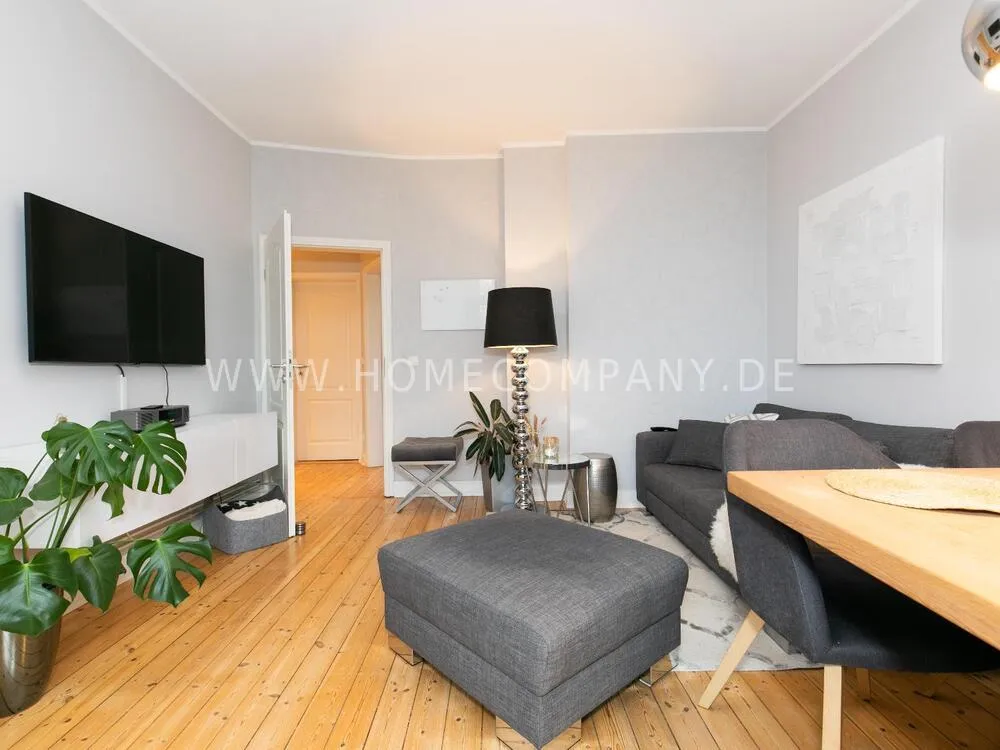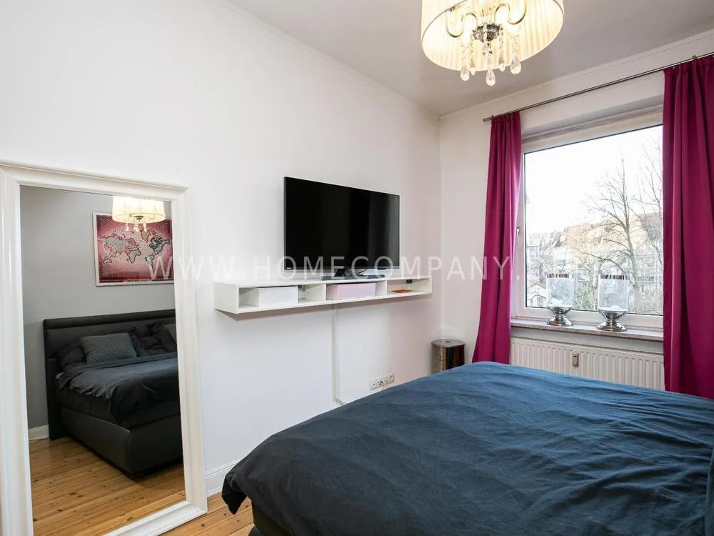 Perfectly equipped flat in a very good residential area in Winterhude. The flat is modernly furnished in subtle colors and tastefully and beautifully decorated. In the living room there is a dining table with a 4 cm thick oak top for up to 4 people. From the sofa you can look at the XXL TV ((diagonal 1.67 m, width = 1.45 m, height = 0.83 m, smart TV capable). There is also an inviting balcony with 2 small lounge chairs and a side table. The bedroom is equipped with a 1,60m wide double bed and plenty of closet space as well as a TV.