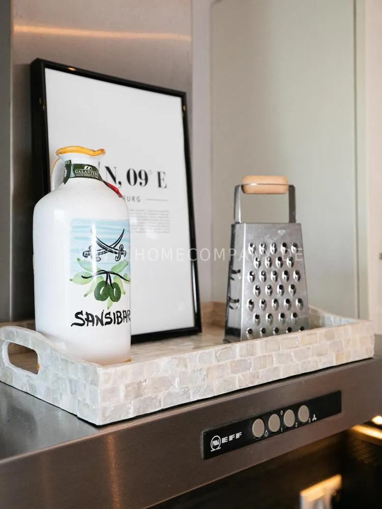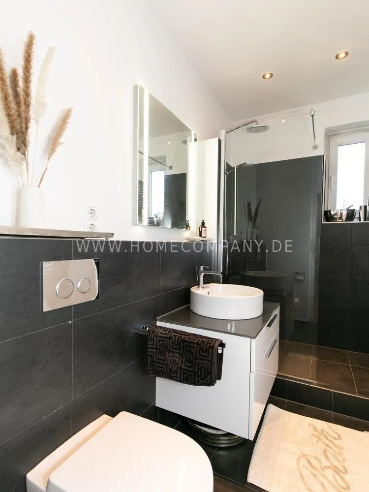 The modern, well-equipped fitted kitchen offers everything that makes cooking pleasant and is equipped with a particularly large refrigerator and freezer with an additional ice cube maker. A special highlight is the white, high-gloss floor, which works particularly well in combination with the individually switchable and dimmable lighting on the work surface and in the base area. A small breakfast area is available as well as a storage room separated by a white sliding door. The bathroom is equipped with large-format anthracite-colored tiles. The floor-level shower has a glass partition.A bicycle storage room is available in the house.