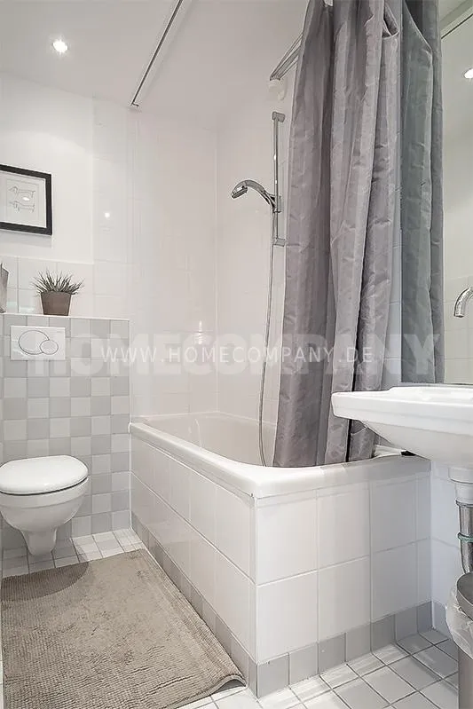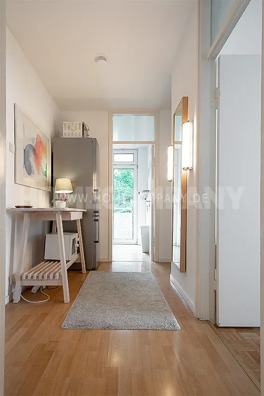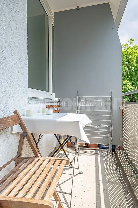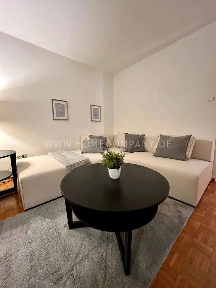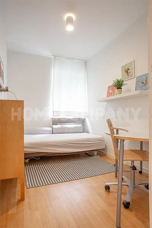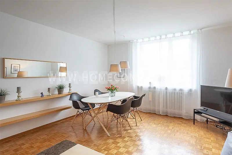 Sunny, modernly furnished 3-room flat with balcony, very centrally located in the heart of Schwabing but also quiet in the rear building. 5th floor with lift. Large living room with light-coloured angle-type sofa, bedroom with double bed. A further sleeping facility in the guestroom. The small fitted kitchen with dishwasher and microwave offers access to the south-balcony. Flooring: Parquet and laminate. Washing mashine for joint-use in the loundrette of the house. All shops, restaurants, cafés etc. as well as public transport in immediate reach.