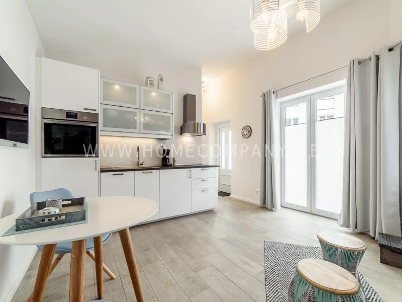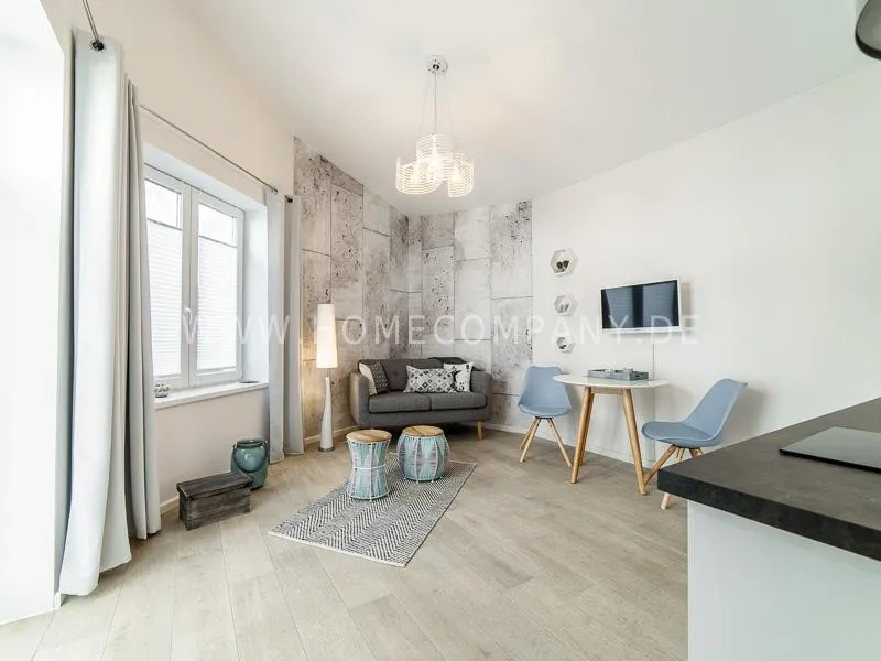 The apartment with floor heating is modern and harmoniously decorated. A cozy, light gray sofa invites you to relax. The two attractive side tables in bright colors, table top made of mango wood and a beige, light blue cotton braid are an individual look with charm. The wall design, the high, oblique ceilings and carefully selected accessories lend the styling a contemporary business ambience. Other contrasting touches, such as a modern carpet, and a cozy-large pouf, lighten the overall look. The open high-gloss kitchen is equipped with a washing machine, dishwasher and a Senseo coffee machine. The bright bathroom with underfloor heating, generous shower and hair dryer offers every comfort. The bedroom is equipped with a 1.20m boxspring bed and a 2.70m wardrobe with additional inside drawers. Made-to-measure pleats, which can be adjusted in any position from the top and the bottom, offer a high degree of visibility and sun protection on all windows and provide for gently filtered, natural light in the room. Additional curtains create a pleasant ambience even in the evening hours. The apartment has a terrace and is located in the absolutely quiet inner courtyard of a little busy side street, only 1.2 km from the Dammtorbahnhof and the city center.