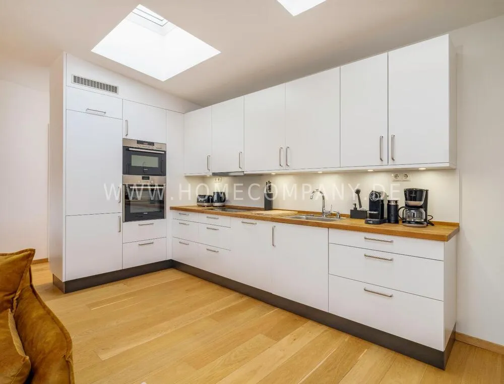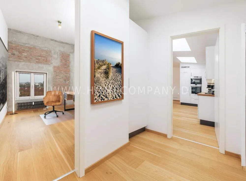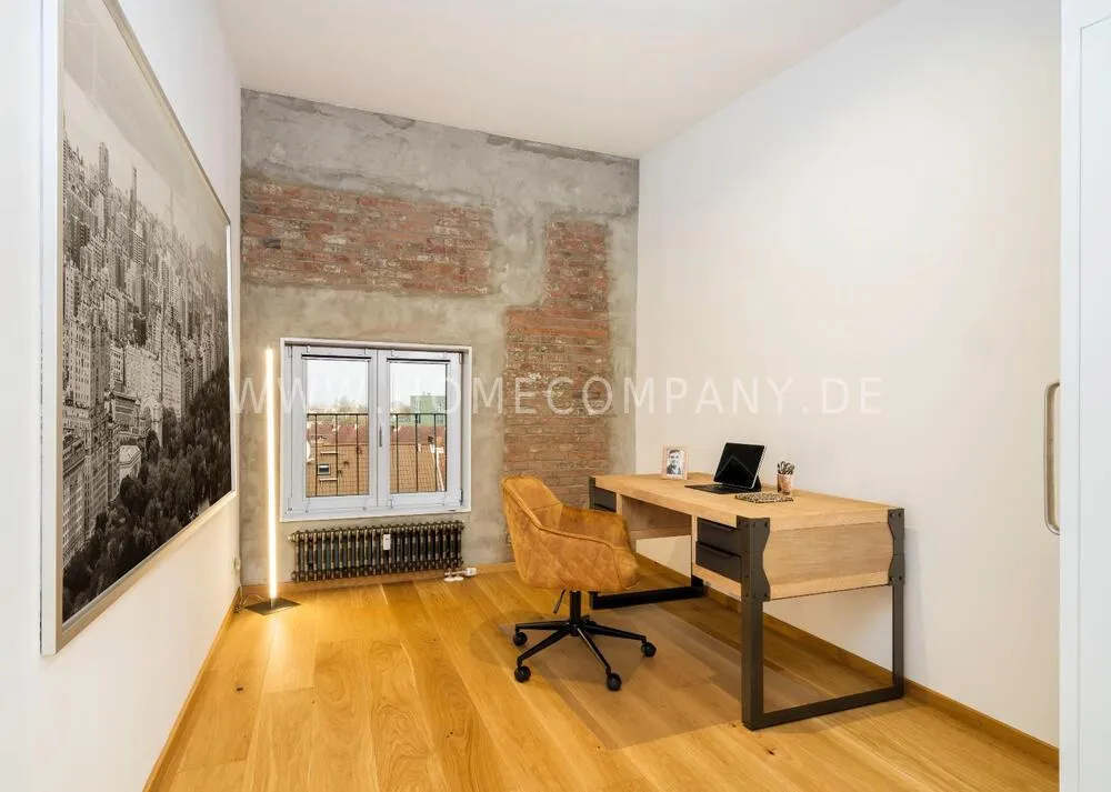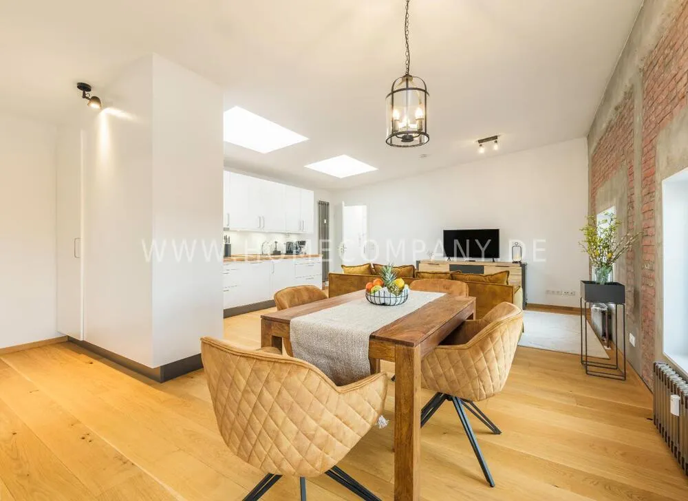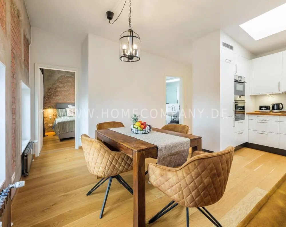 Urban loft flair in a fully refurbished period building, combined with contemporary living comfort and stylish furnishings. Exposed brick walls, bright rooms, high-quality materials and parquet floors give the apartment its distinctive character. The open-plan living and dining area with fitted kitchen forms the heart of the home, complemented by a bedroom with boxspring bed as well as a separate study or guest room.