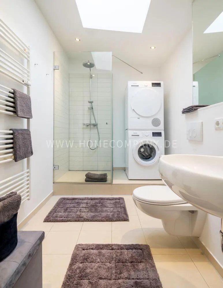 The modern bathroom features a walk-in shower. For additional convenience, a washing machine and dryer are available. Naturally, TV and internet are also included. The apartment is fully furnished and turnkey ready, with everything provided from tableware to bed linen.