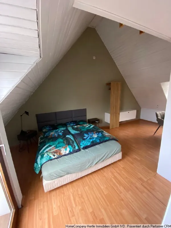 Double bed (180x200 cm), large wardrobe, bathtub in the attic, mirror, chair, 2 nightstands, small lamp, ceiling light, rug, picture, bathroom scale, bedding, blankets and pillows