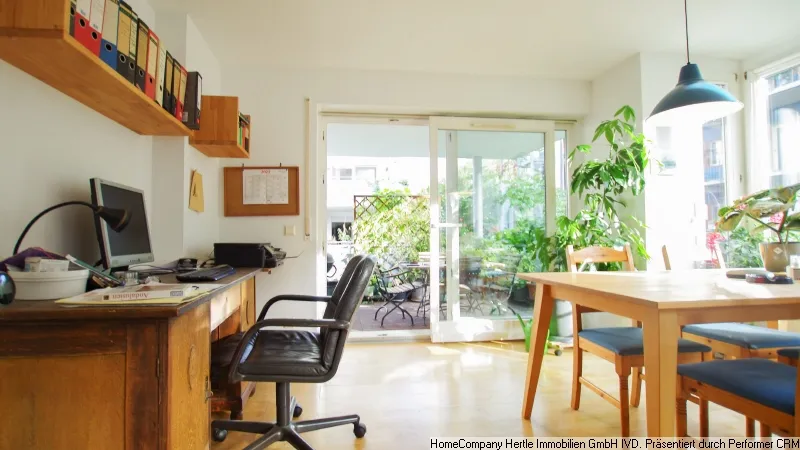 Living and dining room with work area and access to the balcony and bathroom with tub / WC.