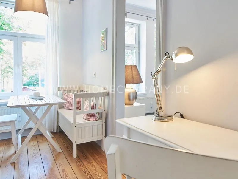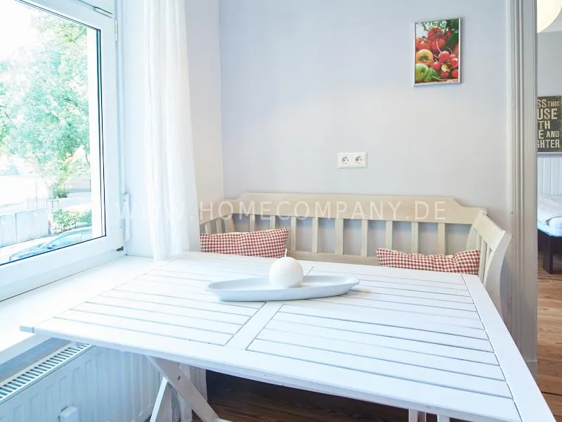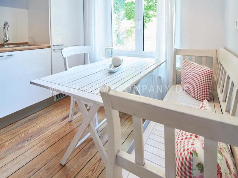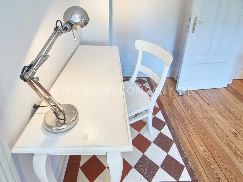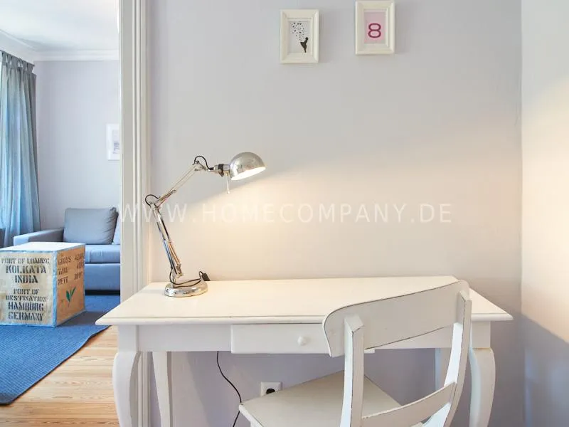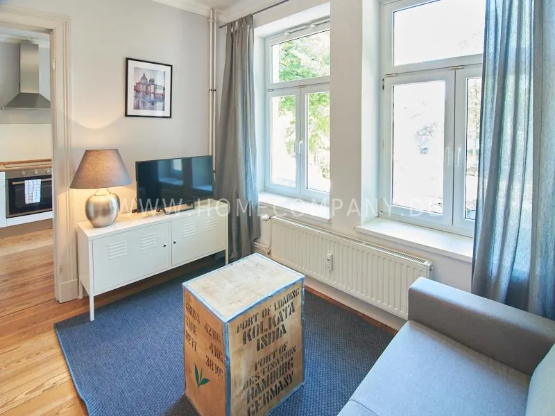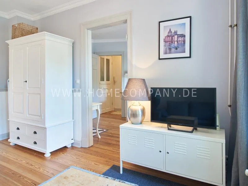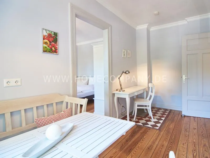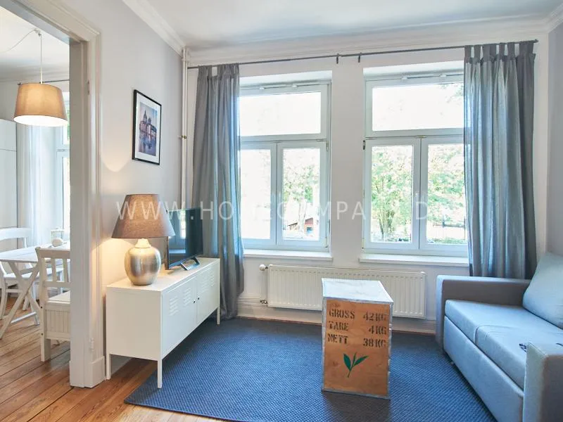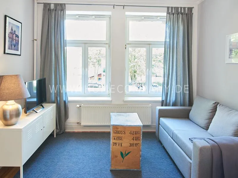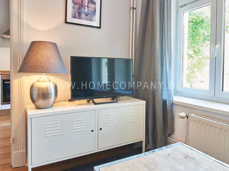 Simply furnished 1-room apartment with wooden floors. The large kitchen is equipped with a fitted kitchen. There is also a dining area and a table for a notebook available. The living/sleeping area is equipped with a 1.40 m bed, a wardrobe, a sofa, a sideboard and a television. All windows in the apartment look out onto the quiet, beautifully designed street; the opposite side of the street is almost undeveloped and offers a wide view.