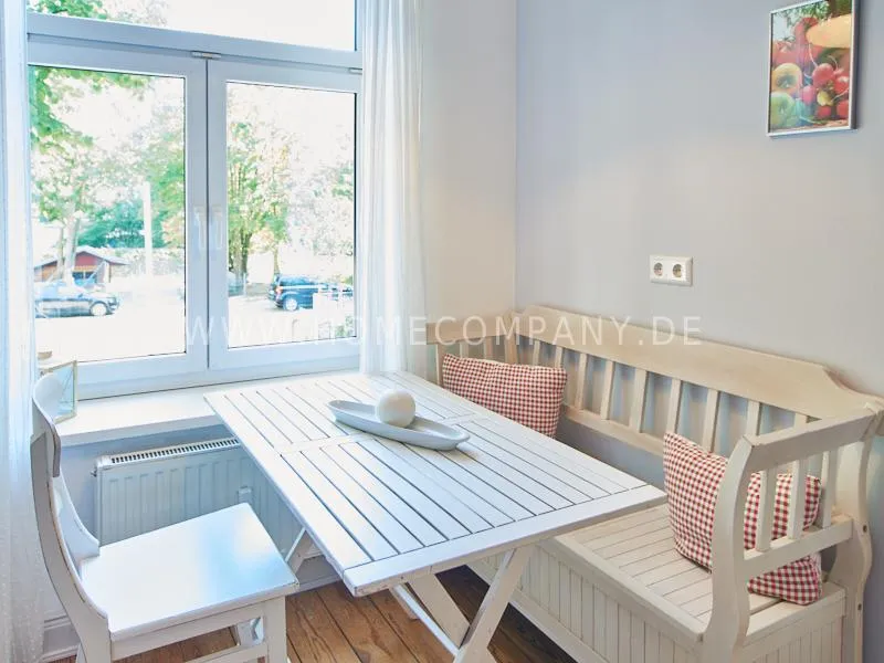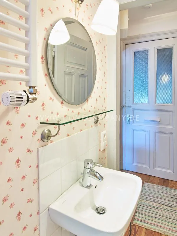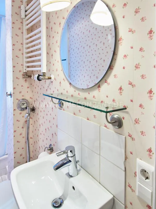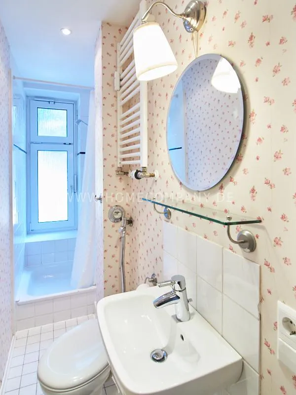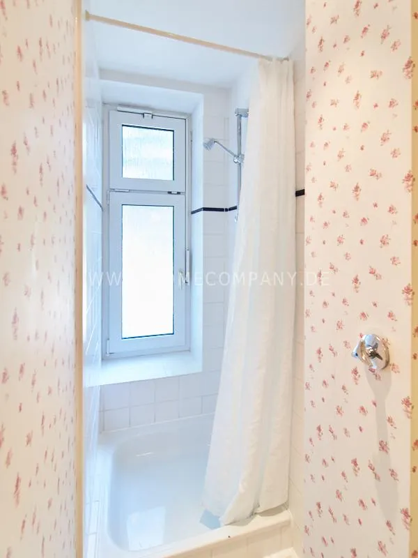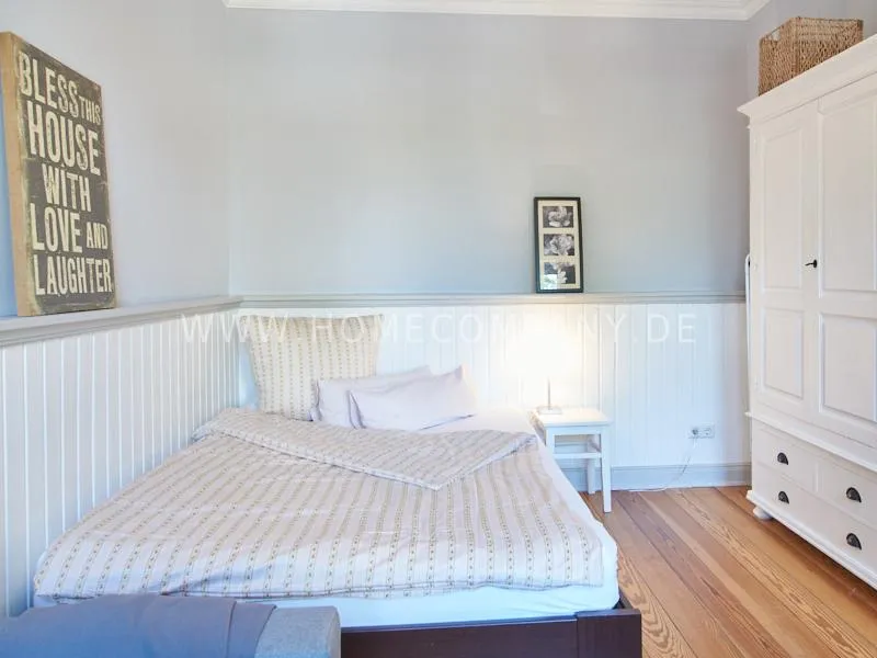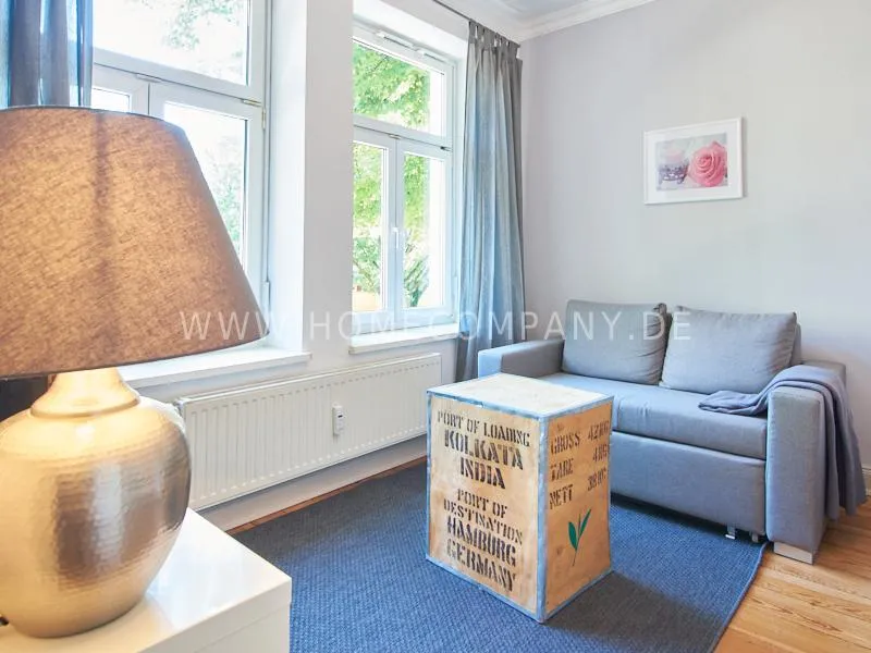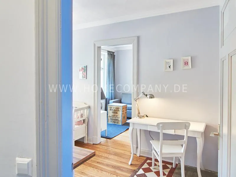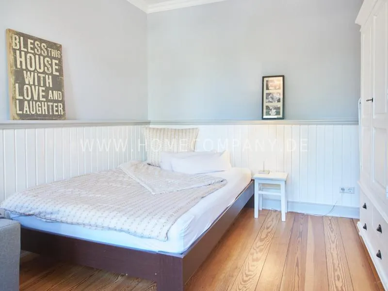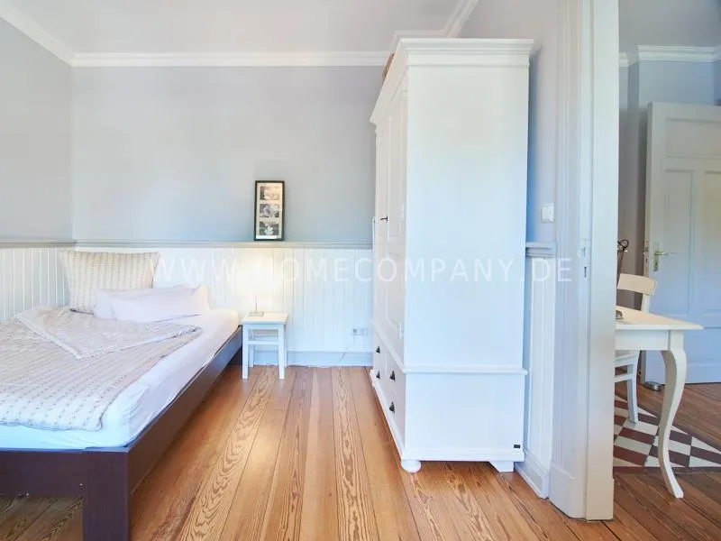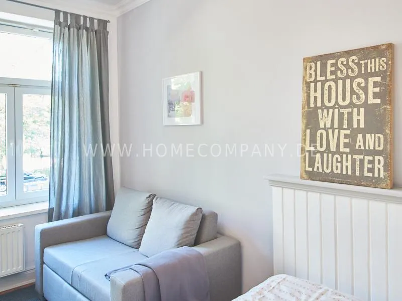 Simply furnished 1-room apartment with wooden floors. The large kitchen is equipped with a fitted kitchen. There is also a dining area and a table for a notebook available. The living/sleeping area is equipped with a 1.40 m bed, a wardrobe, a sofa, a sideboard and a television. All windows in the apartment look out onto the quiet, beautifully designed street; the opposite side of the street is almost undeveloped and offers a wide view.
