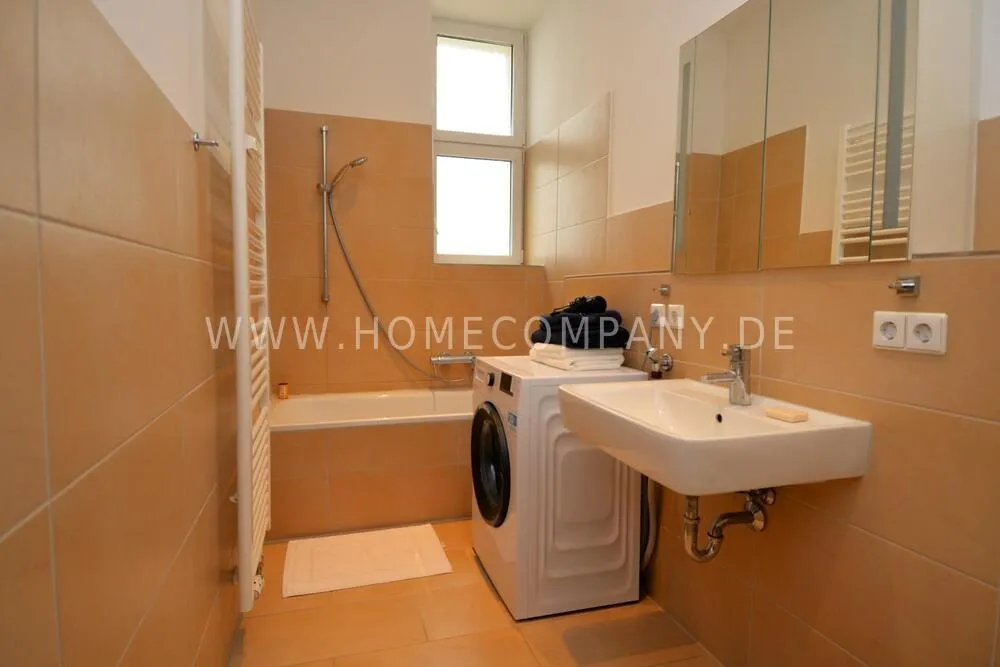The modern bathroom boasts a large bathtub and a washing machine. Internet is also available, allowing you to move in and feel at home right away.