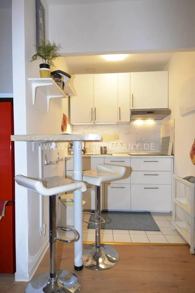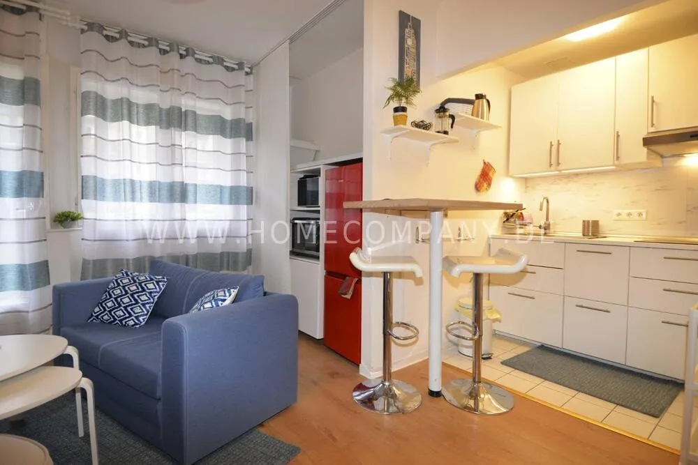 The modern furnished apartment has a fully equipped kitchen where you can enjoy cooking and have a nice meal on a bar table.