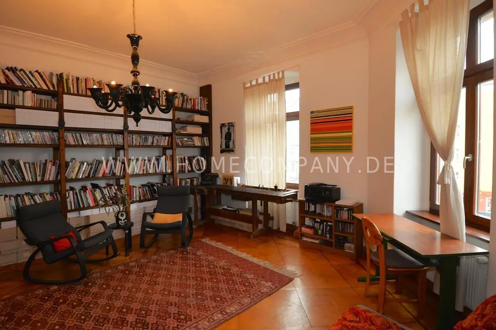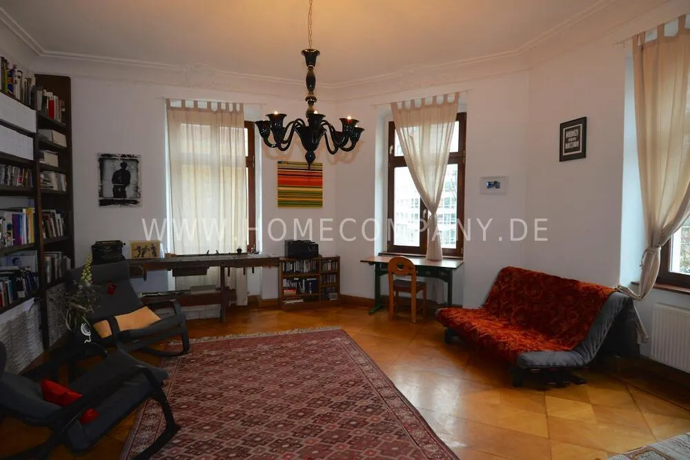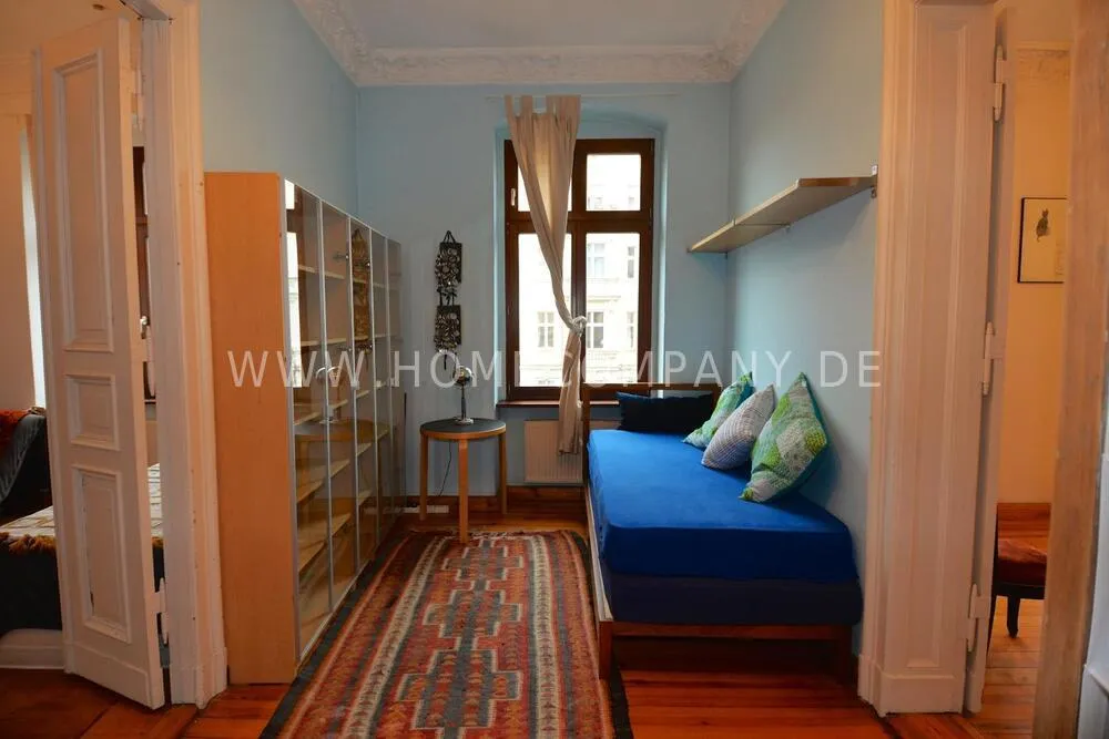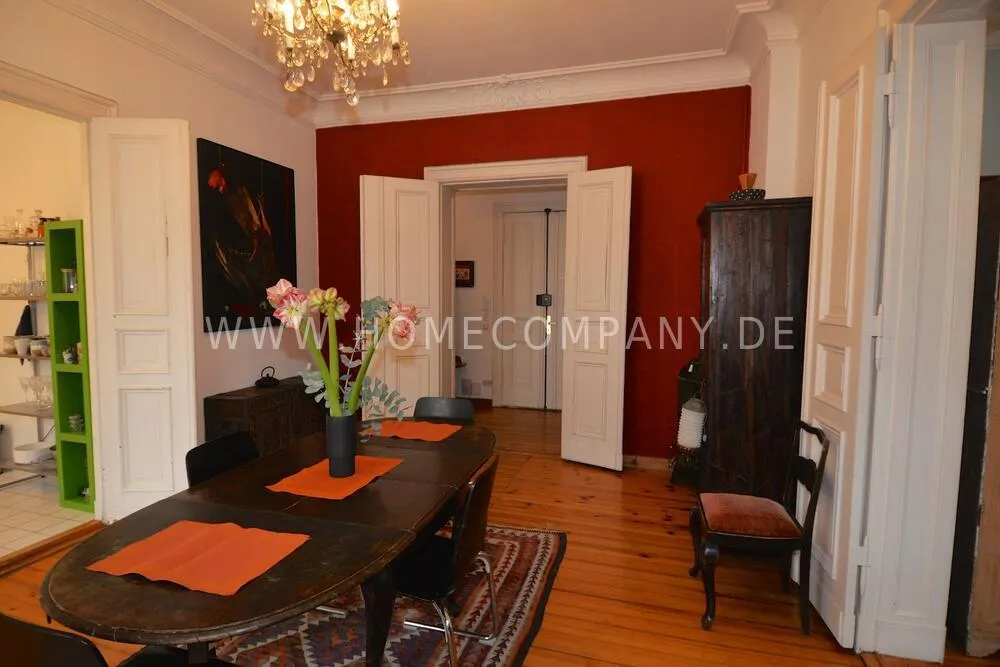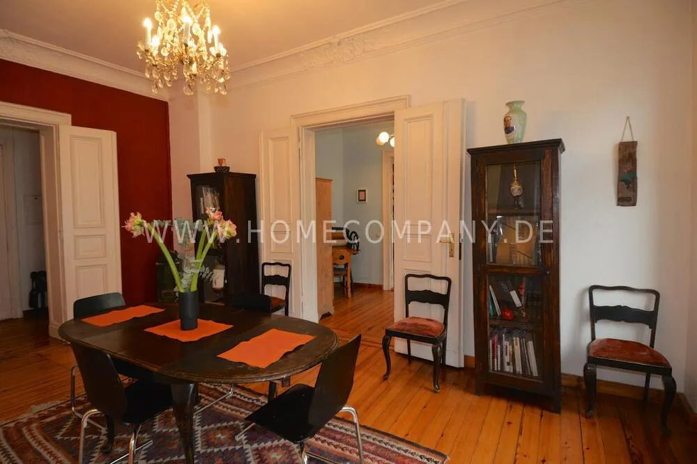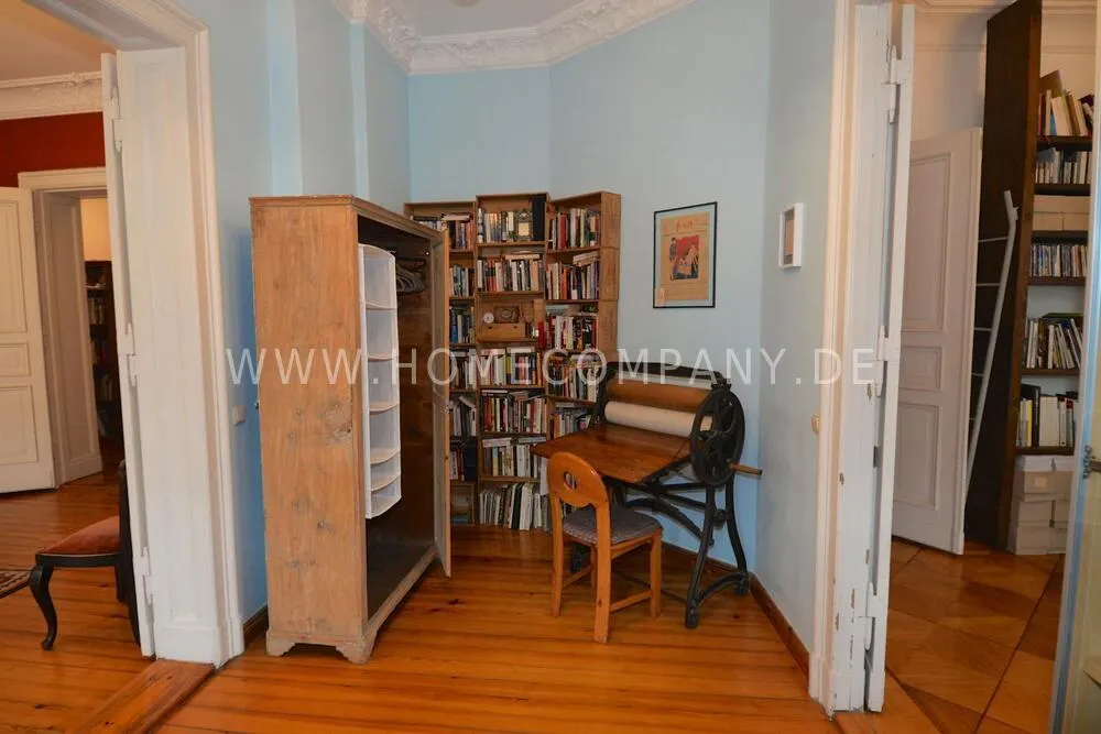 This beautiful art apartment is located in the lovely neighborhood of Prenzlauerberg in one of Berlin's clasically opulent residential buildings from the 19th century Wilhelminian era and is particularly suitable as a cosy home for families. Stylish cafés, restaurants, and shops, street markets, parks, and excellent schools are all on your doorstep. Only 2 blocks away from Kollwitzplatz, with its organic food and craft street markets. Within walking distance of Museum Island and the art&culture district of Mitte, and extremely convenient for public transport to the rest of the city. The apartment is fully furnished with cozy old-world charm, and houses an extensive library on international art and design, as well as contemporary artworks by international artists on loan from the collection of a prominent Berlin gallery. The corner facing apartment gets sunshine all day long, with four rooms plus two bathrooms, kitchen, sunny balcony, and a walk-in closet and storage room. On top of the dining room and master bedroom with en-suite bath, the other two rooms can be used as bedrooms or as additional living room, study, or office. High-speed wireless internet is provided. Additional storage space is available in a private secure unit in the basement. A parking permit can be issued for free street parking. 3 supermarkets, dry cleaners, gyms, children's playgrounds, and many other amenities located within a couple of blocks of the apartment. Double-glazed windows and a quiet courtyard-facing master bedroom ensure a quiet oasis in the heart of the city.