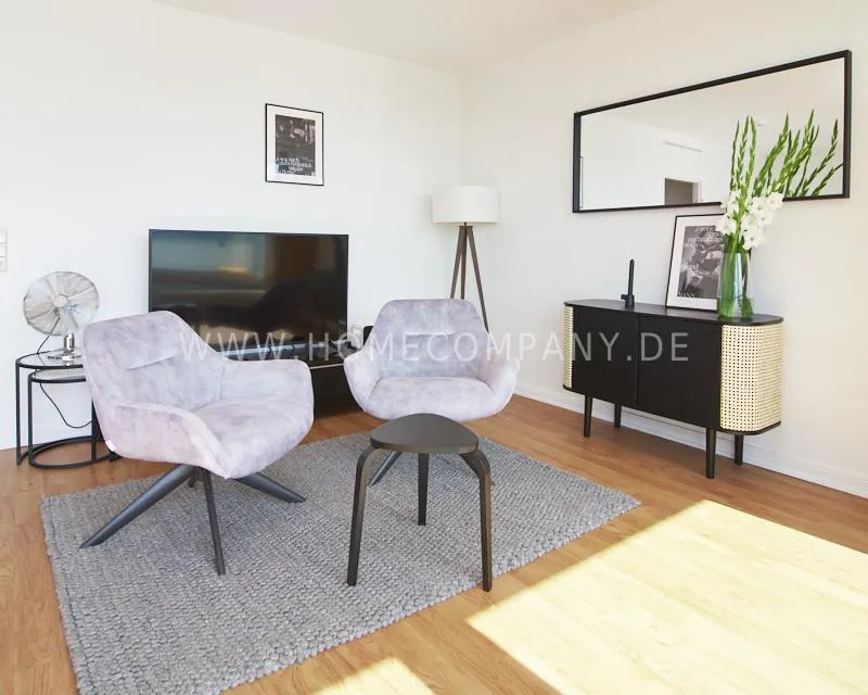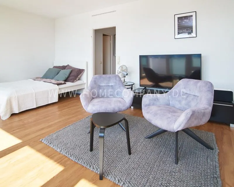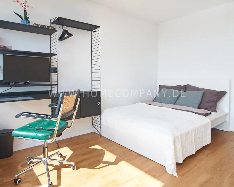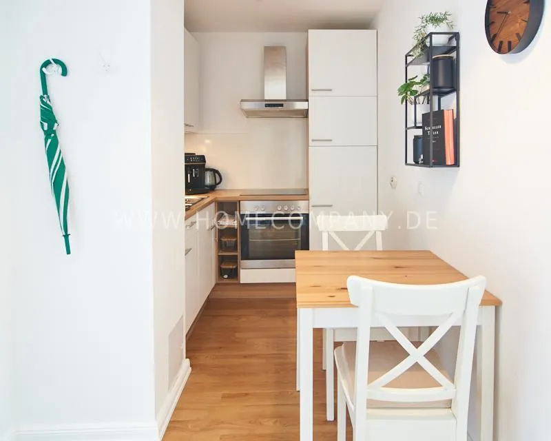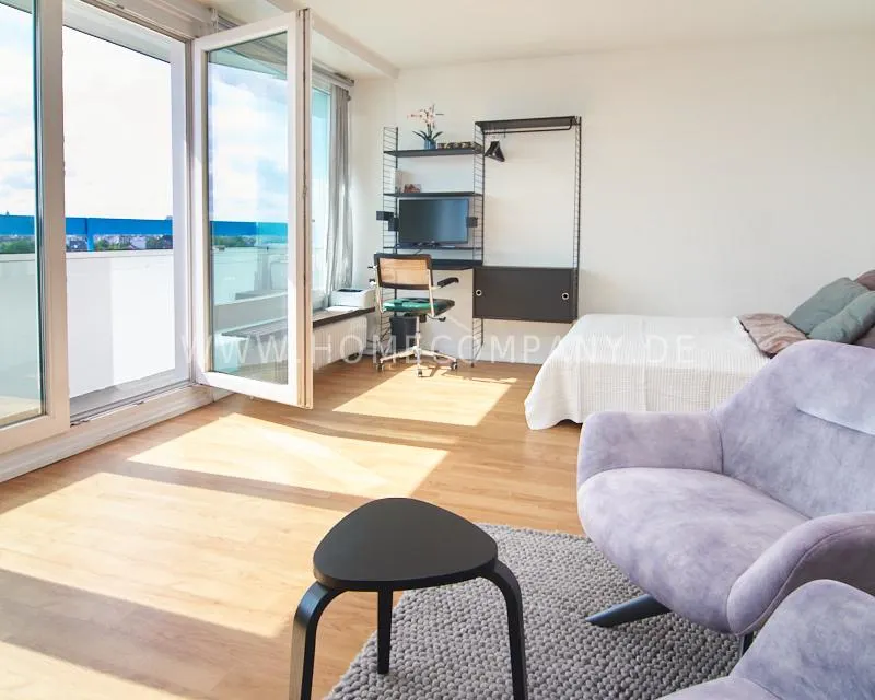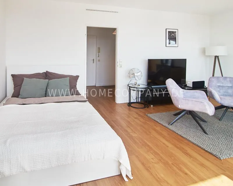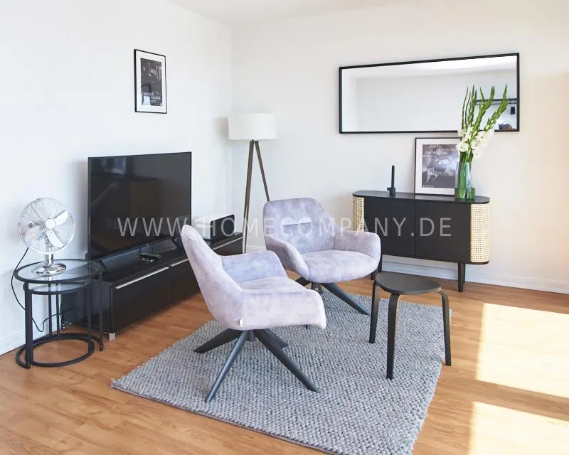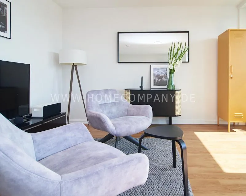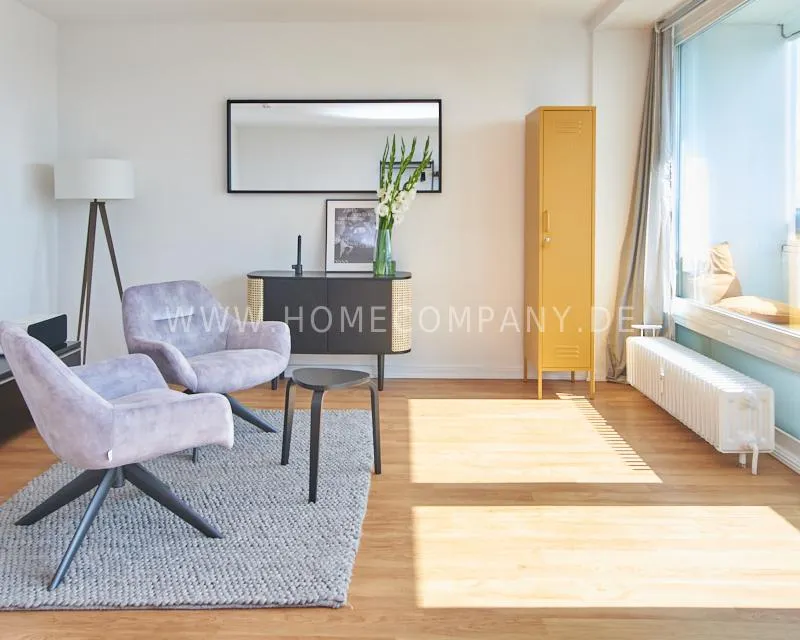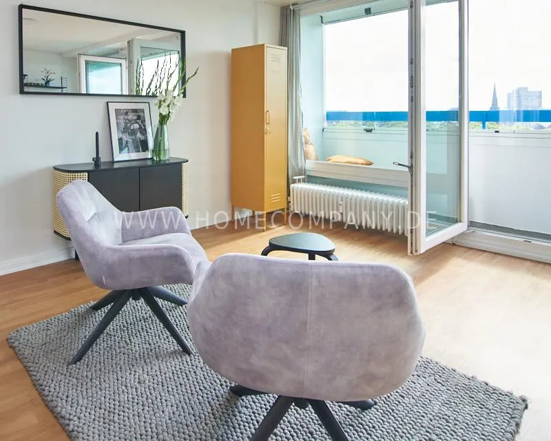 Upon entering this bright, elegantly designed apartment on the 10th floor of the Doormanntower, you are immediately captivated by the fantastic view of Hamburg’s skyline. The large floor-to-ceiling windows flood the living area with daylight, and the space impresses with stylish furnishings and high-quality amenities. From the central hallway, all rooms are directly accessible. The living and sleeping area (approximately 24.5 m²) is bright and open in design. The adjoining loggia extends the living space outdoors – both door panels can be opened completely. The apartment also features high-end tech amenities: a Smart TV with Apple TV and an Apple HomePod provide access to all streaming services and deliver an excellent sound experience. With 150 Mbit fiber-optic Wi-Fi and an integrated monitor at the desk, the apartment is perfectly suited for use as a home office. The separate kitchen is outfitted in a modern style, featuring white cabinetry, a warm wooden countertop, a ceramic cooktop with oven, a coffee maker, an electric kettle, and a SodaStream. A small dining area for two is also provided. The bathroom features a bathtub and a mirrored cabinet, while the sleeping area has a 1.60 m wide bed. A washing machine and dryer are available in the communal laundry room. A special highlight is the location between the lively Schanzenviertel neighborhood and the charming, green district of Eimsbüttel. A diverse selection of restaurants, shopping options, and parks—as well as train and bus stations—are within walking distance.