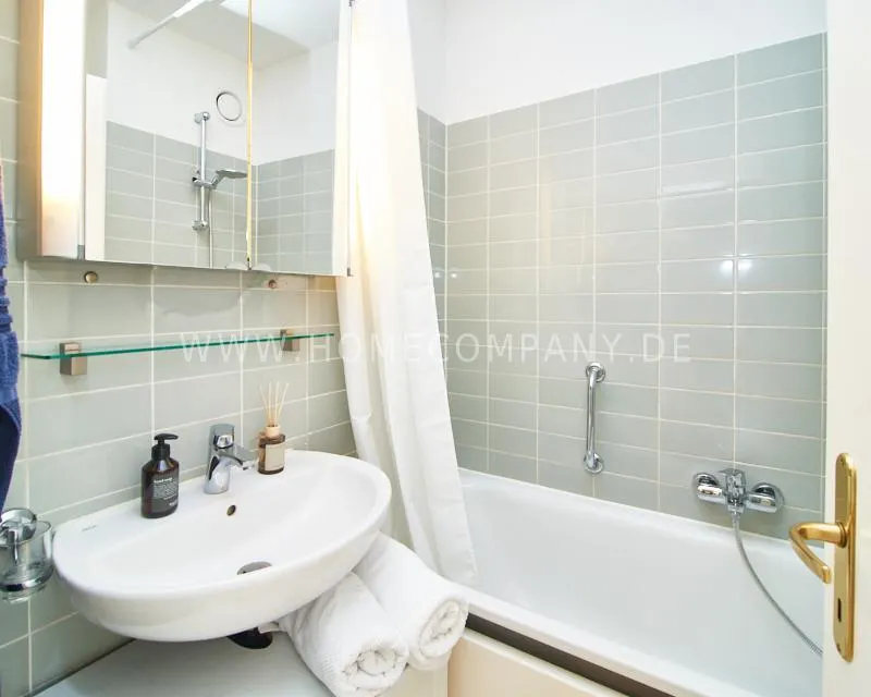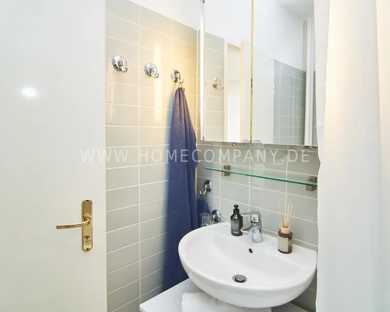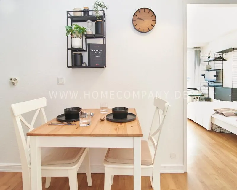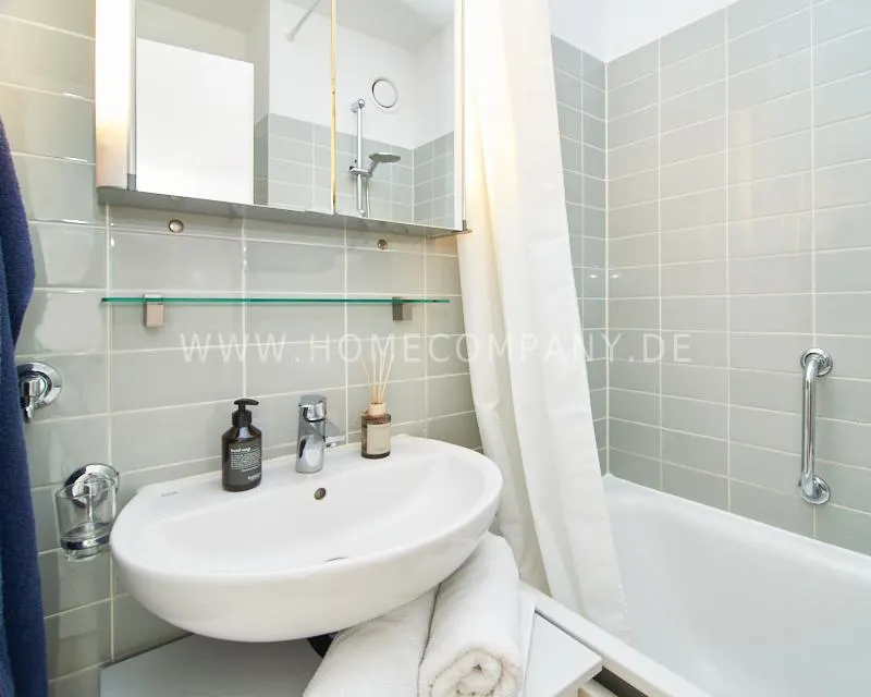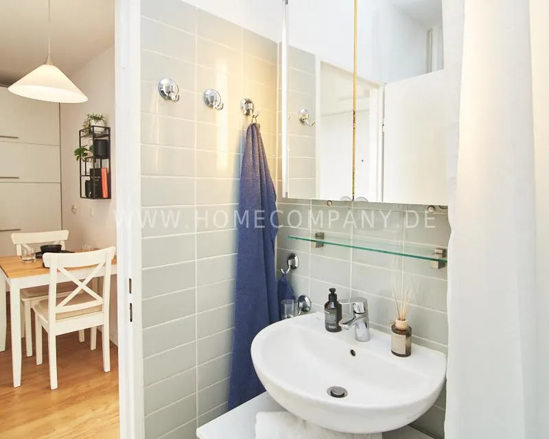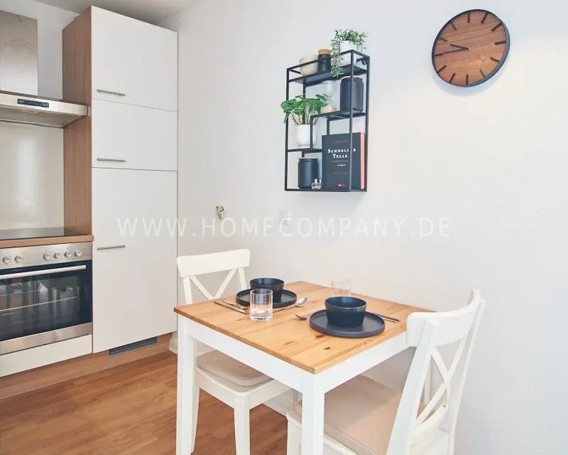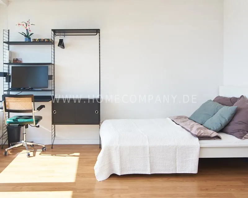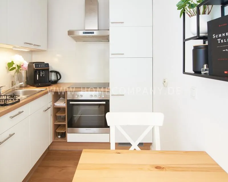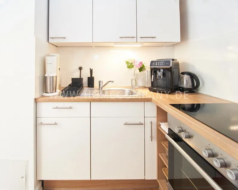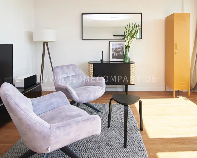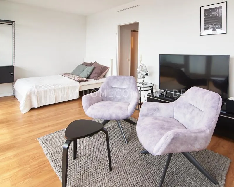 Upon entering this bright, elegantly designed apartment on the 10th floor of the Doormanntower, you are immediately captivated by the fantastic view of Hamburg’s skyline. The large floor-to-ceiling windows flood the living area with daylight, and the space impresses with stylish furnishings and high-quality amenities. From the central hallway, all rooms are directly accessible. The living and sleeping area (approximately 24.5 m²) is bright and open in design. The adjoining loggia extends the living space outdoors – both door panels can be opened completely. The apartment also features high-end tech amenities: a Smart TV with Apple TV and an Apple HomePod provide access to all streaming services and deliver an excellent sound experience. With 150 Mbit fiber-optic Wi-Fi and an integrated monitor at the desk, the apartment is perfectly suited for use as a home office. The separate kitchen is outfitted in a modern style, featuring white cabinetry, a warm wooden countertop, a ceramic cooktop with oven, a coffee maker, an electric kettle, and a SodaStream. A small dining area for two is also provided. The bathroom features a bathtub and a mirrored cabinet, while the sleeping area has a 1.60 m wide bed. A washing machine and dryer are available in the communal laundry room. A special highlight is the location between the lively Schanzenviertel neighborhood and the charming, green district of Eimsbüttel. A diverse selection of restaurants, shopping options, and parks—as well as train and bus stations—are within walking distance.