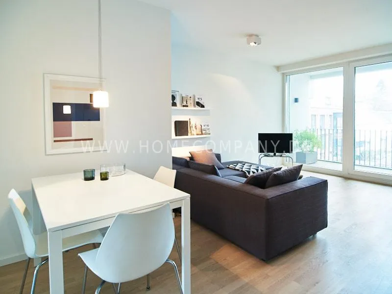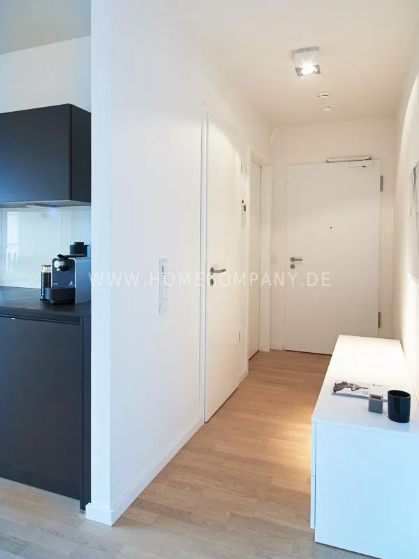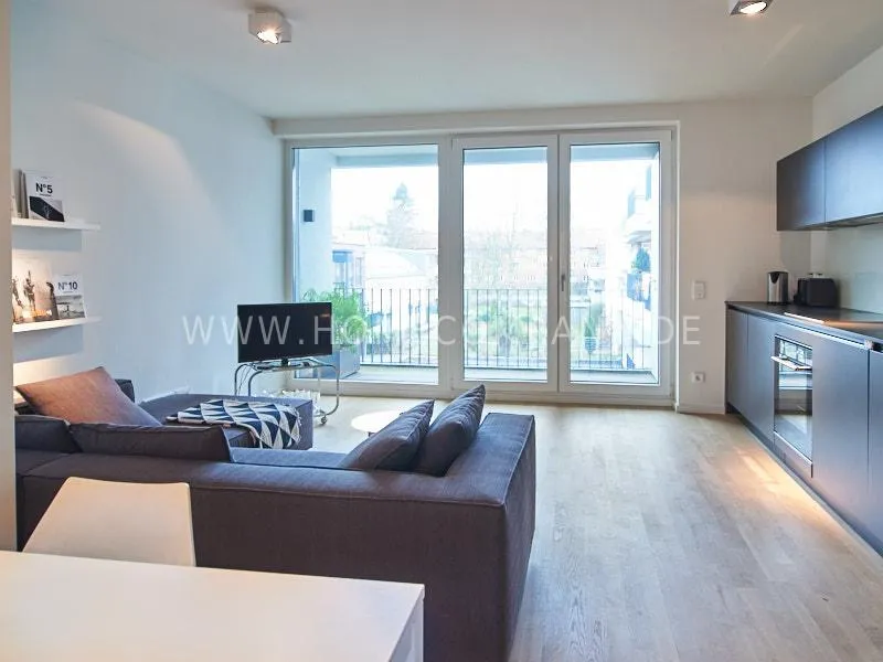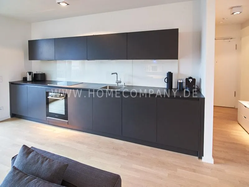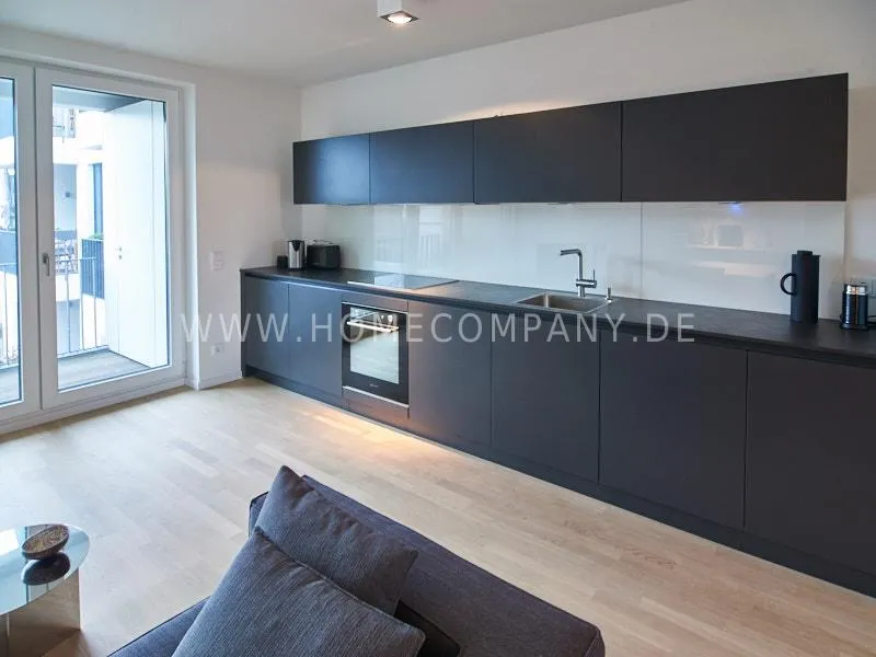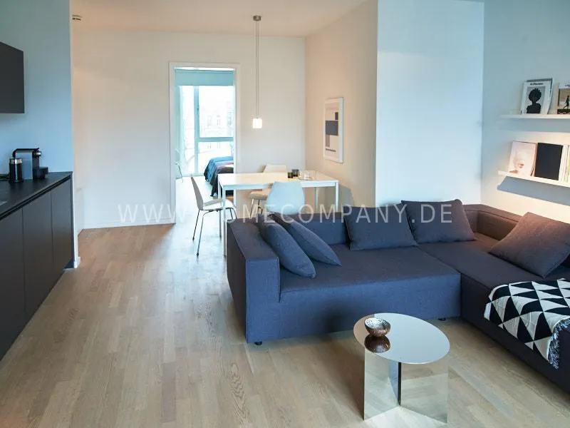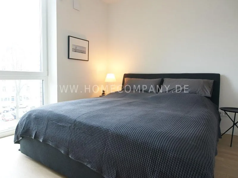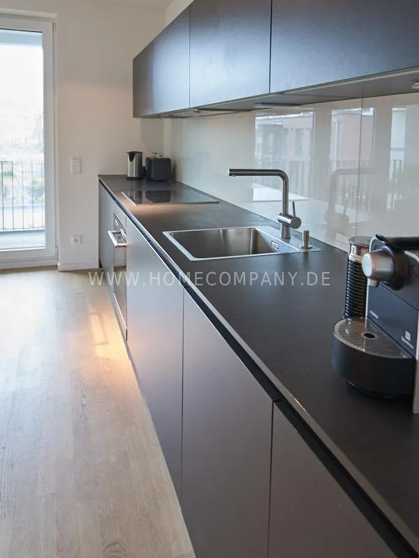 Stylish. Furnished and perfectly equipped apartment in a good location in a new building in Eimsbüttel. The open plan kitchen to the living room is decorated in modern brown and gray tones. In the living room, the large corner sofa invites you to relax after work. A dining table with four chairs is available Through the floor-to-ceiling windows, the living room is visually extended to the area of the adjacent large balcony. On summer evenings, this place invites you to barbecue with the electric grill. The bedroom is equipped with a 1.60 wide double bed and plenty of closet space.