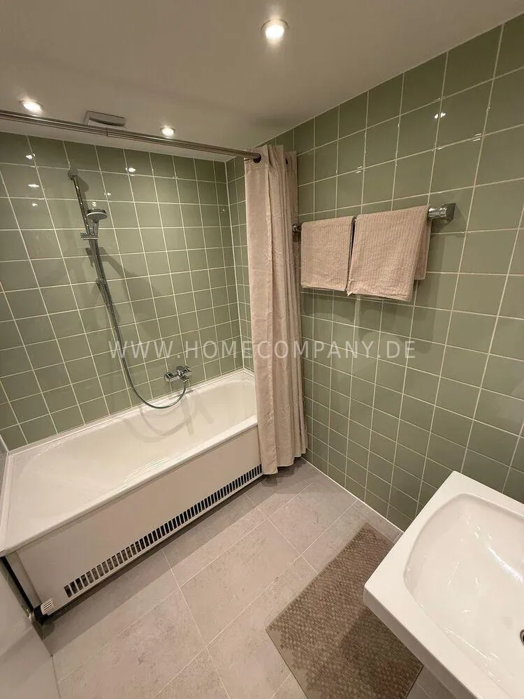 The bathroom is fitted with a shower-bathtub and premium Grohe fixtures.