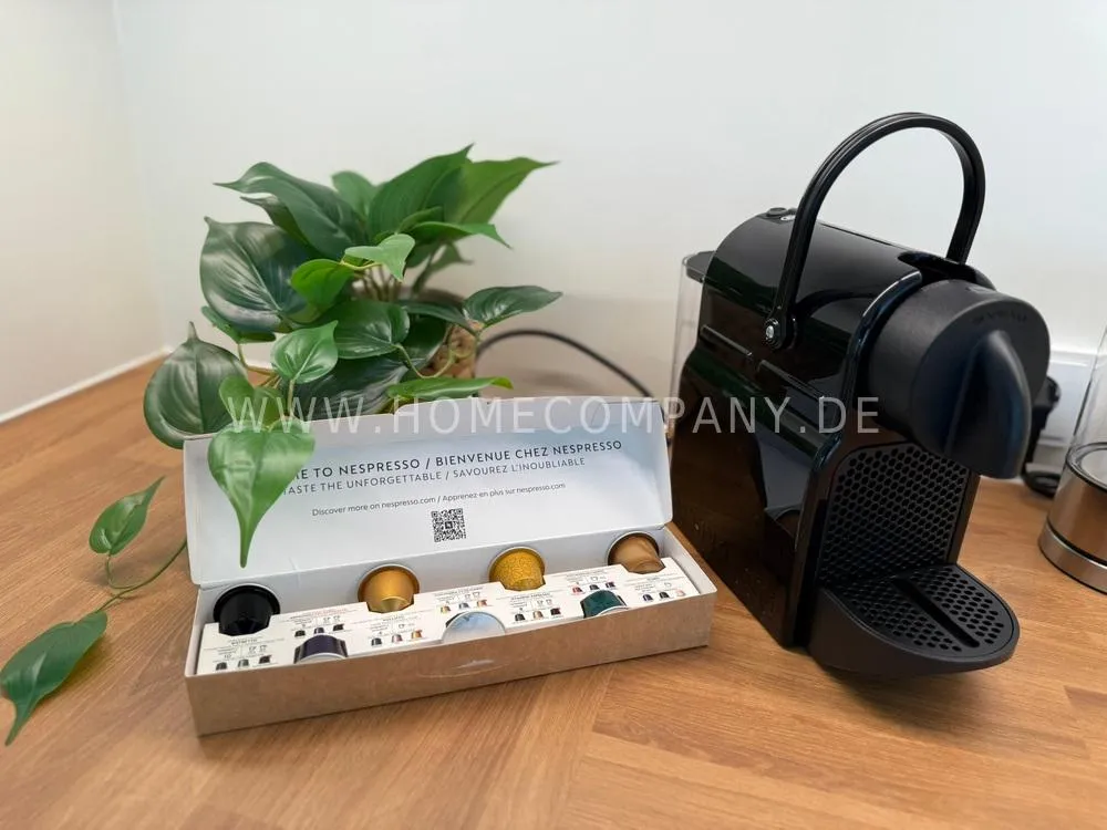 The modern living and sleeping area includes a solid wood bed (1.40 x 2.00 m), a 43" 4K Smart TV, and custom-built wardrobes. The open designer kitchen is fully equipped with a dishwasher, induction cooktop, oven, refrigerator, Nespresso machine, and a washer-dryer. High-speed fiber internet (500 Mbit/s) is included.