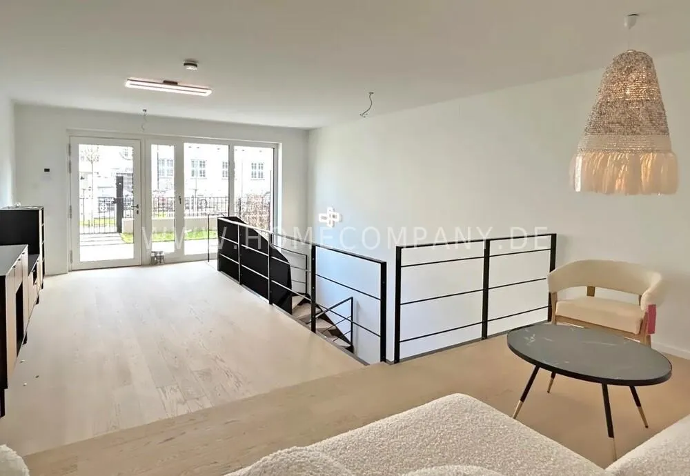 From the moment you enter the apartment, you're welcomed by a spacious living area with a comfortable TV lounge – the perfect place to arrive and unwind. An elegant staircase leads you to the open mezzanine level, featuring a high-end fitted kitchen and a stylish dining area. Here, functionality meets modern interior design – ideal for culinary evenings and social gatherings.