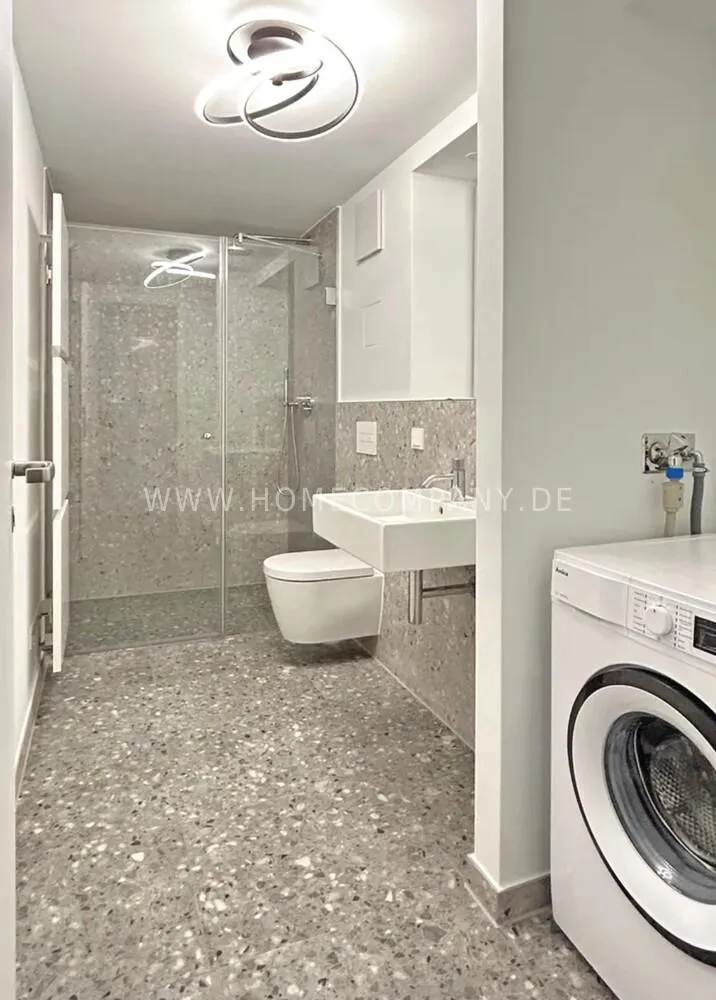 - Modern bathroom with walk-in shower and integrated washing machine