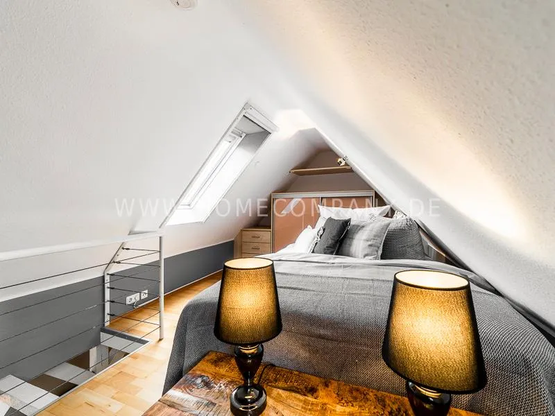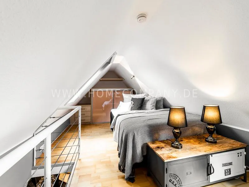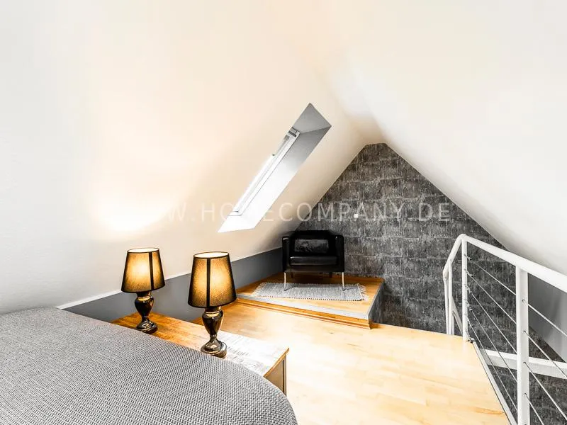 About a spiral staircase made of wood reaches the upper sleeping area. The bed measures 1.40 m x 2.00 m.