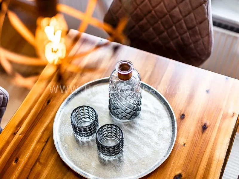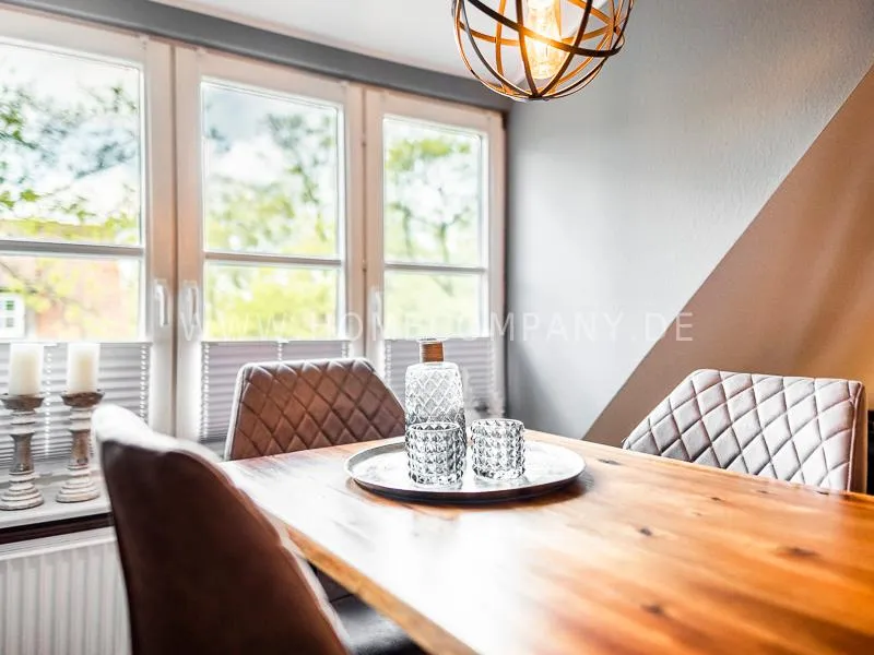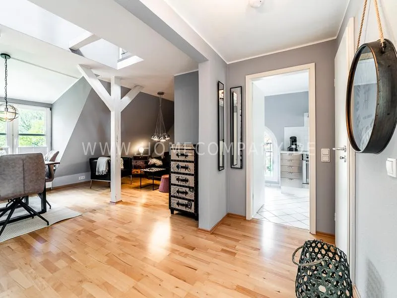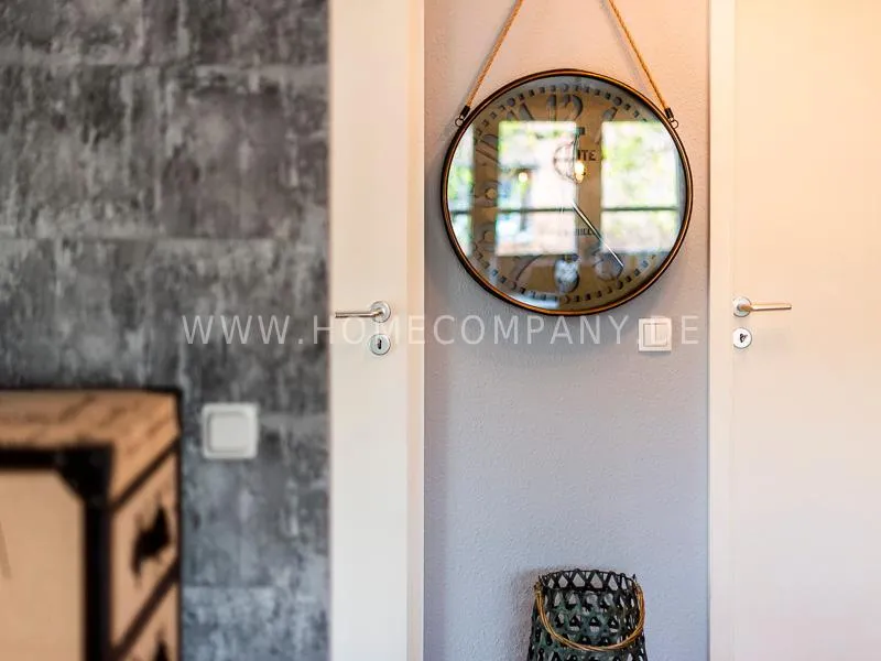 combined. A high-quality woolen carpet, shabby chic showcases in the living room and hallway, an acacia wood table, a cool kitchen ensemble complete the feel-good ambience.