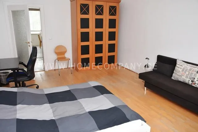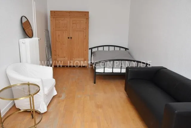 Living/bedroom 2 with armchair, sofa, side table, satellite TV bed 120x200 cm, shelf, chest of drawers, parquet floor, door to the bathroom, access to the