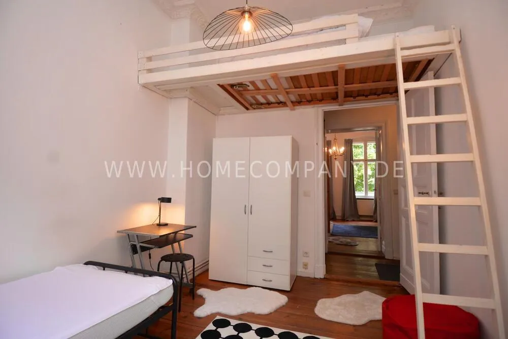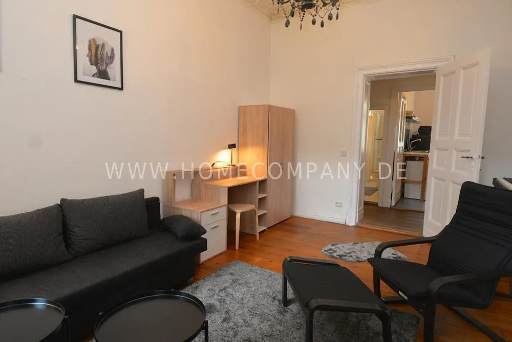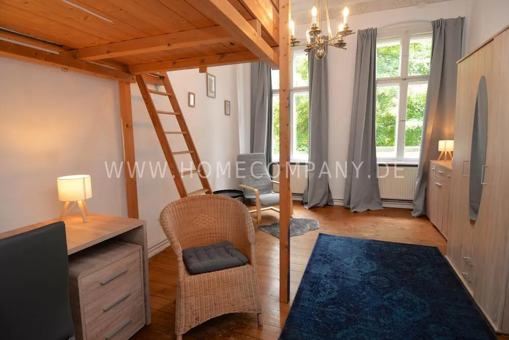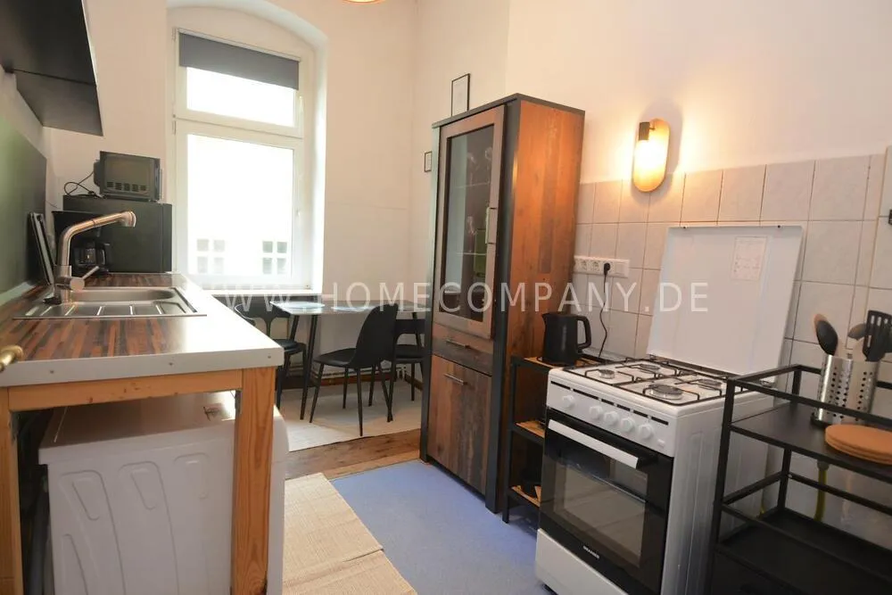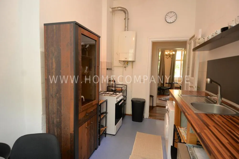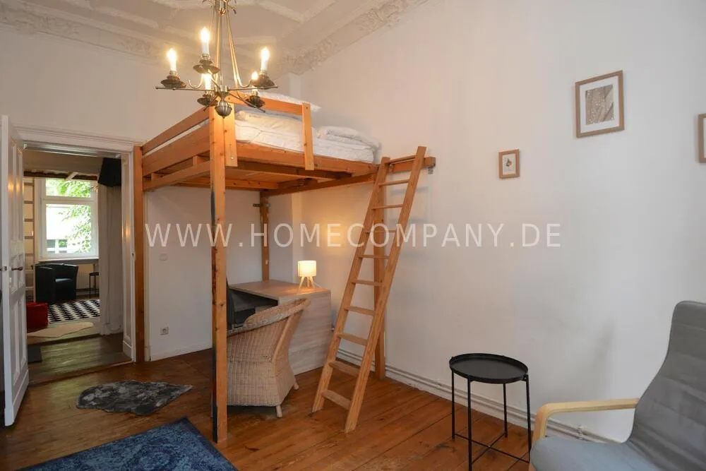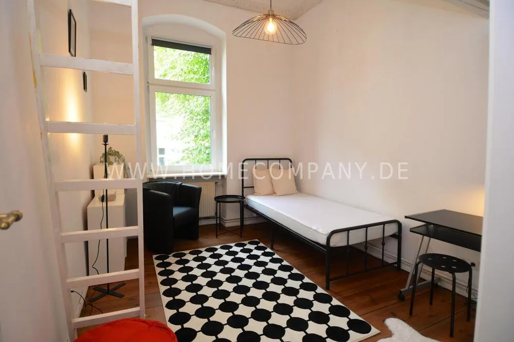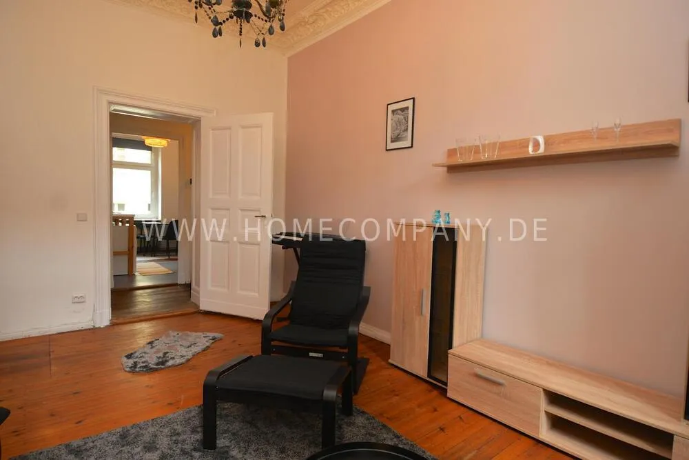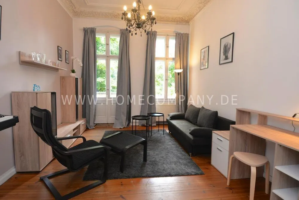 Fully furnished 3-room apartment in the heart of Prenzlauer Berg with a balcony, bathroom with shower, TV, and Wi-Fi. A bright living room with a sofa, desk, TV, and piano is available.