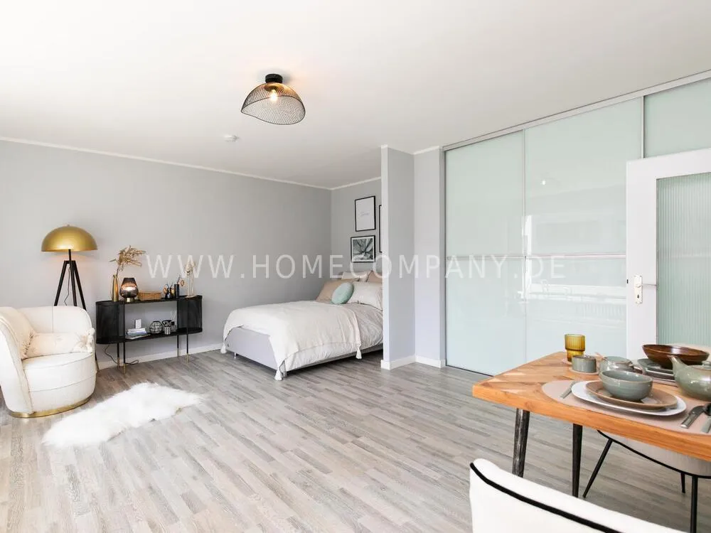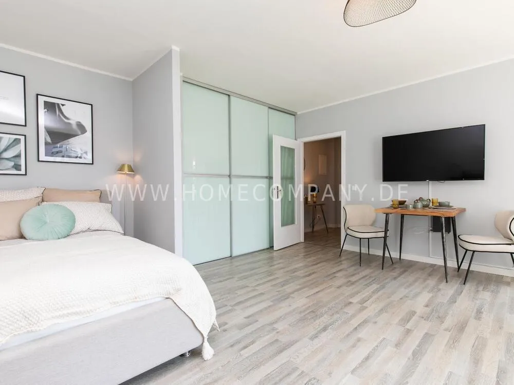 The bright apartment, which was completely refurbished in 2021, is central, yet quiet, right on Wohlerspark. In the living room / bedroom there is a 1.20 wide upholstered bed with a pocket spring mattress. A soft and very comfortable lounge chair with organically flowing shapes fits perfectly into the business living environment.